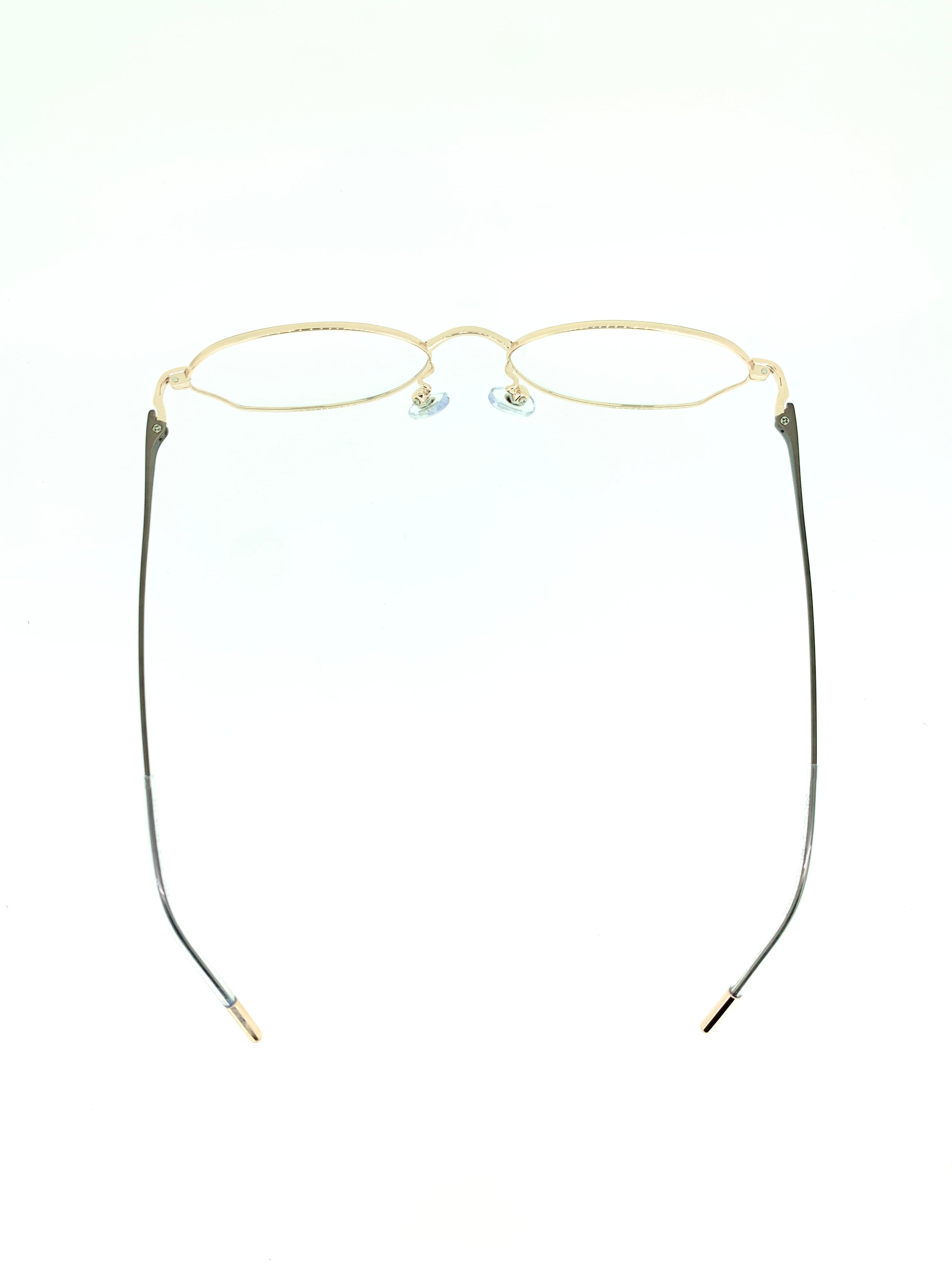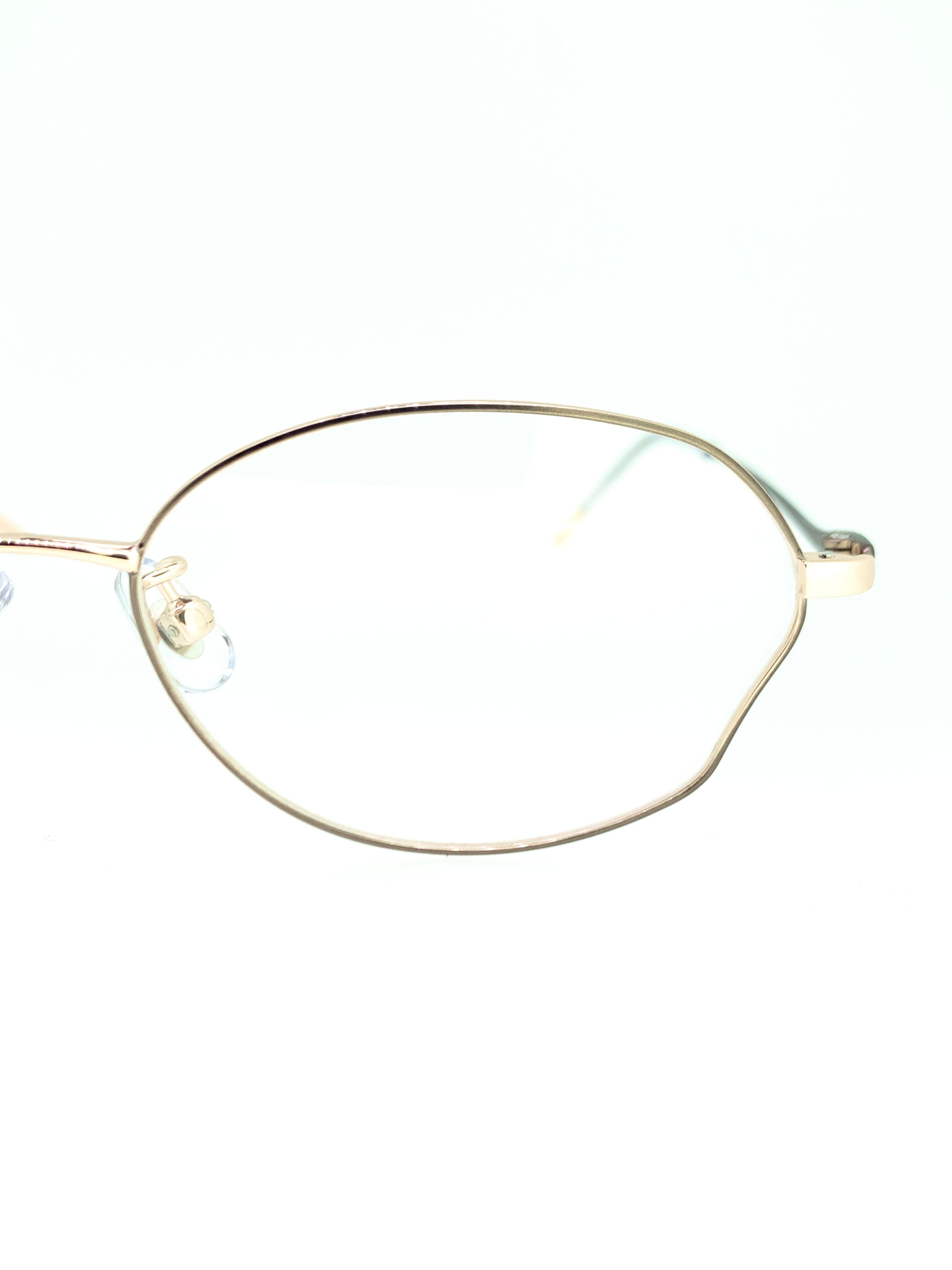 目尻の独特なカットが目を惹く変則ボストンシェイプに流動的なテンプルラインが綺麗なメタルフレーム。天地浅めなボストンシェイプと細身のメタルフレームが女性的なシルエットにまとまっています。装飾などのデザインは加えずに魅力的なシルエットにスポットをあてたシンプルなフレームワークとなっています。カラーはピンクゴールド×フォーンカラーを合わせた色気のある作品です。