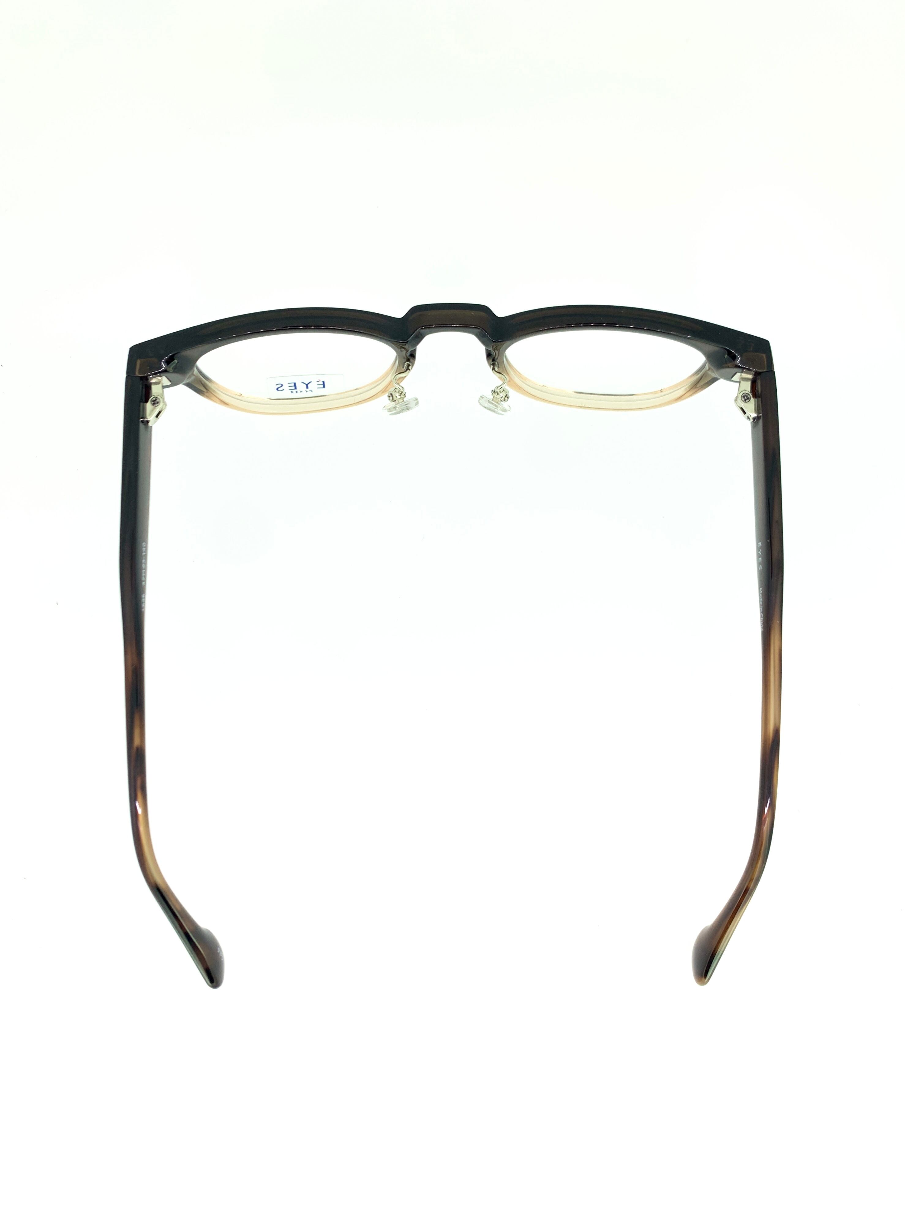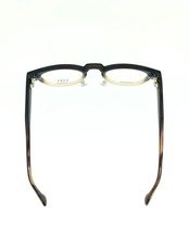 広めのキーホールブリッジにボスリントンシェイプのフロントデザインがレトロさとモダンな雰囲気を併せ持つセルフレーム。落ち着いた印象のブラウンカラーのグラデーションデザインのフロントに対して、薄っすらとしたデミ柄テンプルの統一感がカジュアルでお洒落な作品です。レンズサイズは大きくも小さくもないほど良いサイズ感で、男女問わずかけられるウィメンズ仕様のバランスの取れたデザインとなっています。