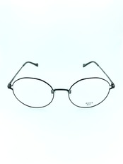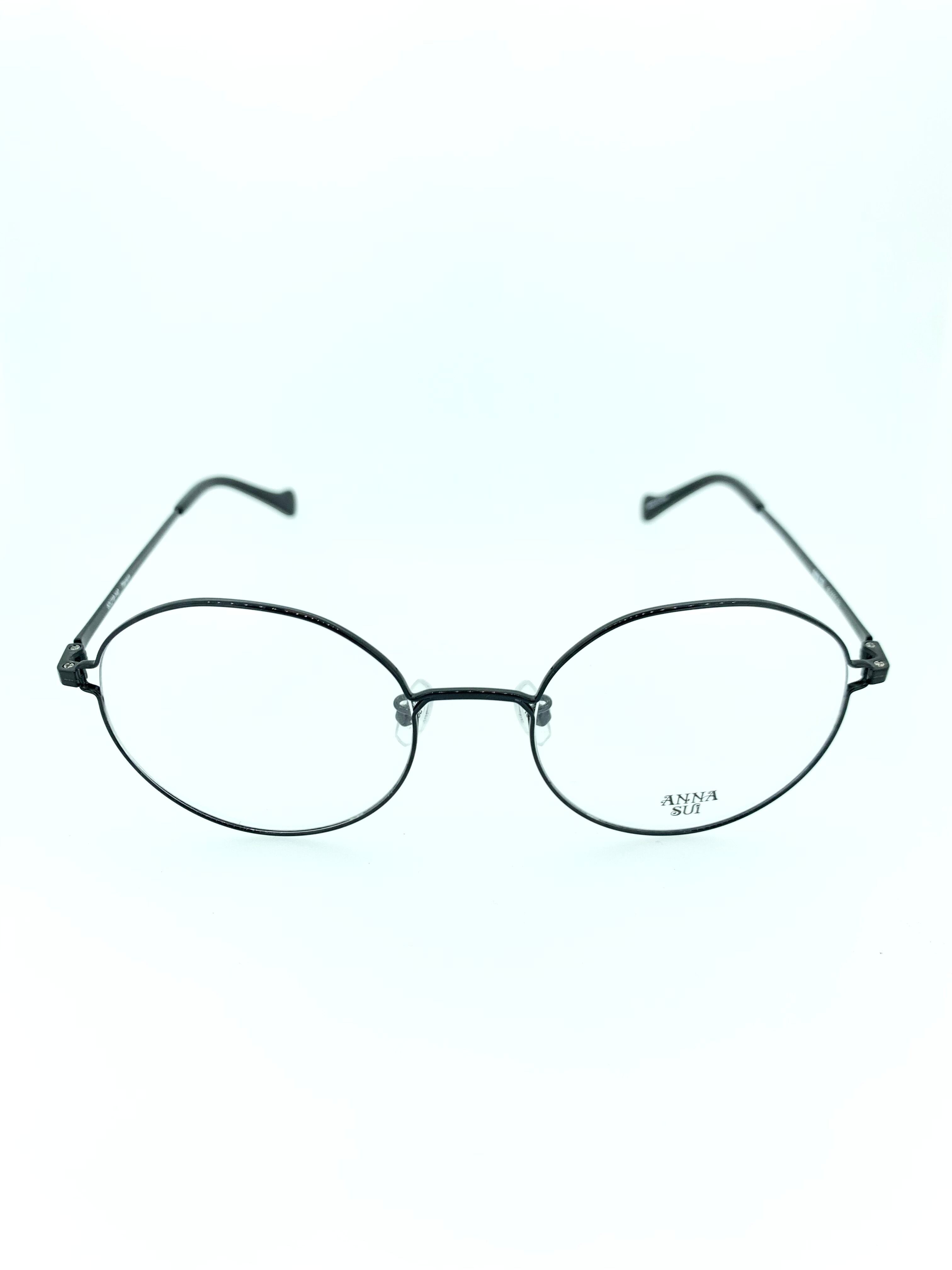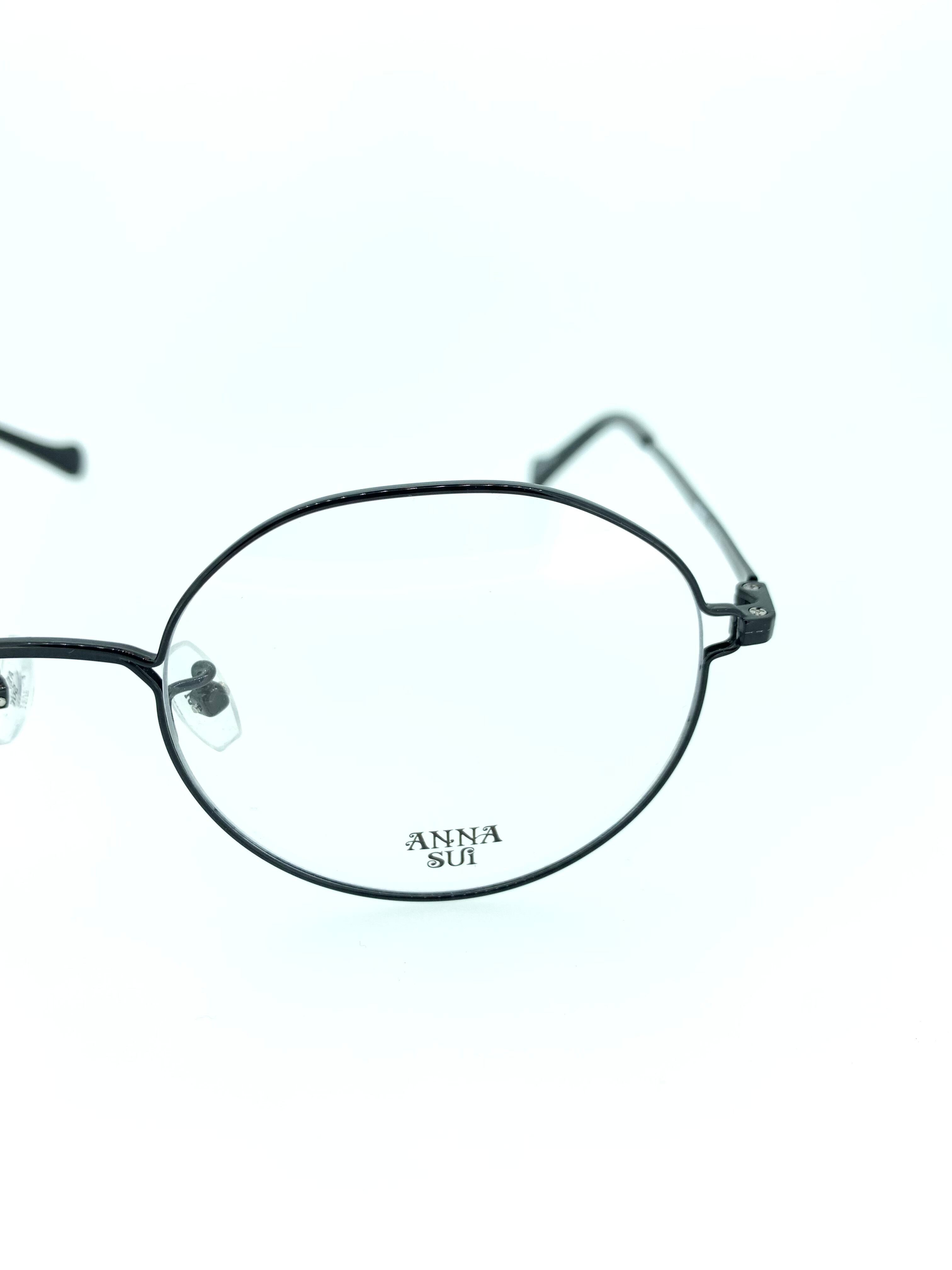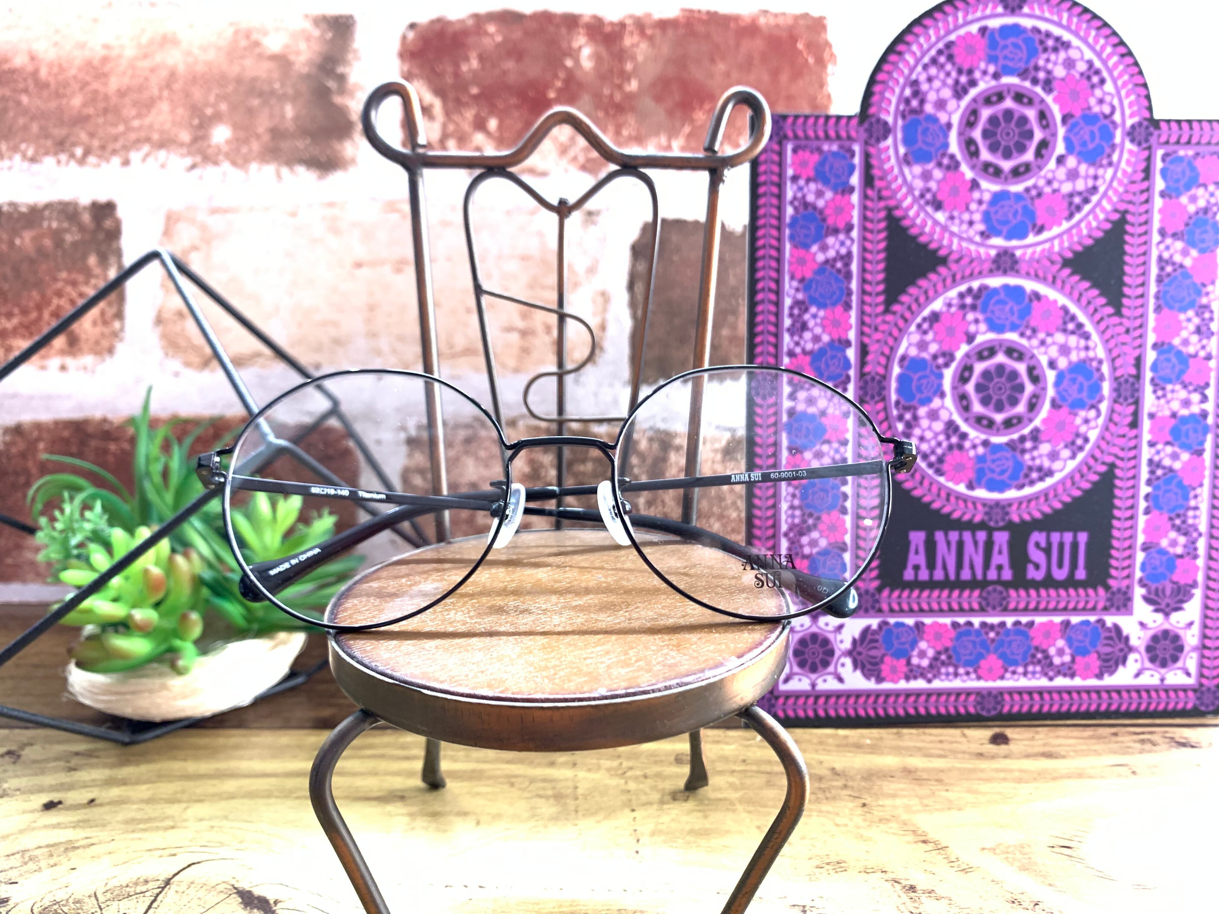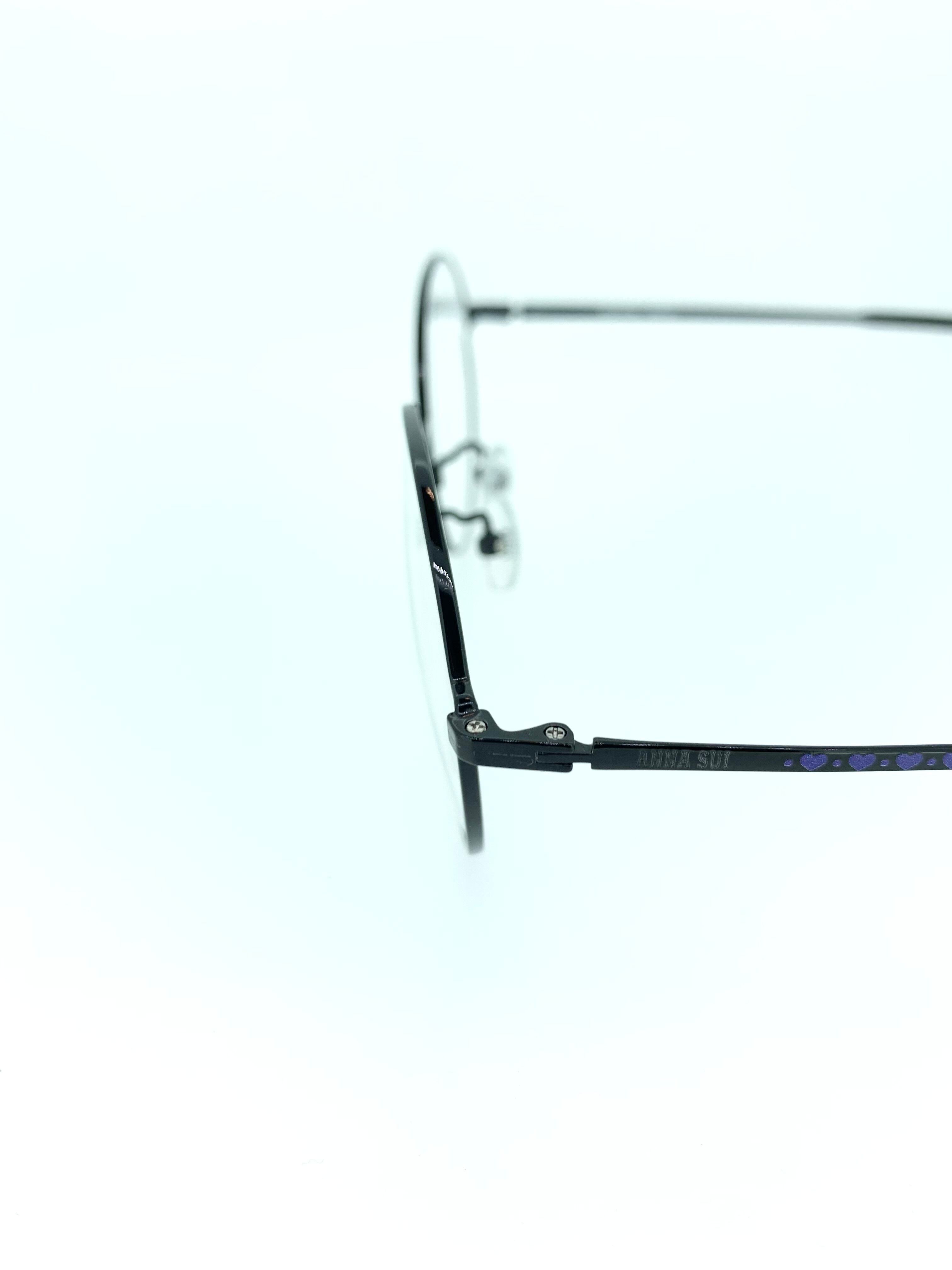 少しワイドなラウンドシェイプでシックなブラックカラーが知的でモード感溢れるメタルフレーム。目頭と目尻のリムはリムレスデザインになっていて、軽やかさとファッション性のある雰囲気になっています。テンプルにはANNA SUIのトレードカラーであるパープルのハートマークがあしらわれカッコ可愛いアパレルブランドならではの仕上がりとなりました。