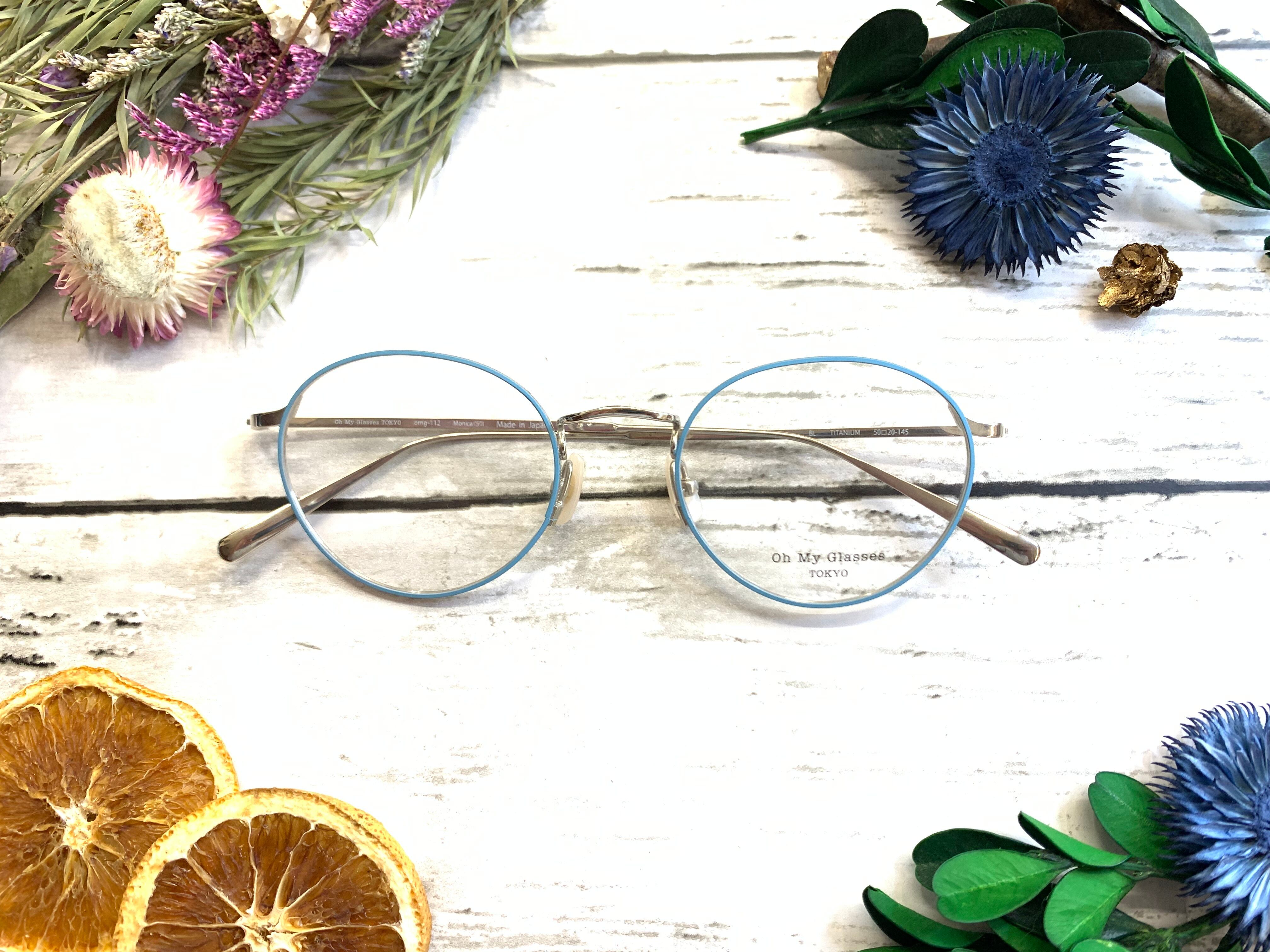 シルバーメタルにフロントリムの爽やかなホリゾンブルーが映えるラウンドシェイプのメタルフレーム。ヨロイ部分がリムのカーブに合わせるように下がった優しいシルエットが柔らかな印象を与えます。鼻パッドもコーラルカラーでナチュラルに揃え、先セル(耳当て)のないフルメタルテンプルが清廉な雰囲気でまとめられたお洒落な作品です。