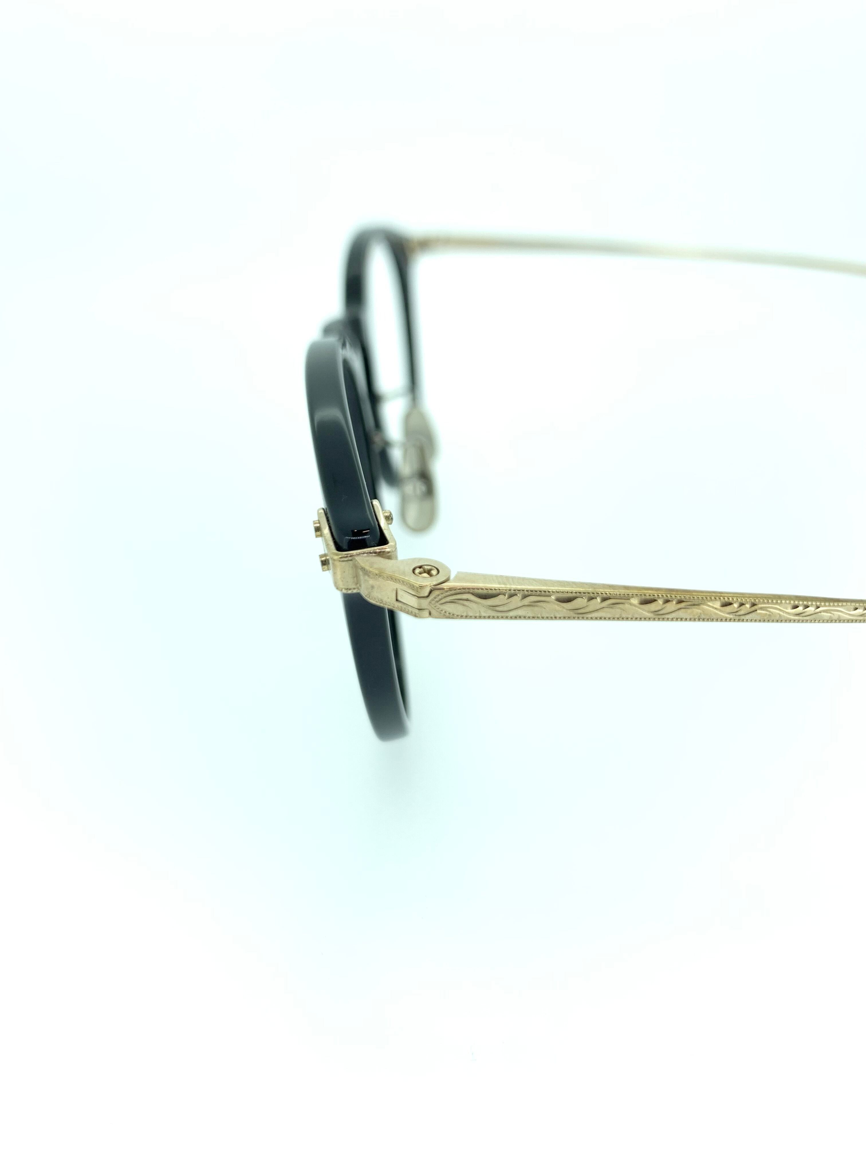 光沢のあるブラックフロントと高級感のあるゴールドメタルのハッキリとしたコントラストが綺麗なコンビネーションフレーム。ブリッジまでセル地のボストンシェイプは、スタイリッシュの中に少しのカジュアルさがありかけやすいデザインになっています。テンプルに装飾された細かい模様も細部までこだわったお洒落な作品です。