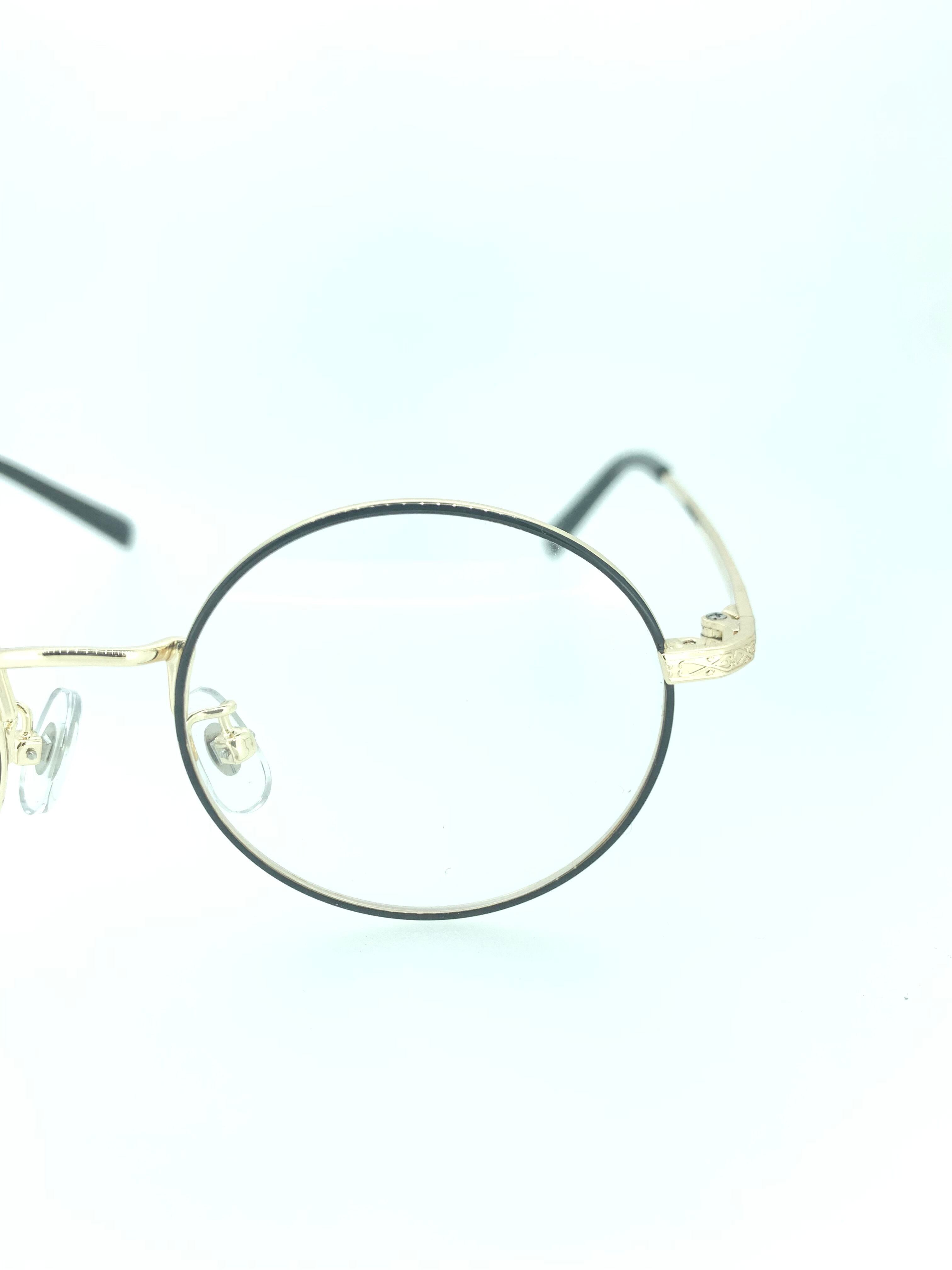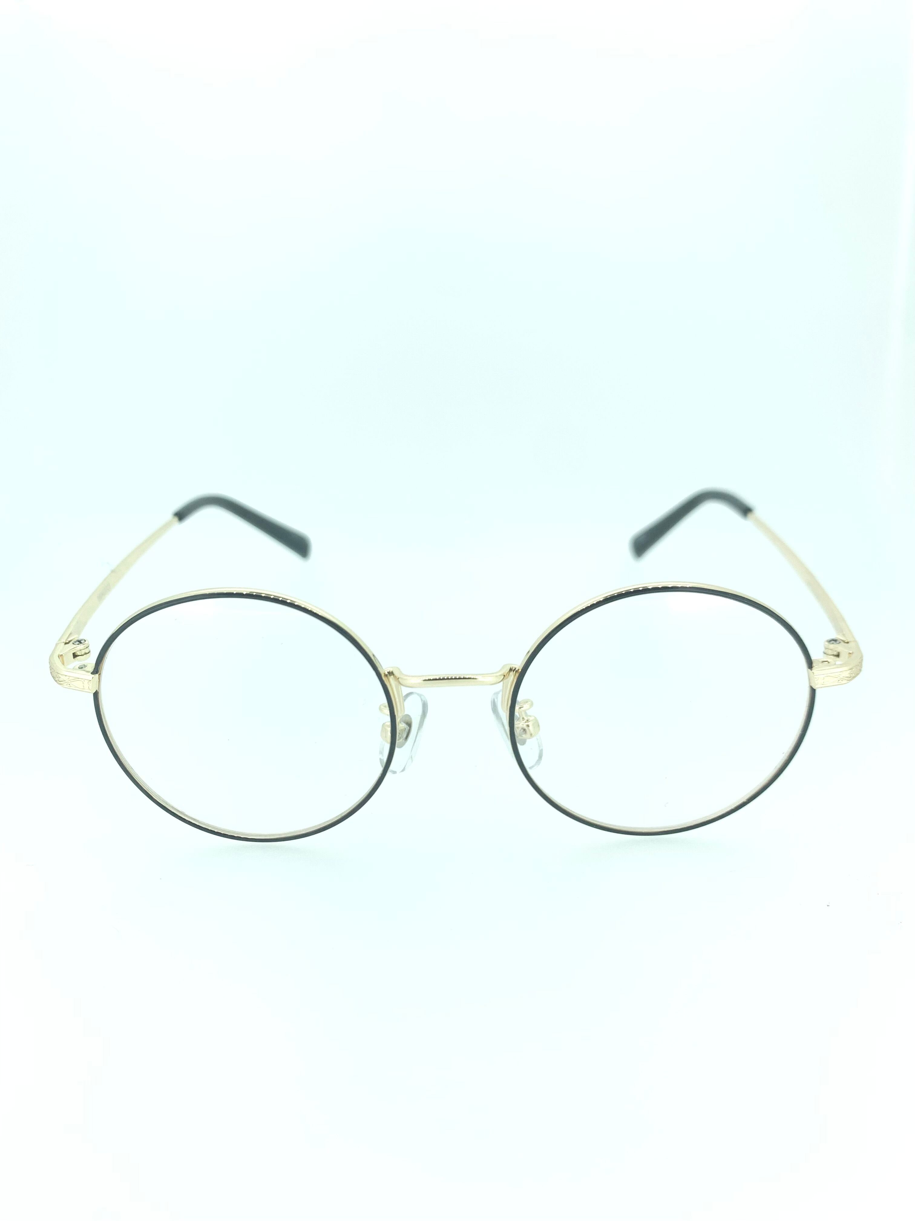 失敗しないゴールド×ブラックのカラーリングに知的でお洒落な雰囲気を作れるラウンドシェイプを合わせたメタルフレーム。イエローゴールドの煌びやかさとラウンドシェイプのユル感が絶妙なバランスで魅力的な作品です。テンプルには繊細な装飾が施されていて、ロープライスには見えない丁寧な仕上がりとなっています。