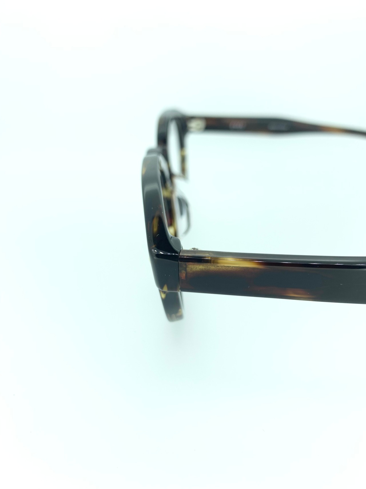 目尻が下がった特徴的なシェイプが柔らかいボストンシェイプのセルフレーム。少し肉厚に作られたササ柄っぽいブラウンデミのカラーがシックでカジュアルな雰囲気で、どんな方でも馴染む優秀なカラーリングとシルエットになっています。ファッションにもシーンにも合わせやすく、1本あるだけで様々なシーンにマッチするおすすめの作品です。