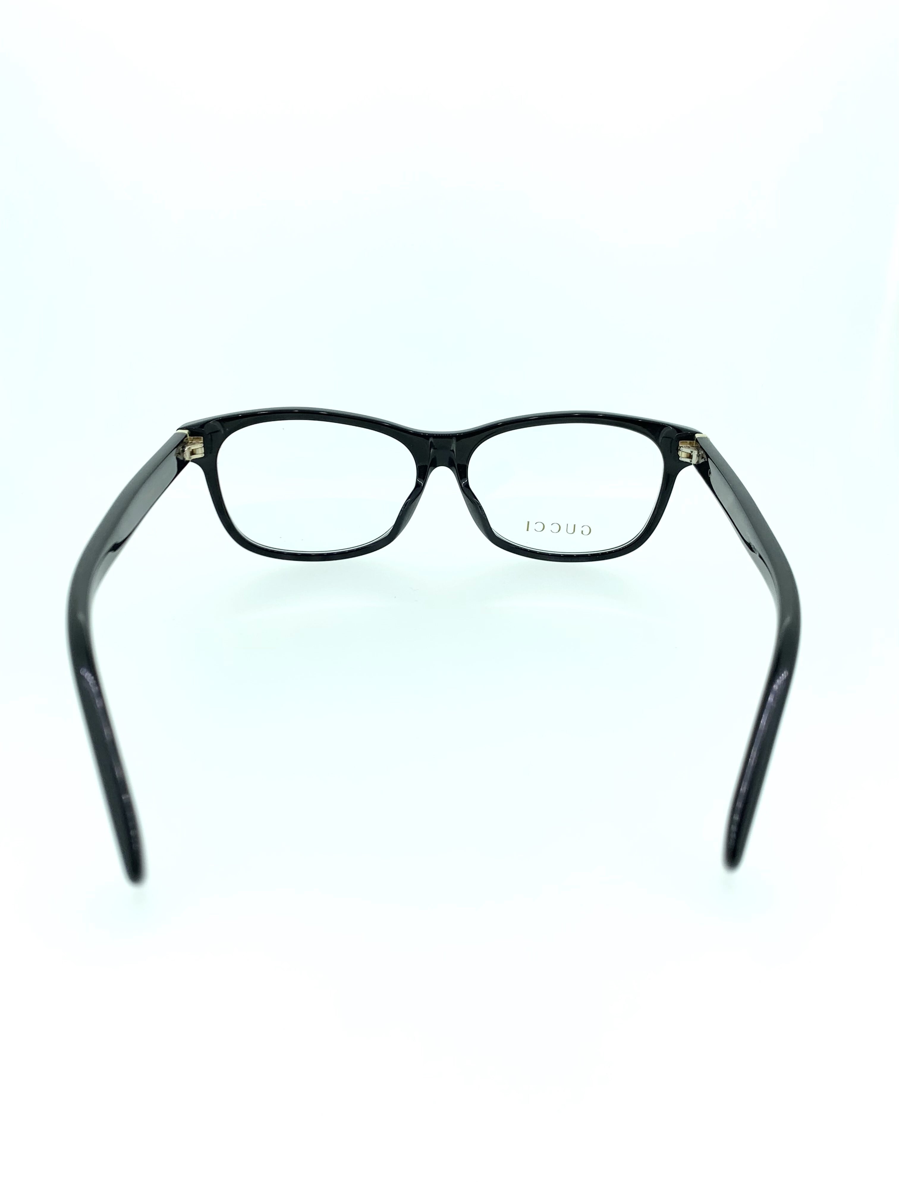 天地が少し浅めなウエリントンシェイプの洗練されたフロントラインが美しく、全体のカラーリングをブラックで統一したスタイリッシュな作品。テンプルに輝くGUCCIのロゴと先セル(耳当て)先端にあしらわれた蜂のマークがGUCCIらしいハイセンスにまとまったお洒落なデザインになっています。丁番部分にも発祥のイタリア国旗のカラーリングがあしらわれ、細部までこだわりが詰まったデザイン性の高い作品です。
