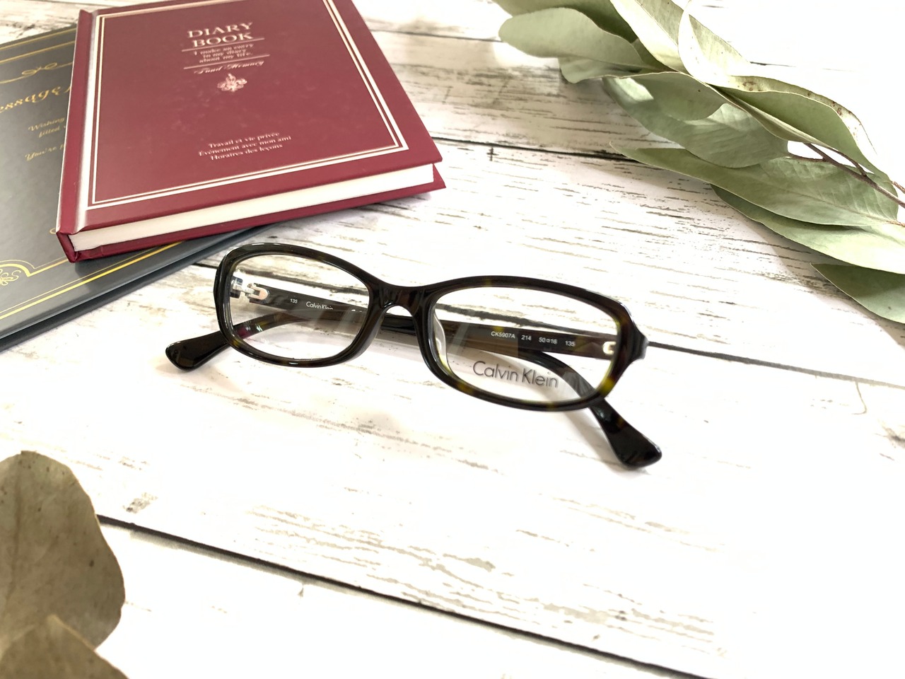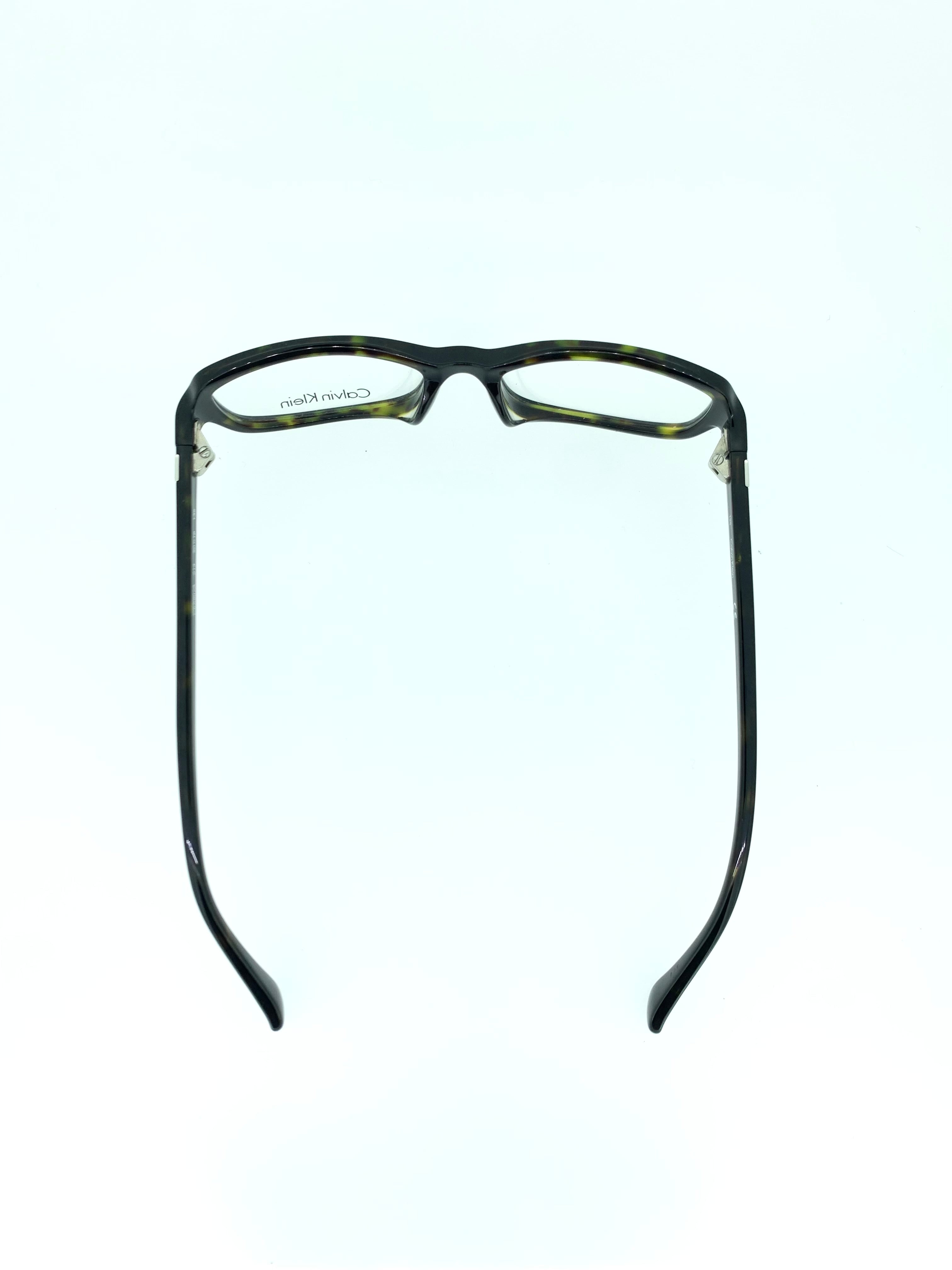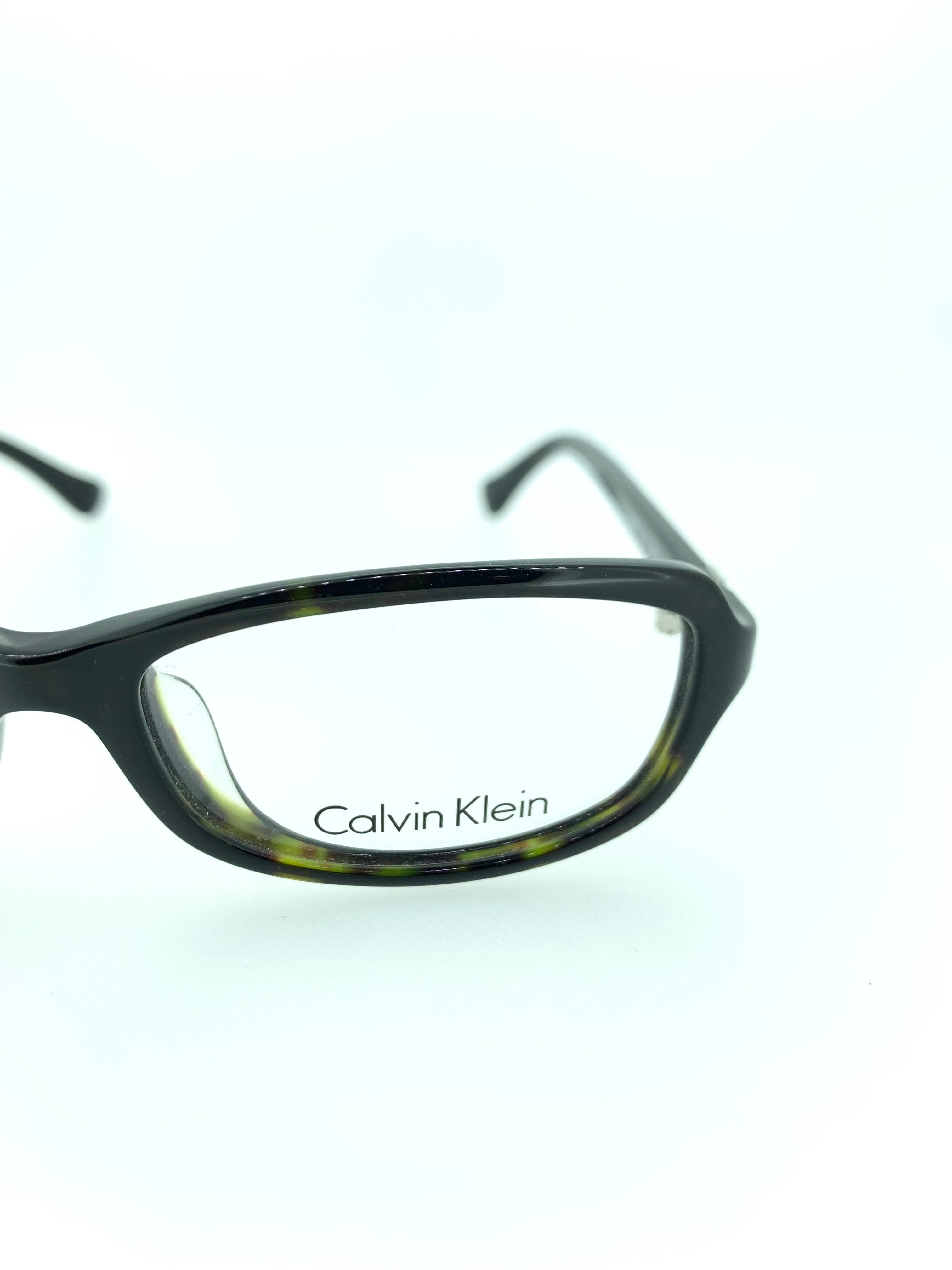 光に当たるとうっすら浮かび上がるシックなグリーン調のデミ柄フレームがスタイリッシュなスクエアシェイプのセルフレーム。暗めの色調なので一見シンプルなカラーリングに見えるが、角度によってデミ柄が浮かび上がるお洒落なカラーリングとなっています。テンプルに刻まれたCKのロゴがシンプルなお洒落さでCALVIN KLEINらしい作品です。