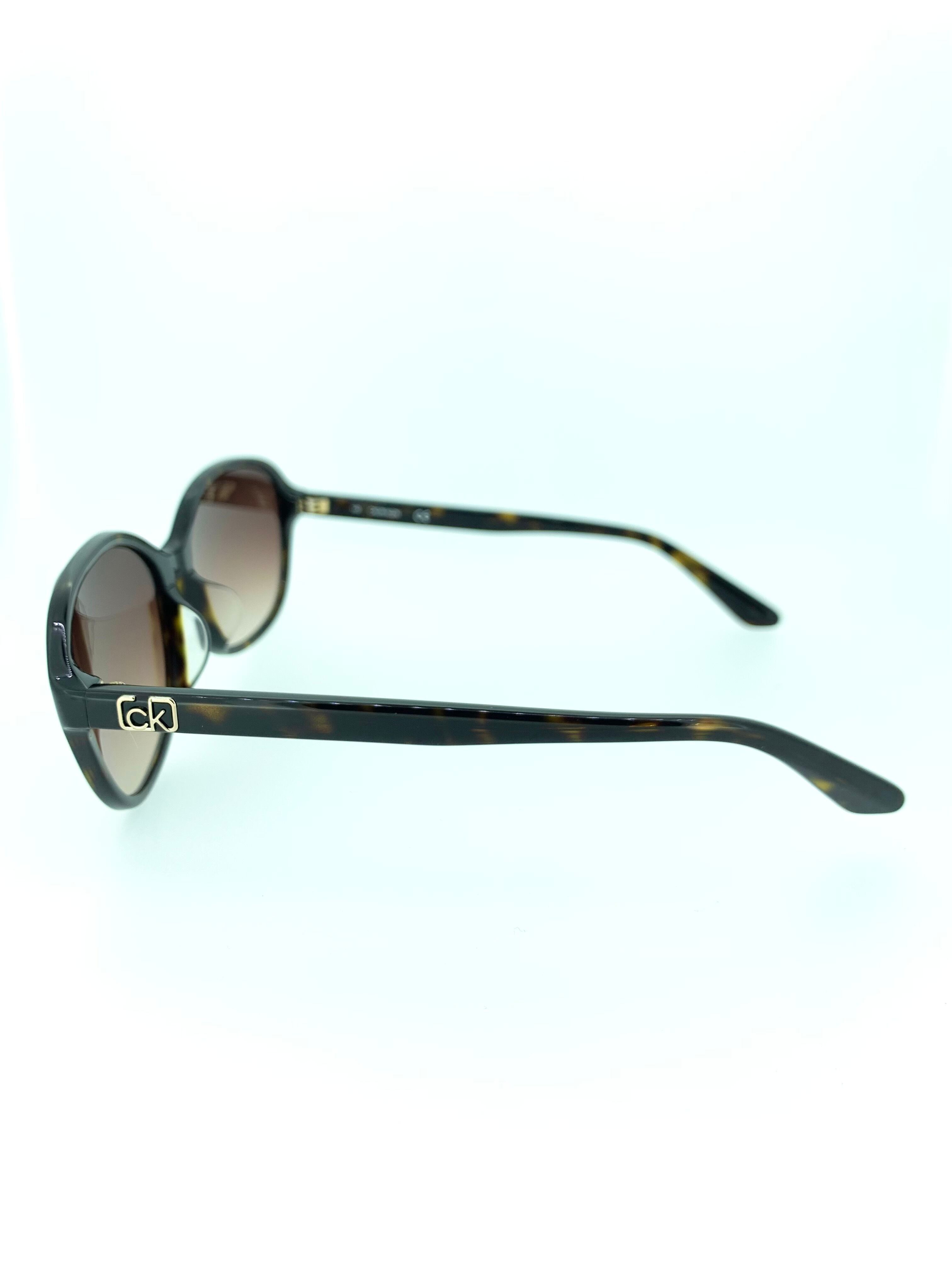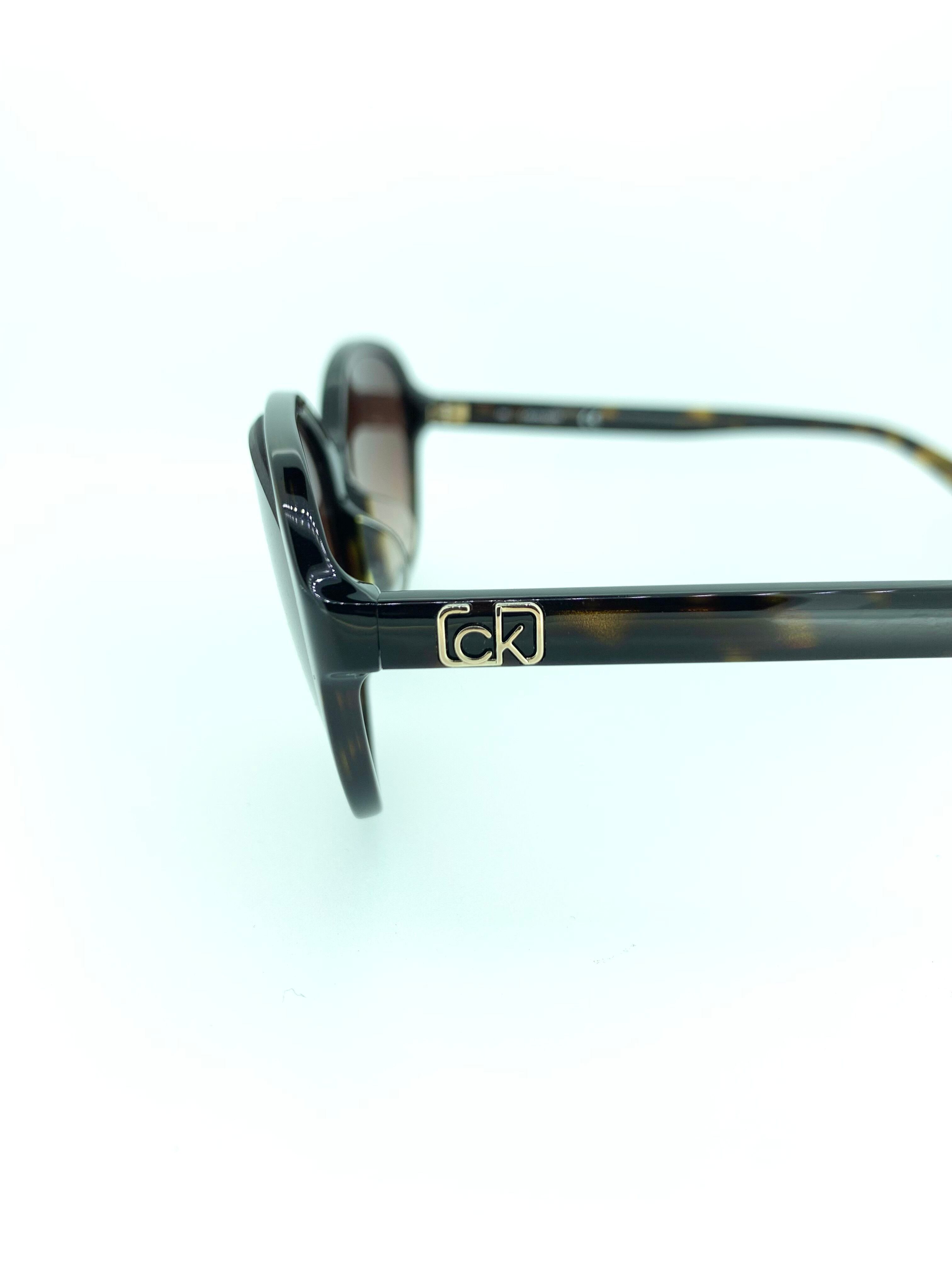 目尻に幅を持たせたワイドなオーバルシェイプに深みのあるブラウンデミがラグジュアリーな雰囲気を放つセルフレームのサングラス。フロントはブリッジとテンプルの高さを中央で合わせることで、モード感もある格好良いフレームワークとなっています。インパクトのあるフロントデザインを落ち着きのあるカラーリングでシックにまとめたCALVIN KLEINらしい作品です。