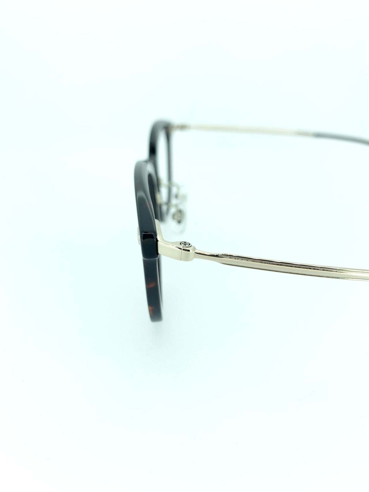 伝統的なオールドスタイルのウェリントンシェイプが清潔感のある印象のコンビネーションフレーム。深みがあり落ち着いたブラウンデミのフロントはシックな雰囲気を漂わせます。テンプルは細身メタルでスタイリッシュに演出し、ゴールド×ブラウンのカラーリングで上品にまとめ上げた造形の綺麗な作品です。