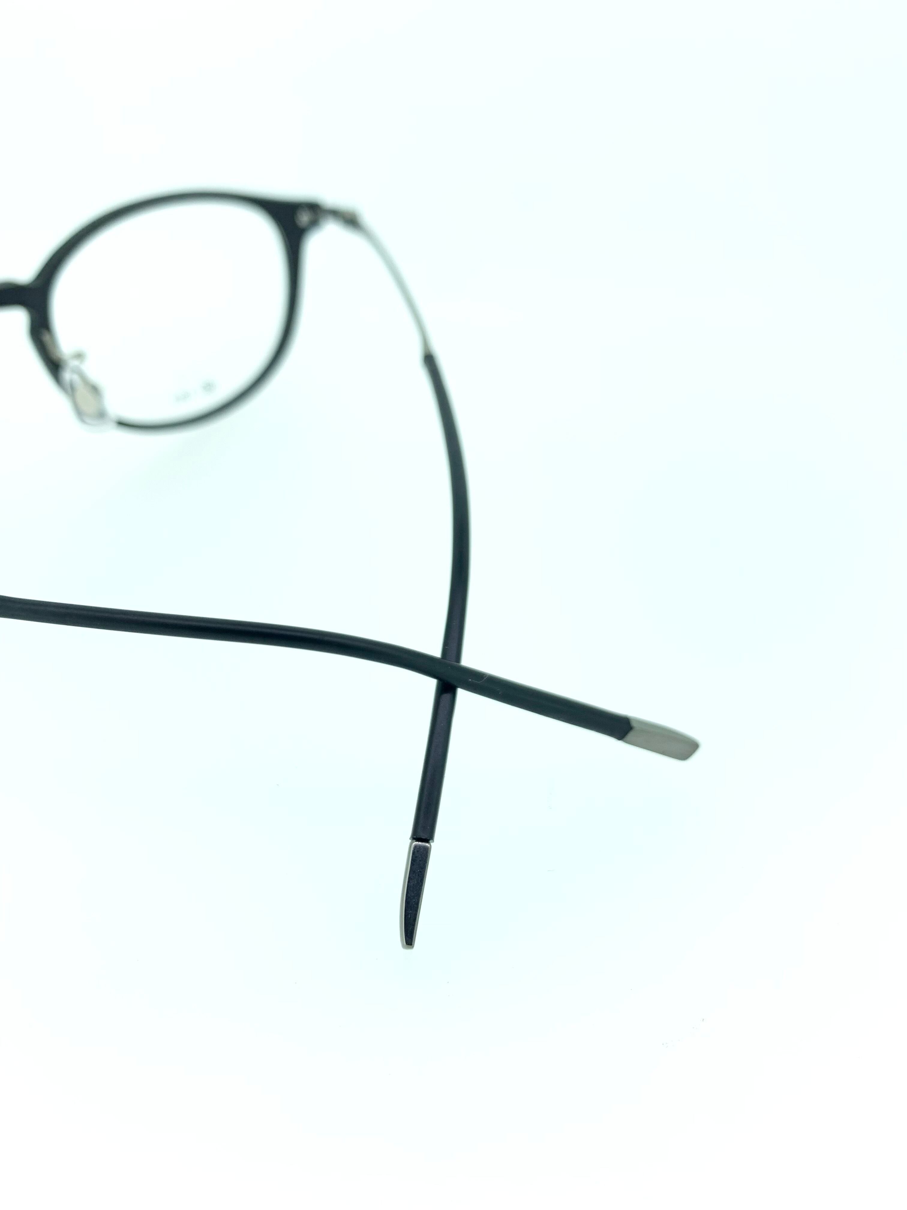 全体的に丸みのあるシルエットの抜け感が可愛いボストンシェイプのコンビネーションフレーム。シックな雰囲気のマットブラックのカラーリングがスタイリッシュで、どんなシーンにもかけられるお洒落なデザインとなっています。細身のメタルテンプルでスタイリッシュにまとめ、綺麗なシルエットとカラーリングがバランスの良い作品です。