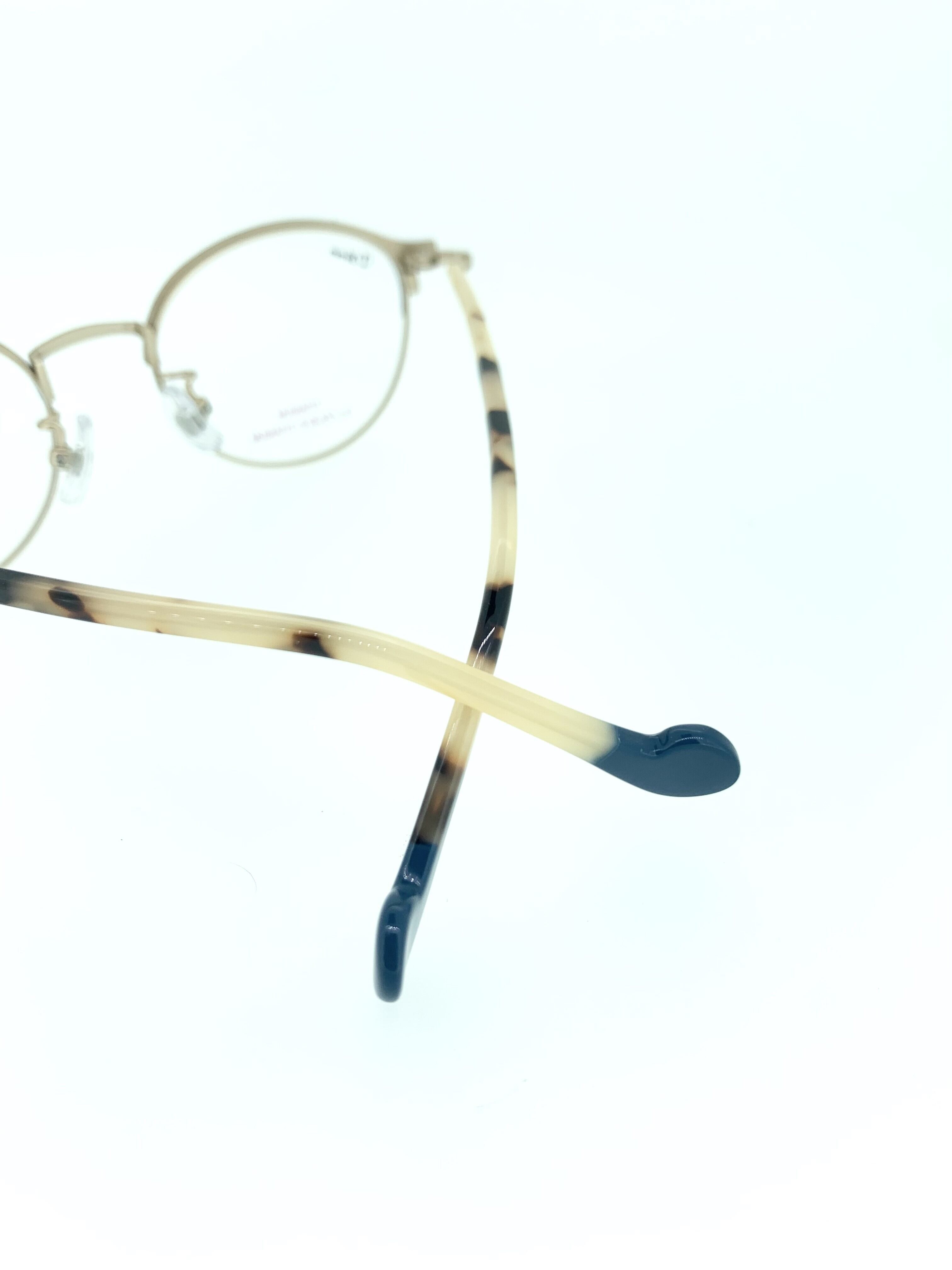 上品なゴールドメタルにマットなサックスブルーが映えるブローデザインのメタルフレーム。ラウンドに近い丸っとしたボストンシェイプにベージュベースのブチ柄を合わせエモーショナルな雰囲気にさせてくれます。相対的なカラーをナチュラルな色味で合わせることで、大人っぽさのあるお洒落な作品に仕上がりました。