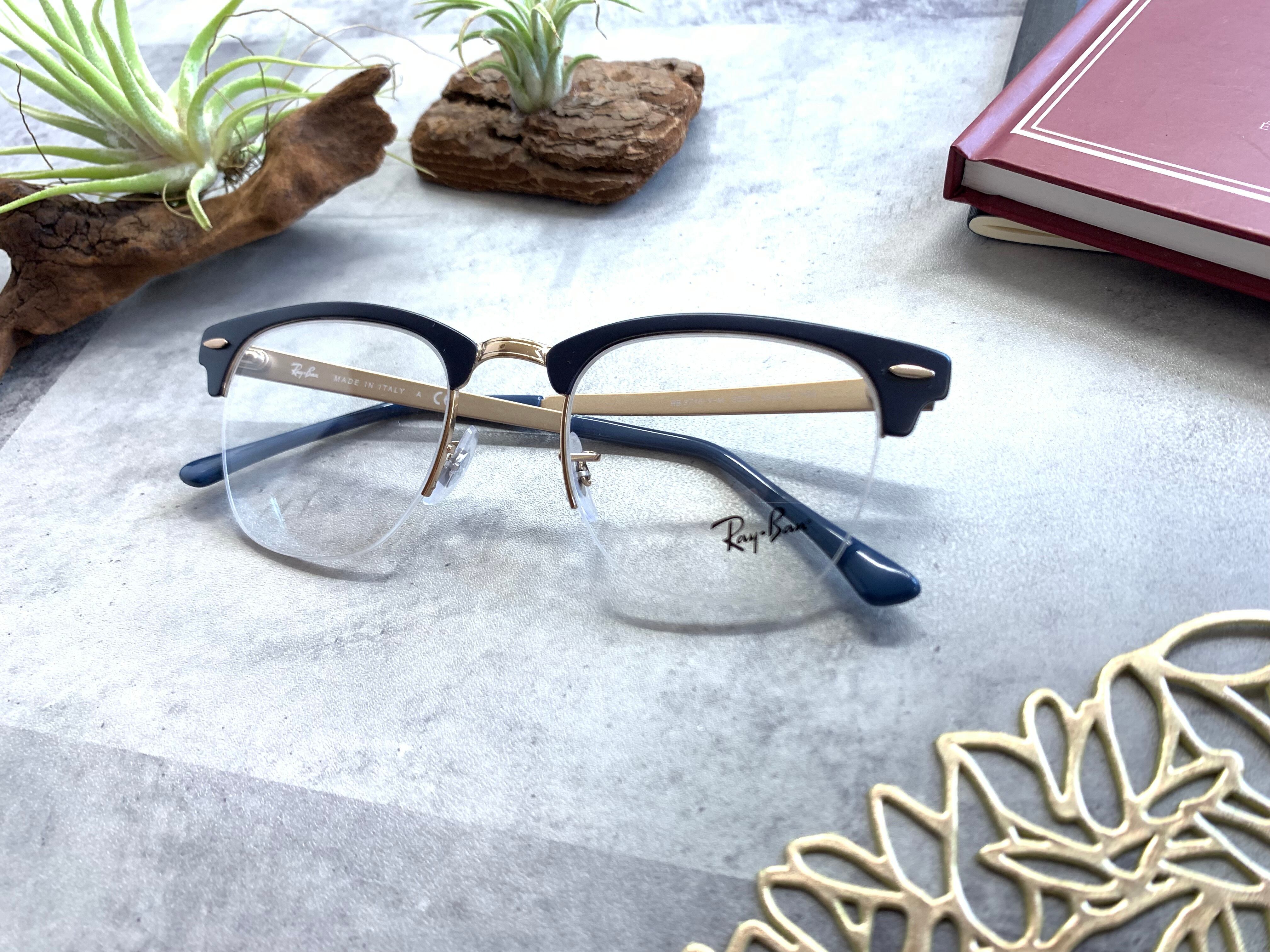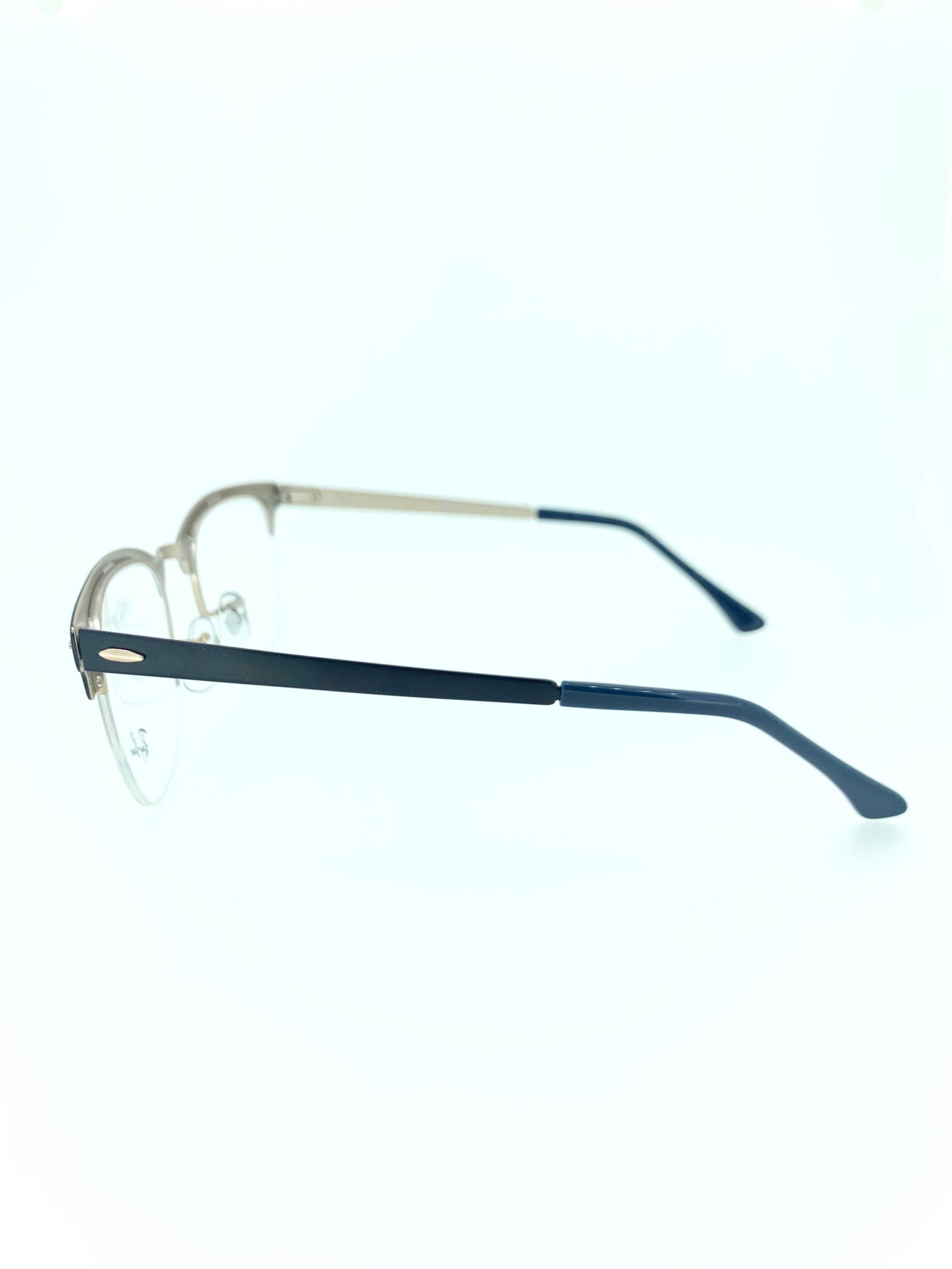 天地のしっかりとしたウェリントンシェイプのブローフロントで、アンダーリムの無いナイロールタイプでスッキリとしたデザインがお洒落な作品です。ブローとテンプルのネイビーブルーが、誠実で清潔感のあるカラーリングでスタイリッシュな雰囲気になっています。正方形に近いウェリントンシェイプはどこかクラシックでモダンなカラーリングと絶妙なバランスで調和しています。
