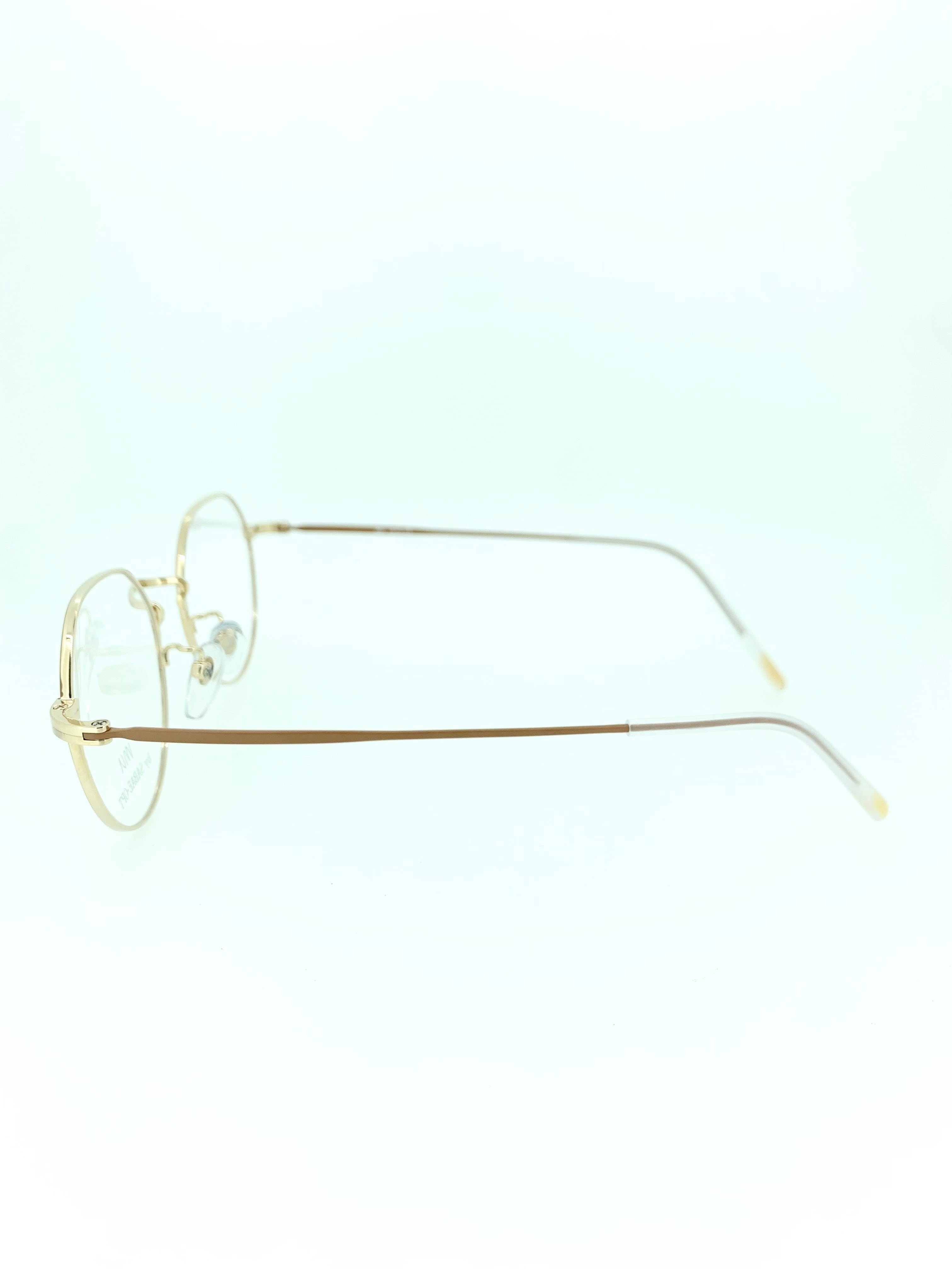 王冠のような上部リムのシェイプと丸みのある下部リムから名付けられたクラウンパントシェイプのメタルフレーム。丸みを残したシルエットで柔らかみを表現しつつ個性を発揮する特徴的なシェイプデザインはかけるだけでもお洒落な印象にさせてくれます。明るいイエローゴールドのメタルと淡いイエローを彩った先セル(耳当て)の色遊びが抜群の可愛さです。