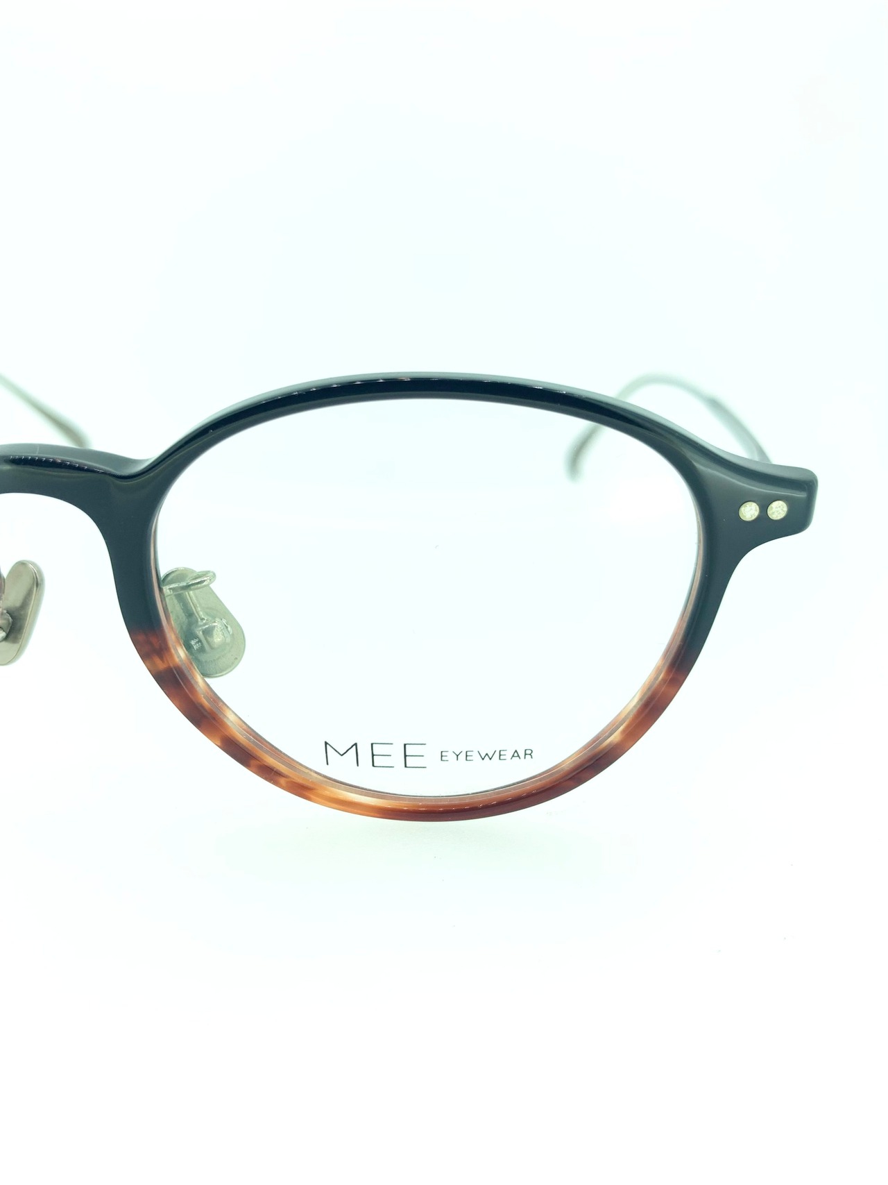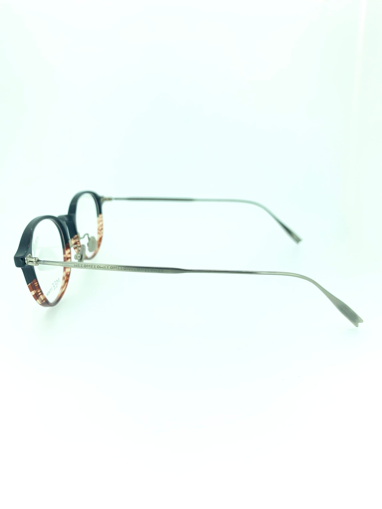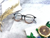 深みのあるアイアンブルーにブラウンササのバイカラーが抜群にお洒落なコンビネーションフレーム。フロントはブリッジまでセル生地になっていてしっかりと印象を残しつつ、テンプルを先端までのフルメタル仕様にすることでスタイリッシュに合わせています。フロントとのデザインバランスが絶妙に調整されたデザイン性の高さが窺える作品です。テンプル先端は二股になっていて細かいところまでセンスを感じる1本ですね。