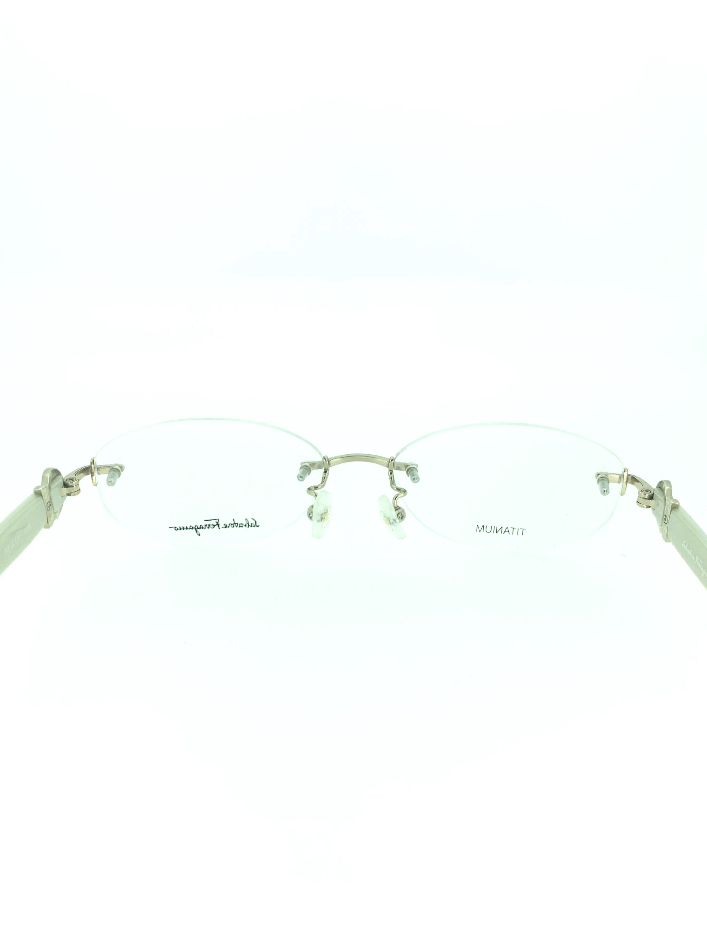 清潔感のあるマーブルホワイトにツーポイントフレームのスッキリとしたフロントデザインがお洒落な作品。テンプルを開くと馬蹄型のデザインがベルトのようになるテンプルデザインはイタリアブランドらしいファッション性を発揮しています。余計なデザインは加えずに洗練されたシルエットの綺麗さや高級感のあるカラーリングで魅せる大人の1本です。