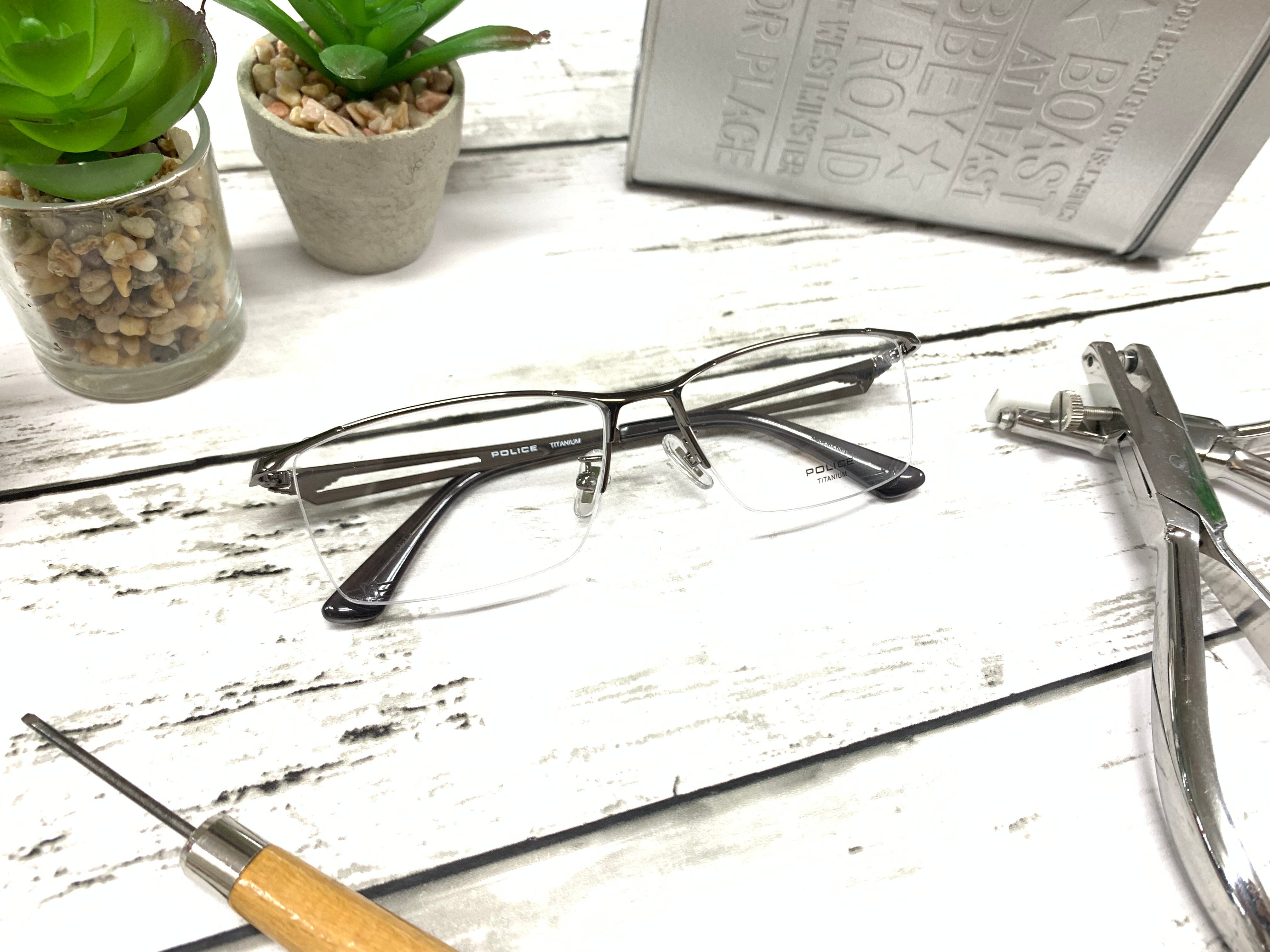 ストレートにスラっと伸びる上部リムに目尻にエッジの効いたスクエアシェイプのフロントデザインが格好良いナイロールフレーム。細身リムに薄さのあるテンプルを肉抜き加工することで、軽やかな装用感を実現した機能性も優れた作品です。見た目もメタルの重たい感じが無く、軽やかな印象に仕上げられています。丁番付近に施された翼を模したPOLICEのロゴデザインがワンポイントでお洒落なフレームですね。