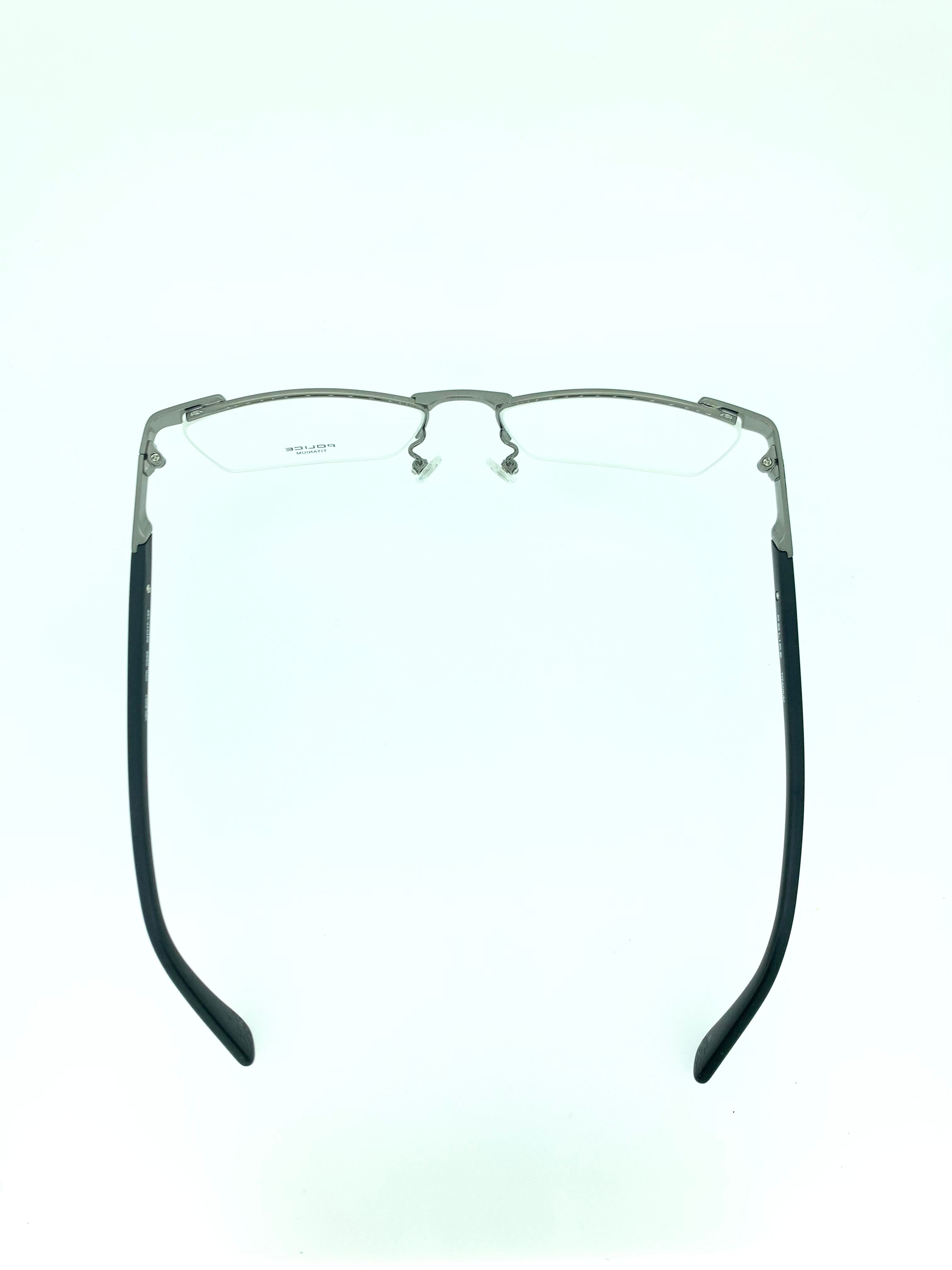 マットなネイビーとシルバーメタルの清潔感のある色合いがお洒落なナイロールフレーム。天地が広くウェリントンのようなカジュアルさのあるスクエアシェイプがシーンを選ばない優秀な作品です。セルテンプルで堅くなり過ぎない雰囲気も絶妙で、テンプルに施されたPOLICEの文字など細かなこだわりが魅力的な1本です。
