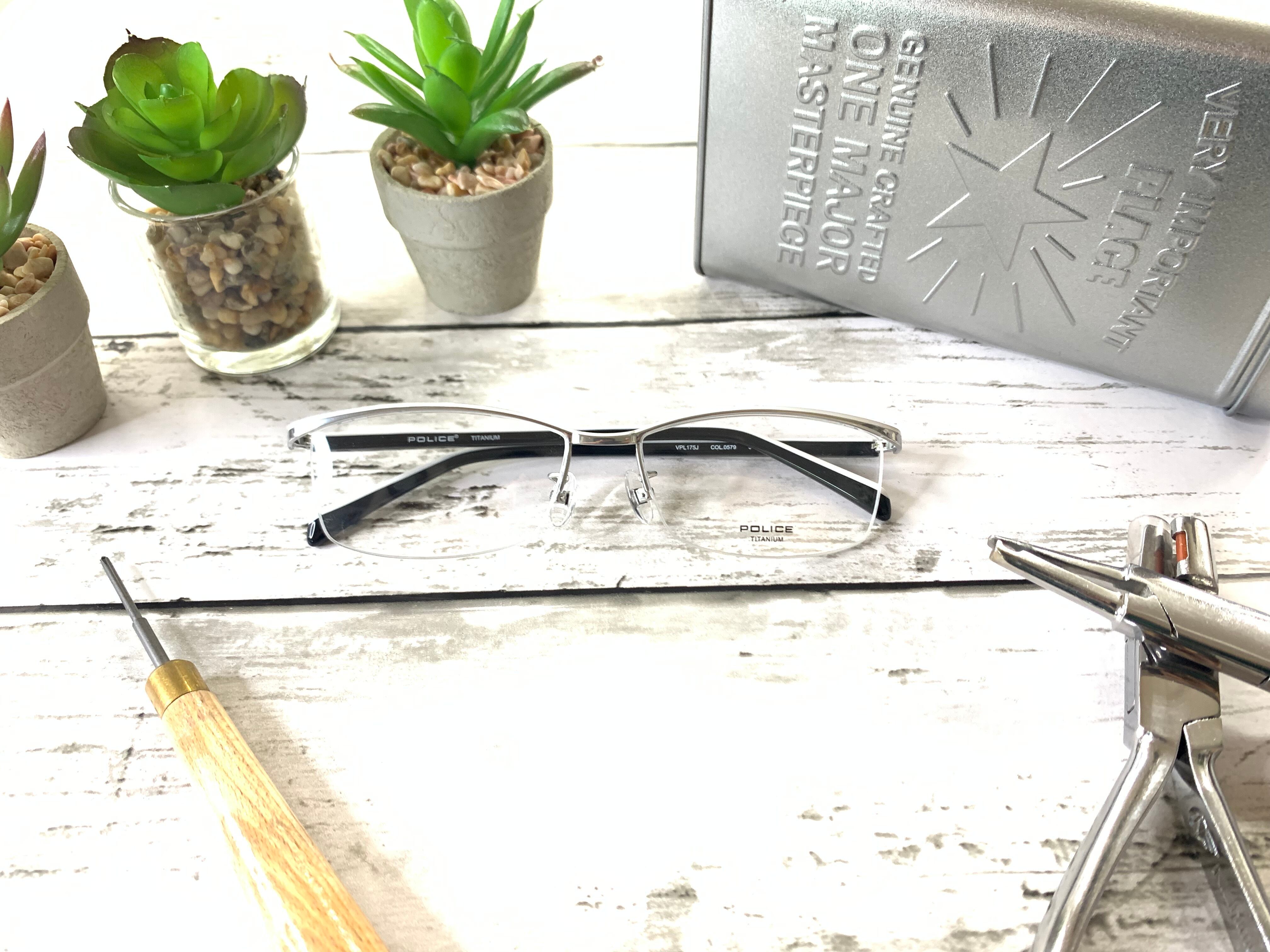 スラッと伸びる上部リムの美しいラインがシルバーメタルの清廉さとマッチした、スクエアシェイプのナイロールフレーム。テンプルはセル生地になっていて、ホワイト×ブラックのモノトーンカラーが清潔感のあるカラーリングになっています。細身のシルエットで統一されていて、POLICEのスタイリッシュなブランドイメージとマッチした作品です。
