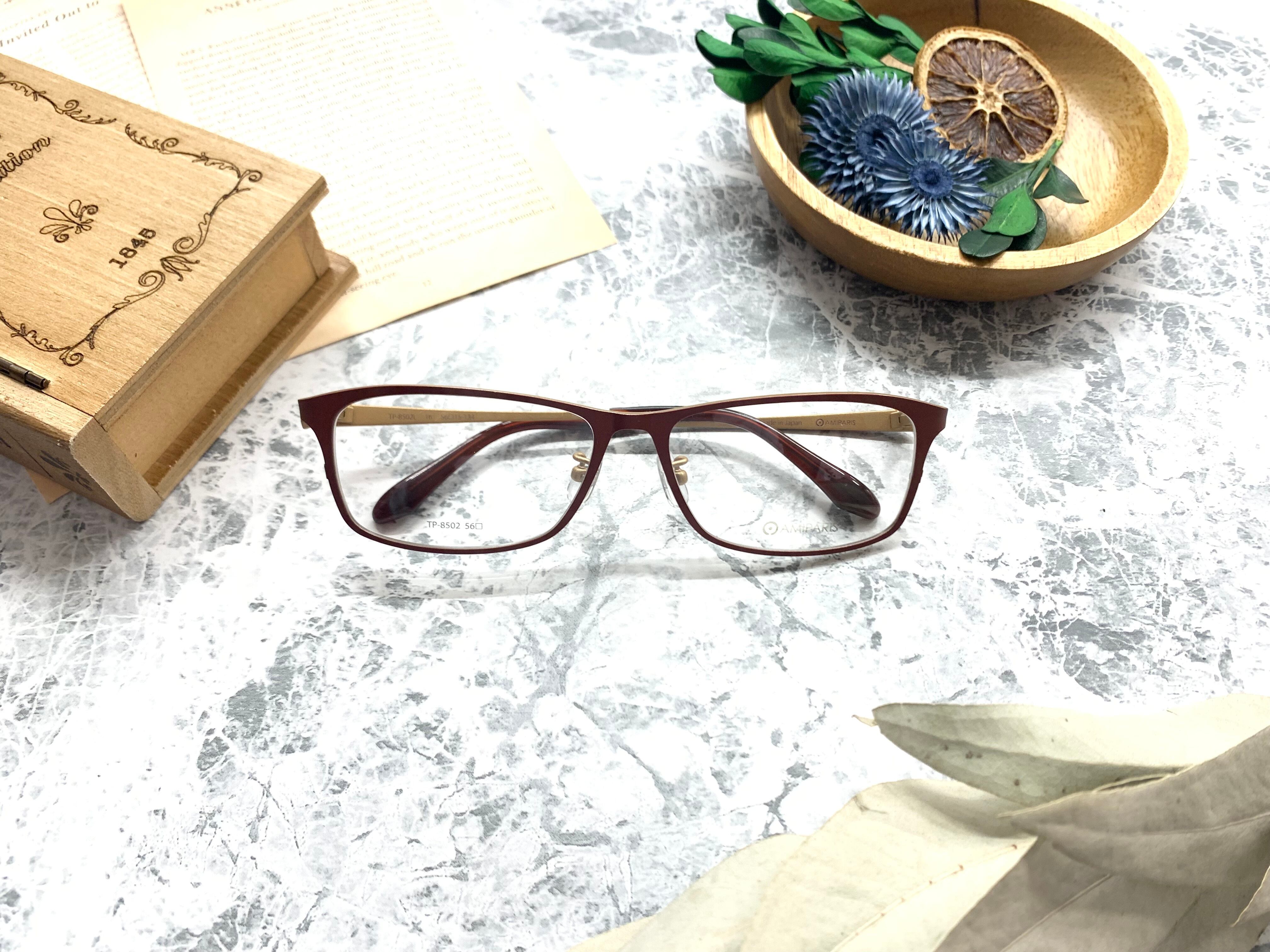 シックなワインカラーに梨地仕上げを施されたゴールドメタルがお洒落ななメタルフレーム。天地が浅くクールな雰囲気漂うウェリントンシェイプとワイン×ゴールドの高級感溢れるカラーリングが絶妙にマッチしています。明るさを抑えたデザインなので、ギラギラとしないスタイリッシュな印象のデザインとなっています。