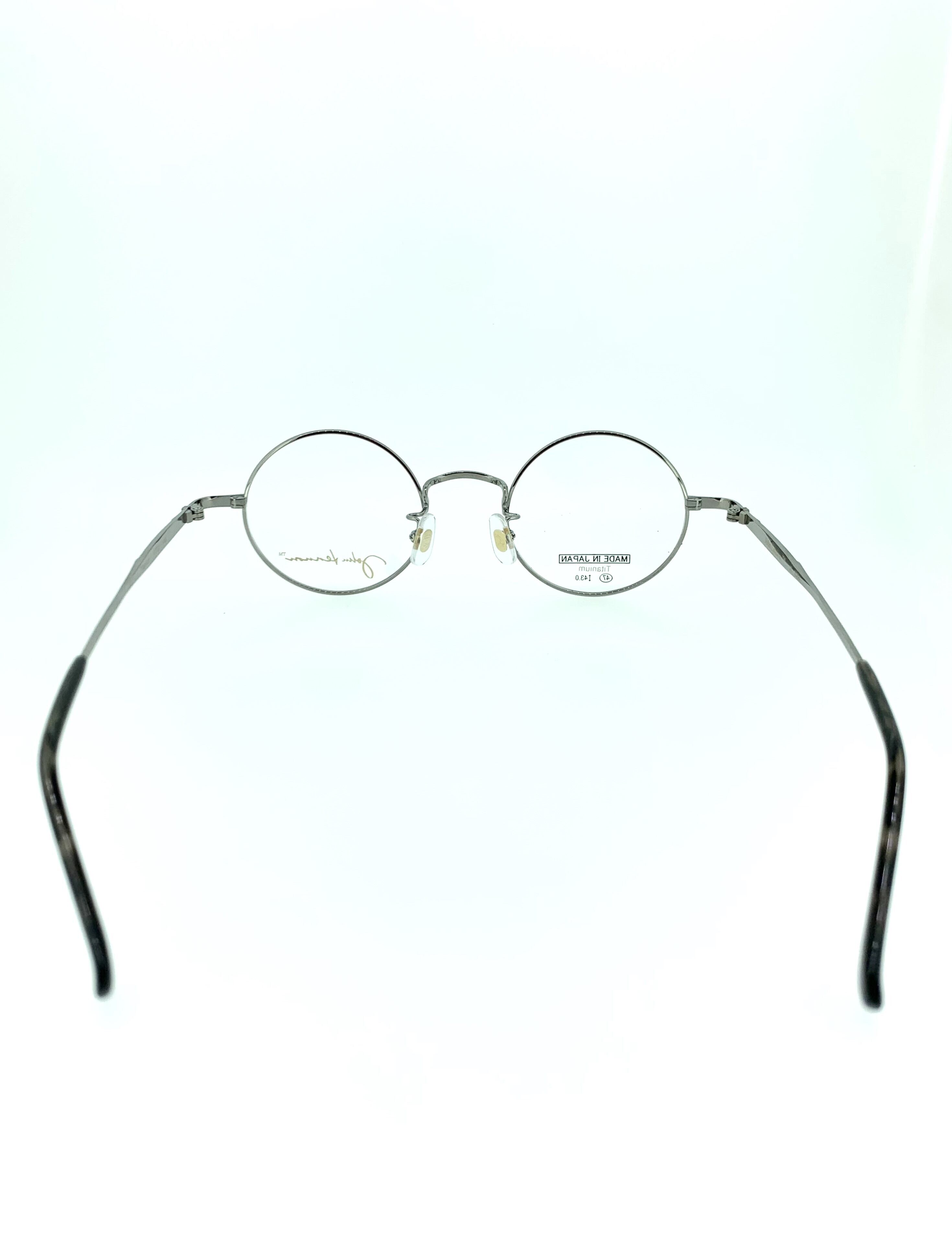 グレーとシルバーの中間のような重厚感のあるカラーリングがシックで格好良いラウンドシェイプのメタルフレーム。フロントリムと先セル(耳当て)はブラックカラーで統一され、モノトーンで大人っぽいデザインにまとまっています。シンプルながらリム縁の細部まで繊細なデザインが施された技巧性の高さに、計算され尽くされたシルエットの綺麗さが美しい作品です。