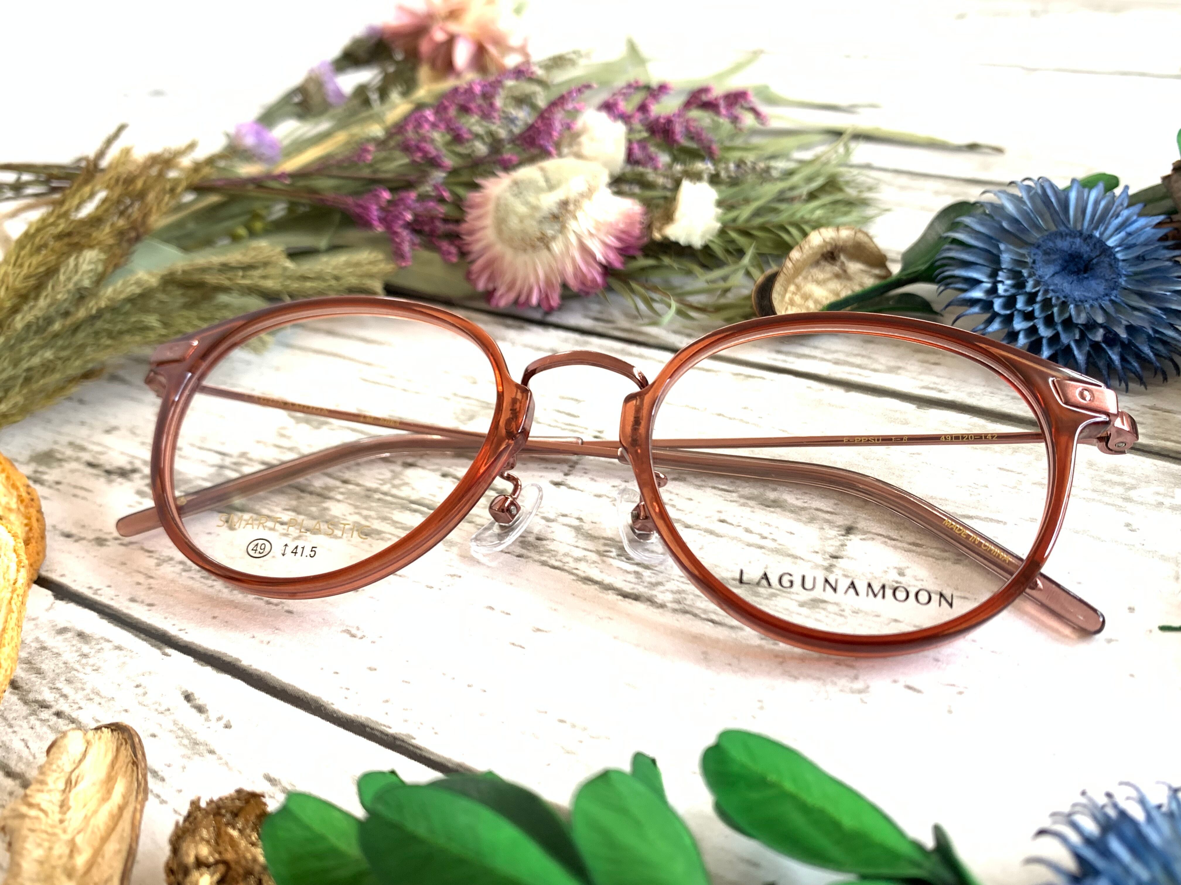 ベゴニアカラーのクリアリムとピンクゴールドの華やかなメタル地が気分の上がるコンビネーションフレーム。天地広めなボストンシェイプの優しい印象と華憐なカラーリングがマッチするお洒落な作品です。明るいカラーは肌ノリも良く、メタルブリッジのコンビネーションは鼻筋も通って見えるのでオススメです。