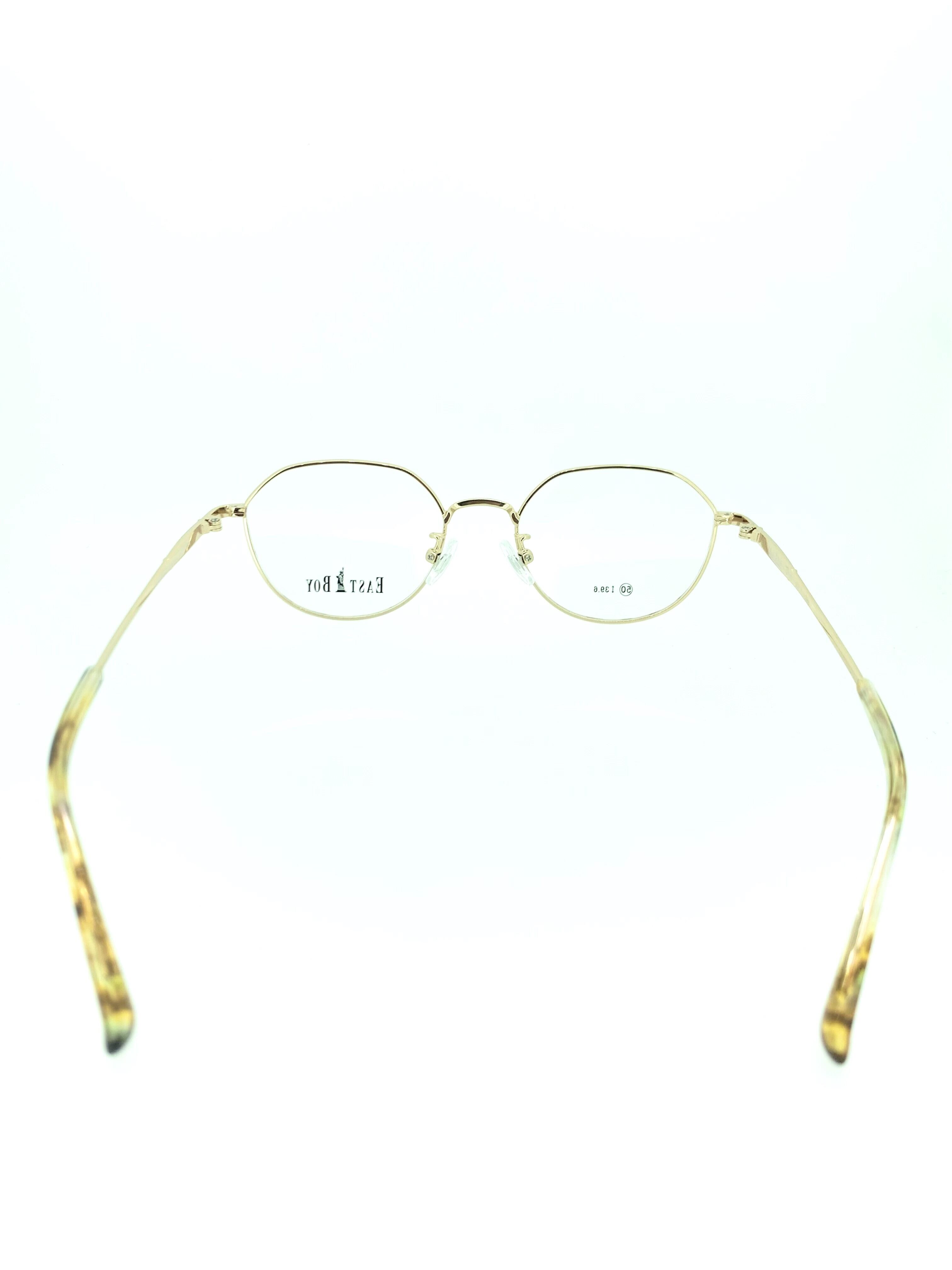 メープルのように鮮やかなレッドデミのフロントリムにハニーイエローの先セル(耳当て)を組み合わせたお洒落なメタルフレーム。コンパクトなレンズサイズなので知的で大人の雰囲気にまとめられています。ふんわりとした優しいカラーリングにアクセントを加える、個性的なクラウンパントシェイプのレンズデザインが魅力的な作品です。
