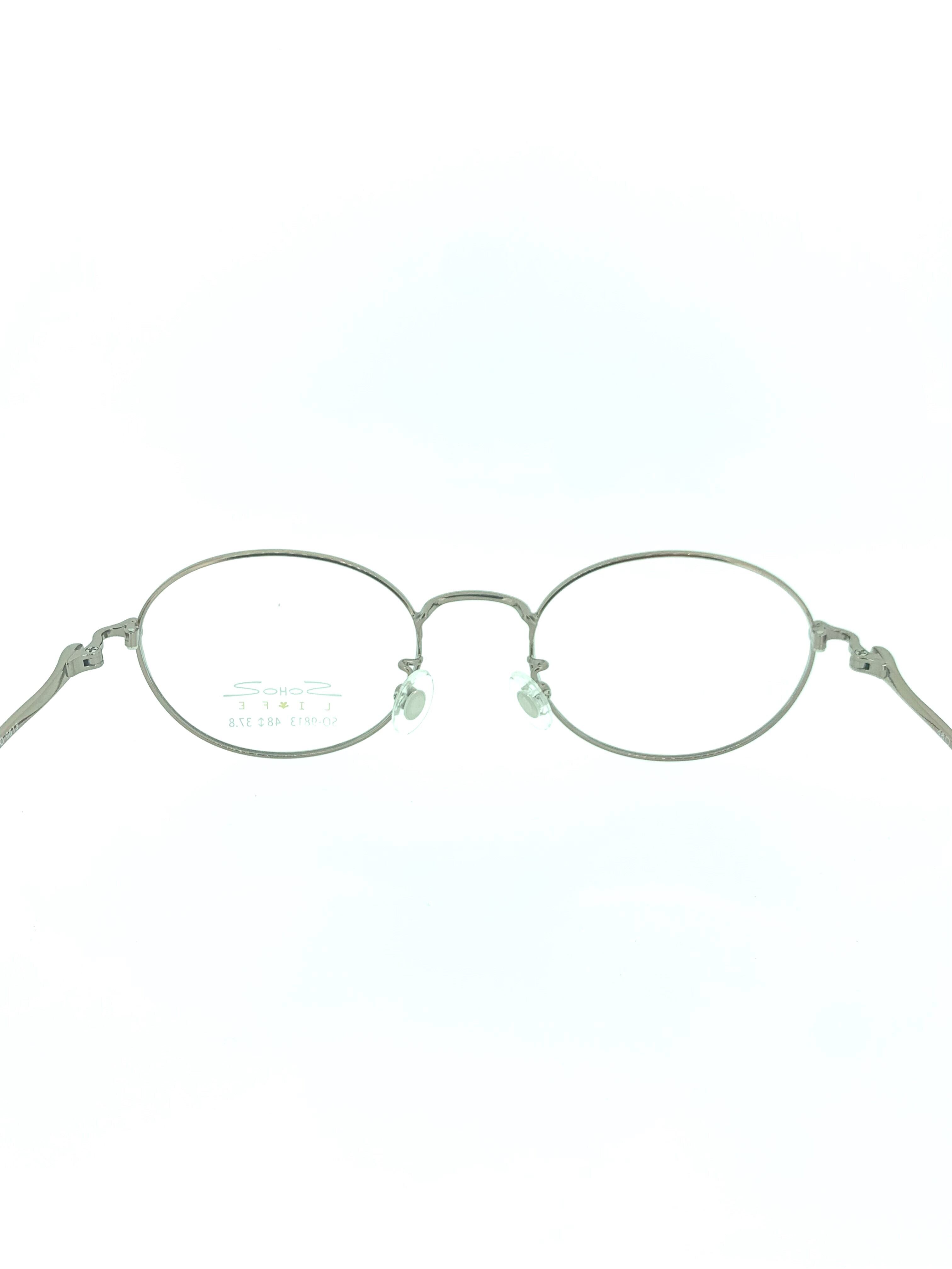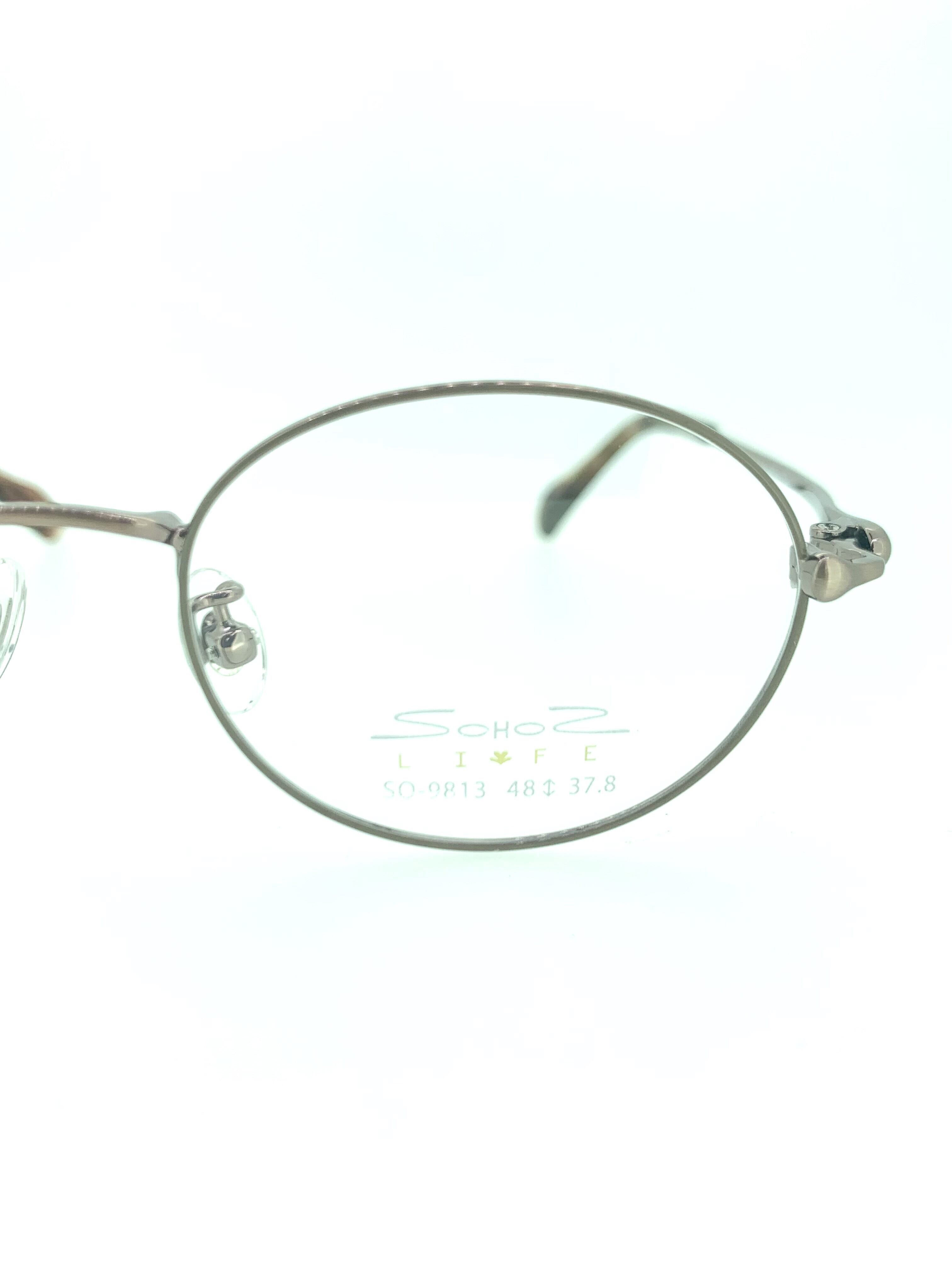 素朴な雰囲気を放つブラウンメタルに天地を広めにとった上品なオーバルシェイプがクラシカルなメタルフレーム。ヨロイ部分からテンプルにかけてのラインもレトロな雰囲気を崩さずにデザインされたお洒落な作品です。先セル(耳当て)部分も琥珀のようなブラウンデミになっていて、ブラウン系のカラーリングで統一されています。
