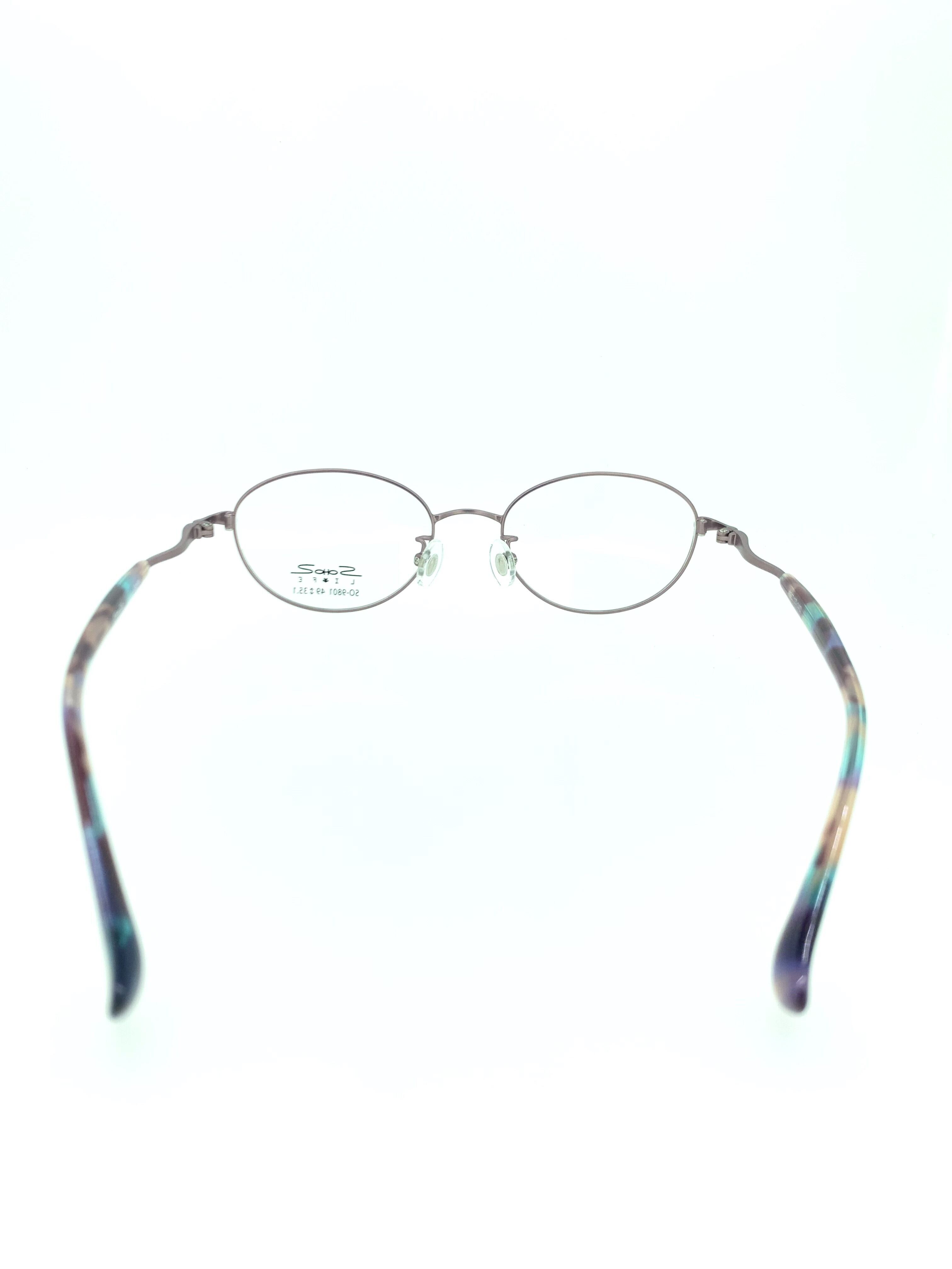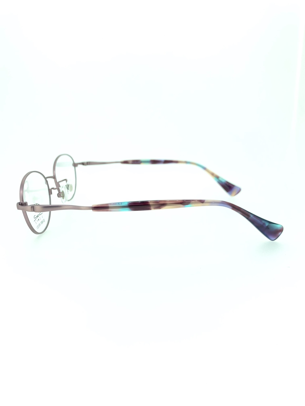 コンパクトでオーバルに近い天地浅めのボストンシェイプが上品なメタルフレーム。特徴的なオーキットカラーのメタルフレームが目を惹くカラーリングで他と被らない魅力的な作品です。水面にインクを流したような色彩豊かで幻想的なテンプルが美しく、かけても眺めていても気分の上がるお洒落なアイテムとなっています。