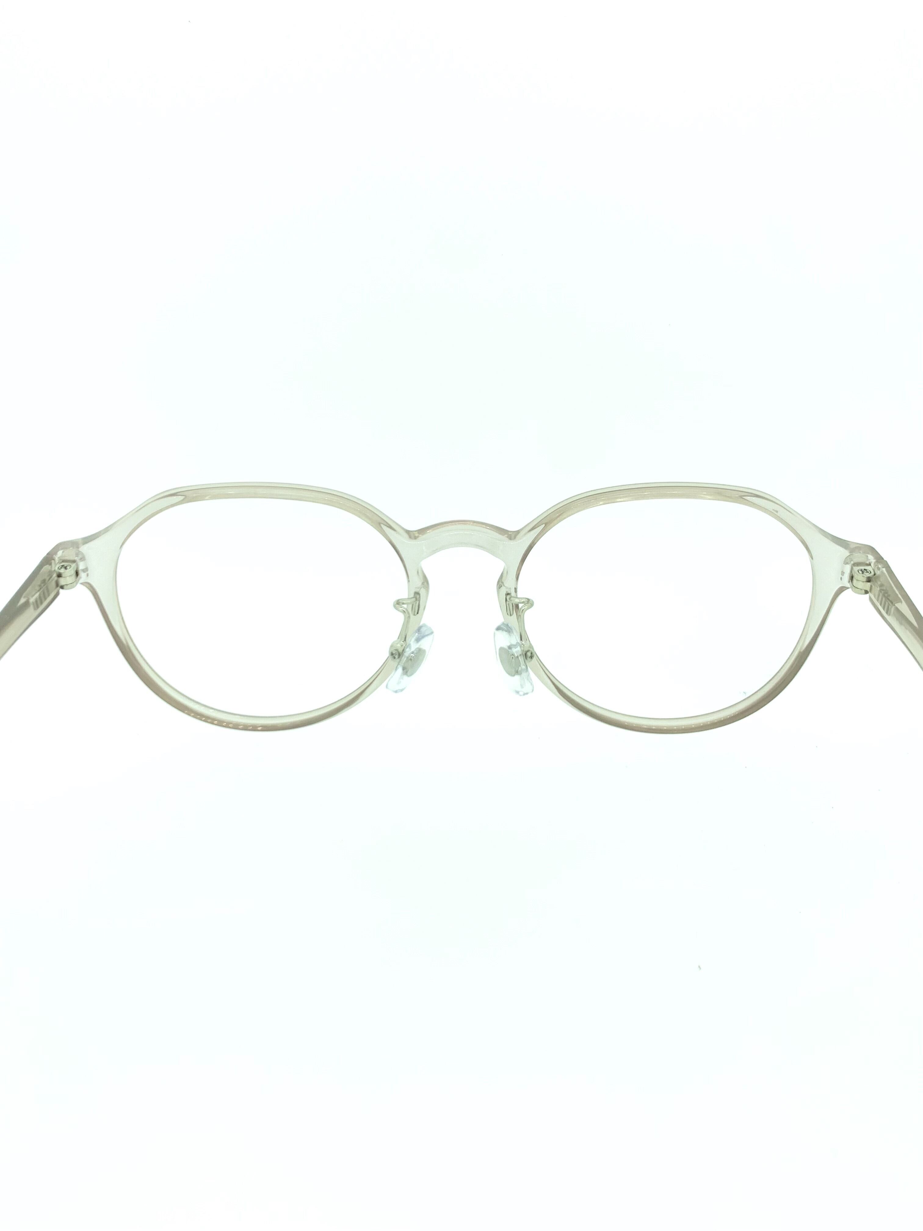 グレージュカラーのクリアフレームが独特な雰囲気を醸し出すクラウンパントシェイプのセルフレーム。クッキリとさせ過ぎないシェイプデザインで、ボストンのような柔らかさを残したデザインが綺麗めスタイルでまとめられています。スケルトンのようなハッキリとしたクリアフレームが苦手な方や他と被りたくない方にはオススメの作品です。