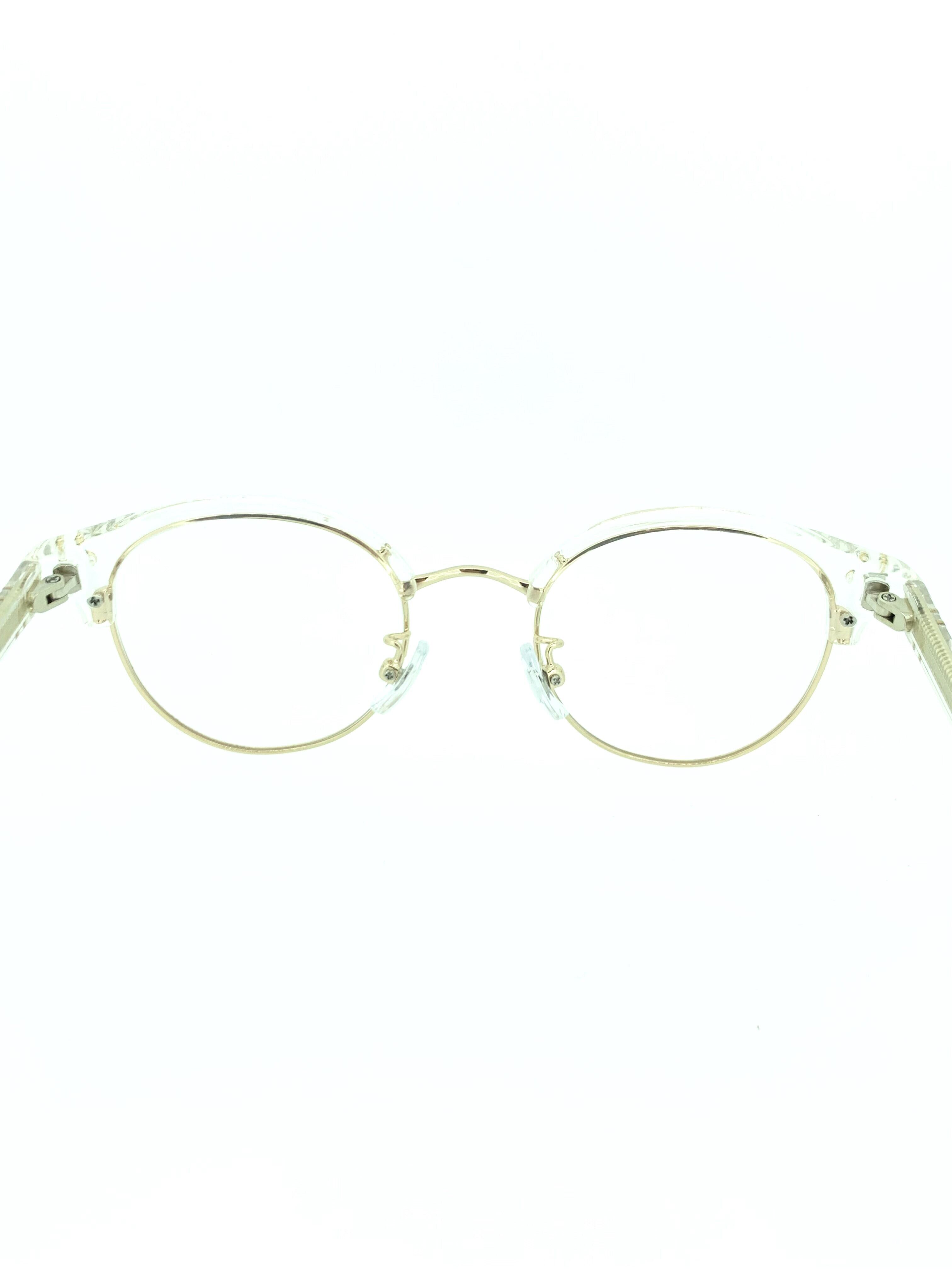 ラウンドシェイプにスケルトンカラーのセルブローを合わせたブローフレーム。セルブロータイプのクラシカルなデザインに人気のスケルトンカラーを採用したモダンで格好良いカラーリングになっています。透けてみえるクリアセルを活かしたイエローゴールドのメタル地が、先鋭的でモード感があるお洒落なデザインにまとまりました。