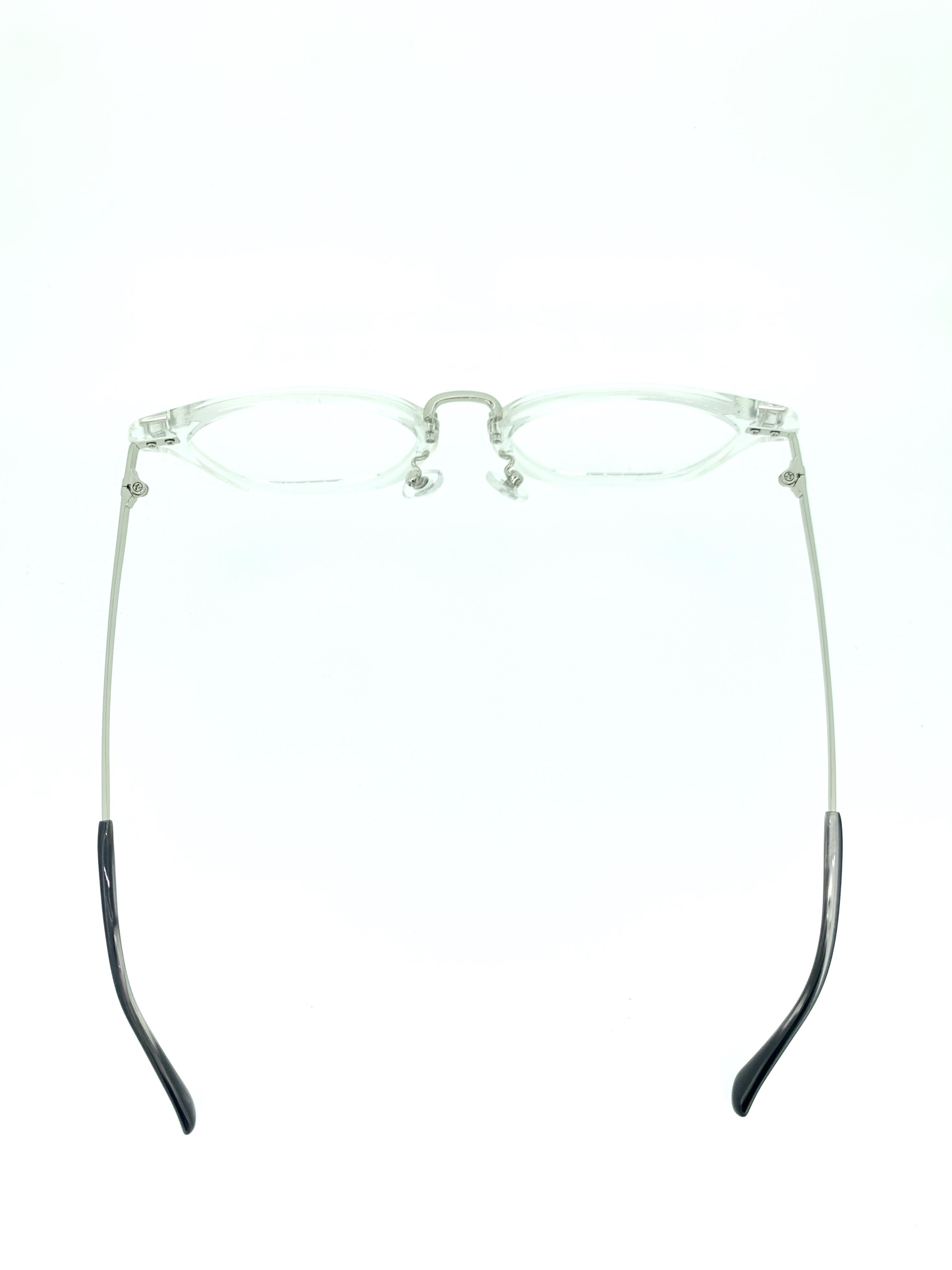 天地の広いウェリントンシェイプのセルフロントに清潔感のあるシルバーメタルを合わせたコンビネーションフレーム。正方形のようなワイドなレンズデザインはレトロなシルエットになっていて、スケルトンカラーのクリアリムのモダンさとは相対的なのに絶妙なバランスで混ざり合います。しっかりとインパクトのある組み合わせをシンプルなデザインでまとめた秀逸な作品です。