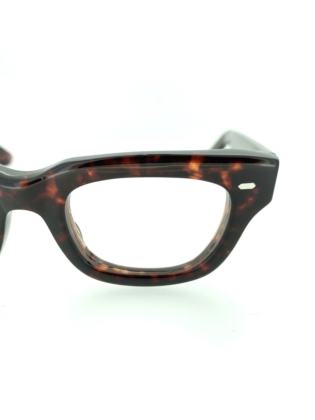 レッド系ブラウンデミのセル生地に少し天地の浅いウェリントンシェイプがクールなセルフレーム。オールデミ柄の統一されたカラーリングだからこそ計算されたシルエットの美しさが際立ち、厚みのあるセル生地が印象をハッキリとさせてくれます。カラーリングもサイズ感もコーデに合わせやすく、しっかりアクセントにもなるお洒落な作品です。