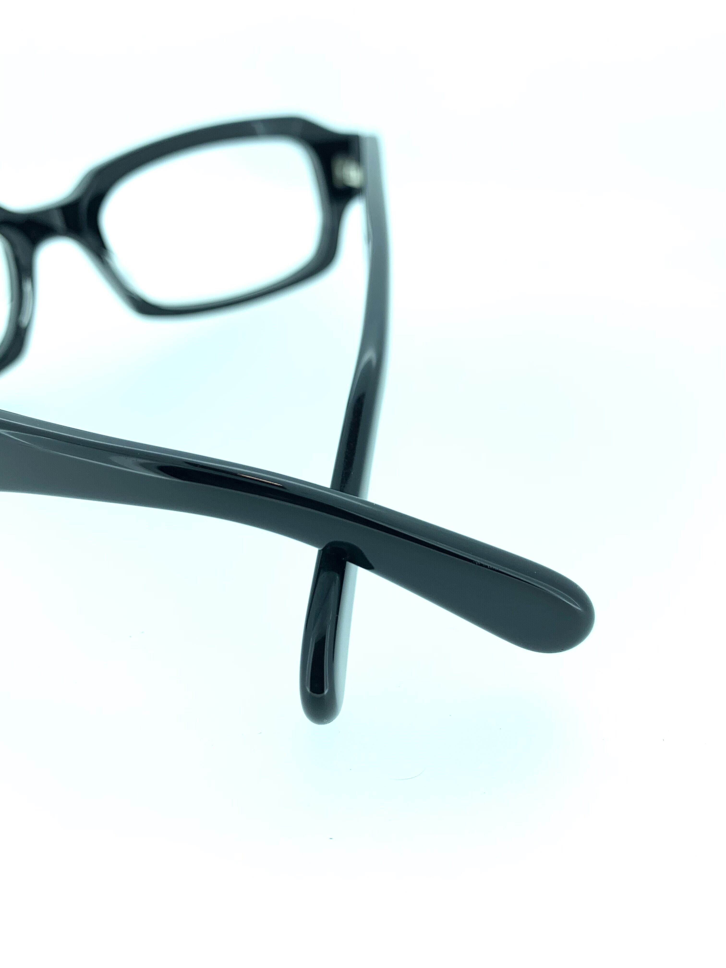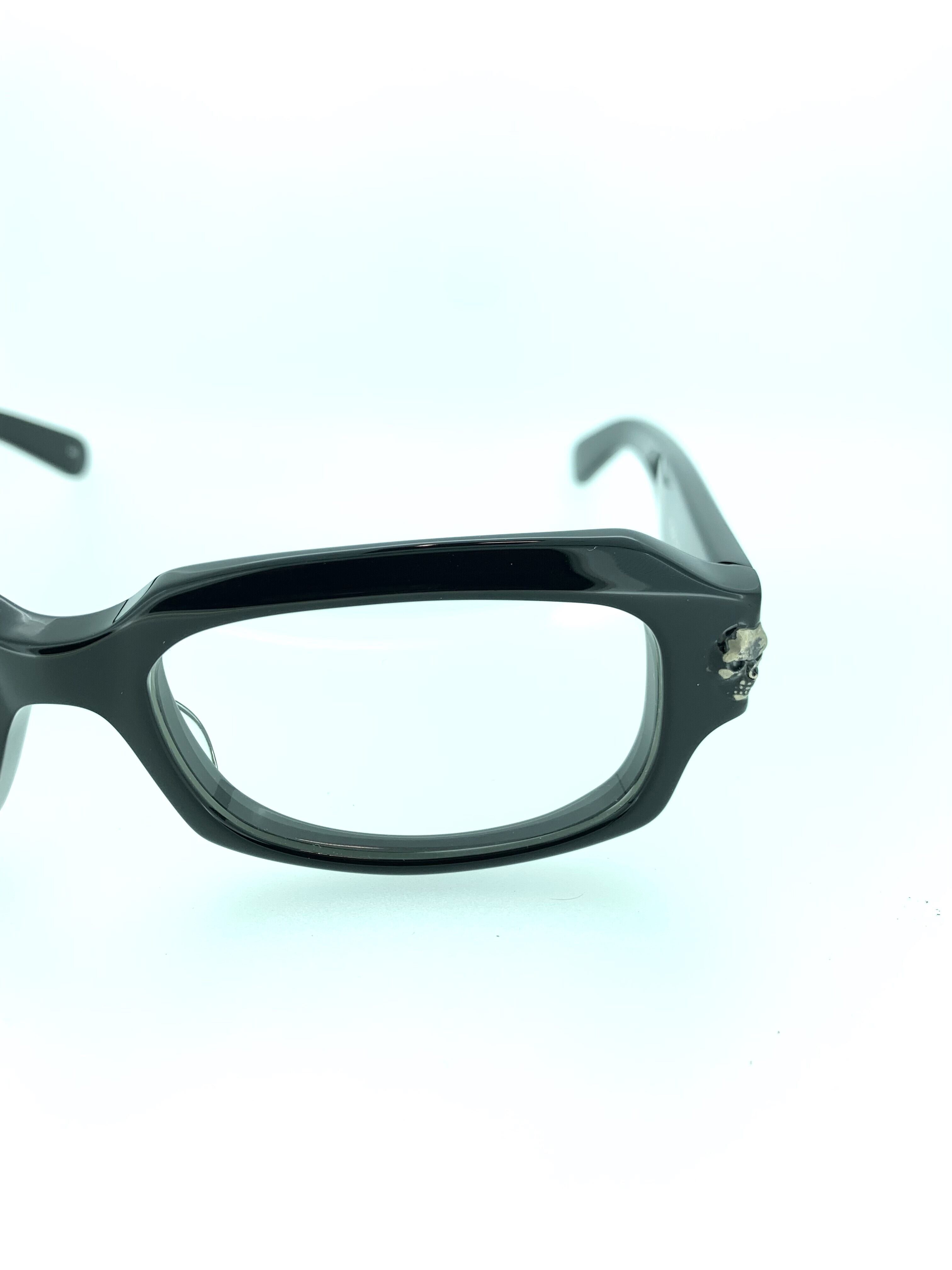 多角的なリムデザインに天地を広めにとったスクエアシェイプがお洒落なセルフレーム。フロントリムのカット面が美しく、光りの加減で表情を変える多角的なデザインで、ブラック単色のシンプルなカラーリングを感じさせない心躍るフレームワークとなっています。左側のヨロイ部分にはドクロの装飾が施され、アシンメトリなデザインとアンティーク調のメタルのドクロにロックを感じる作品に仕上がりました。