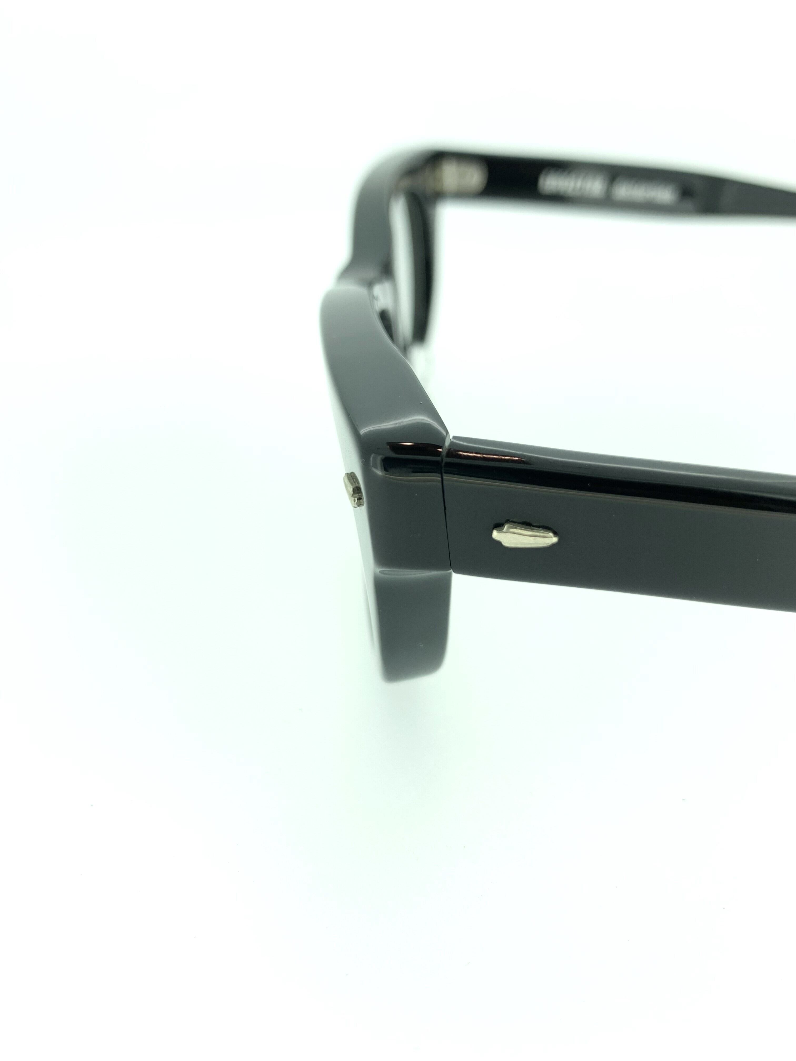 レンズの横幅がワイドにとられたウェリントンシェイプが特徴のセルフレーム。肉厚のセル生地で格好良いロックな印象のポリッシュブラックを合わせたバランスの良い作品です。目尻にかけて上がるフォックスのようなエッジを効かせたシルエットが色気を放つ魅力的な作品です。ワイドなデザインになっているため、カラーレンズを入れてサングラスとしても映える1本です。