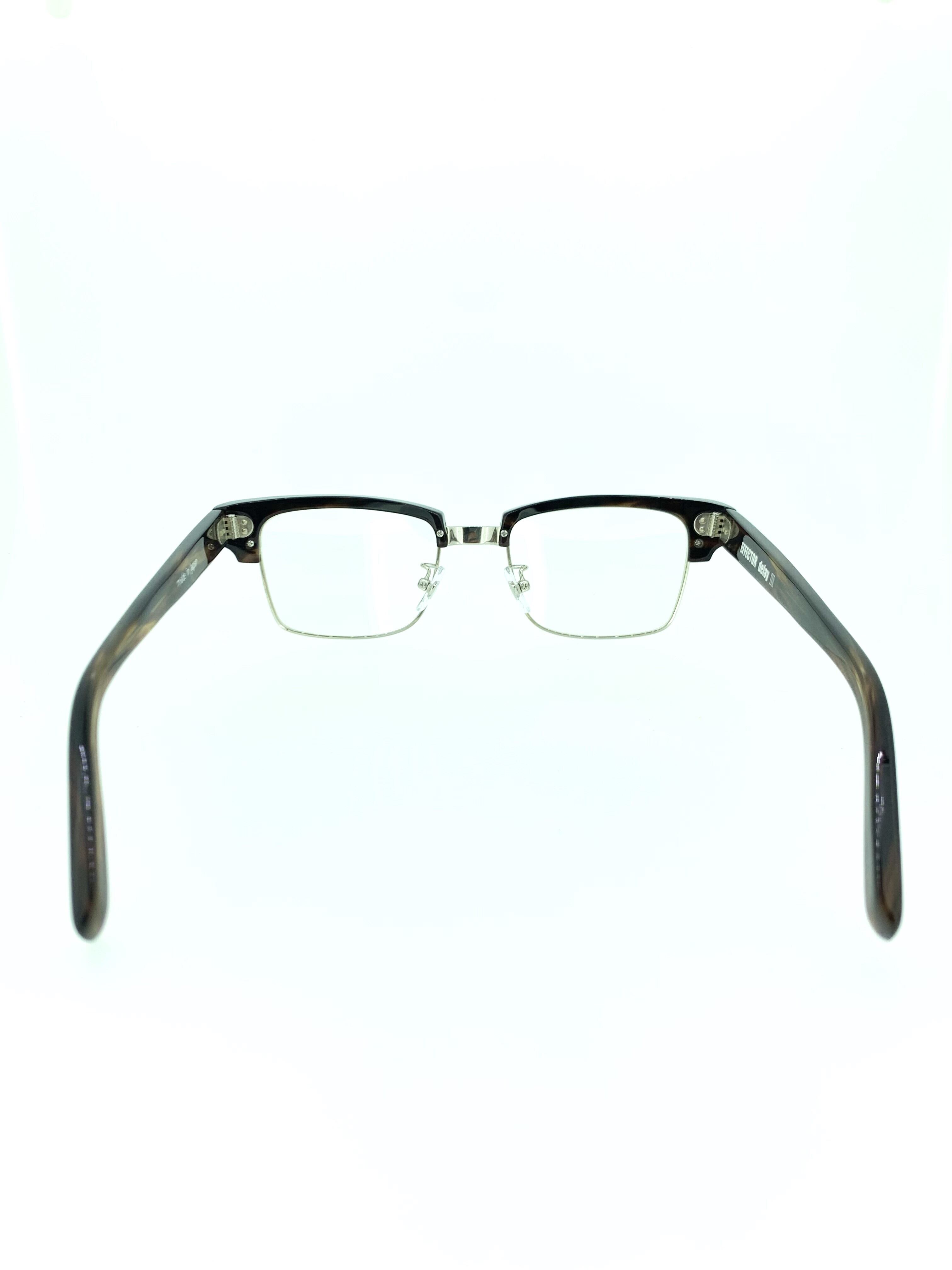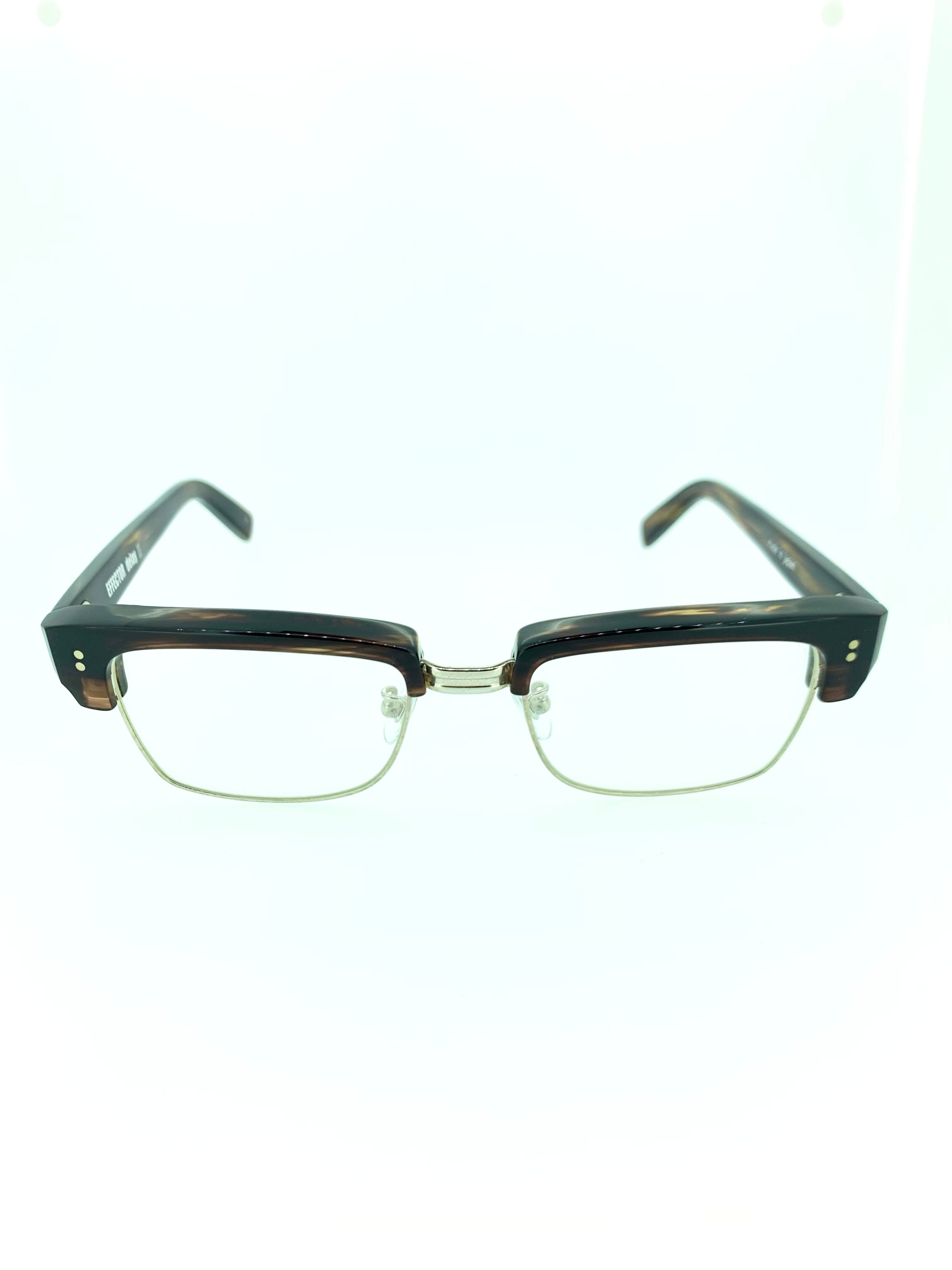 綺麗な台形でスクエアに近いウェリントンシェイプが特徴のセルブローフレーム。コニャックカラーのレトロ感と渋さが魅力的で、落ち着いた大人の色気を感じるカラーリングになっています。上部リムは山なりを少なくストレートラインを描くデザインなので、ワイルドな雰囲気が強く出ているのがEFFECTORらしい作品ですね。