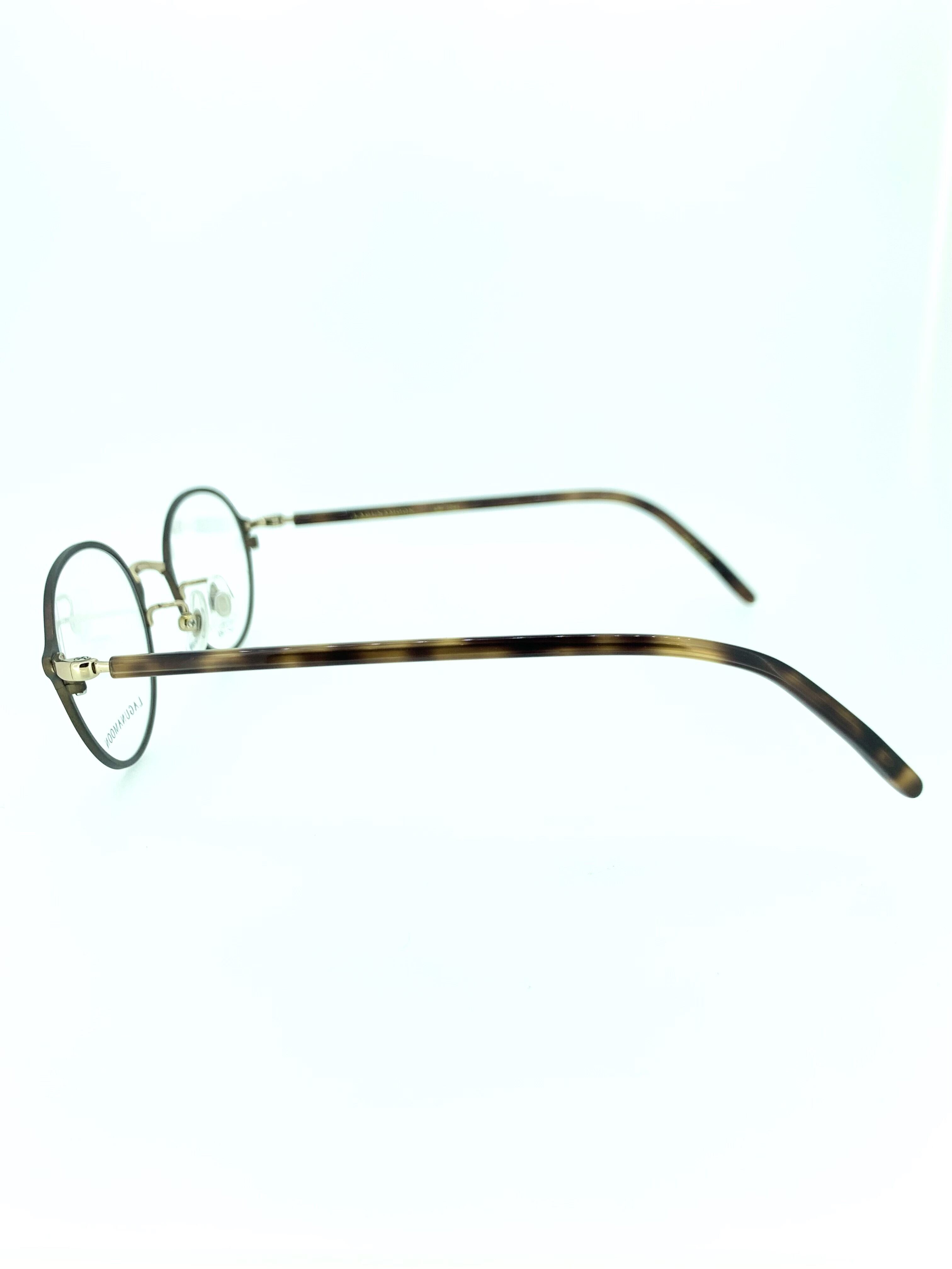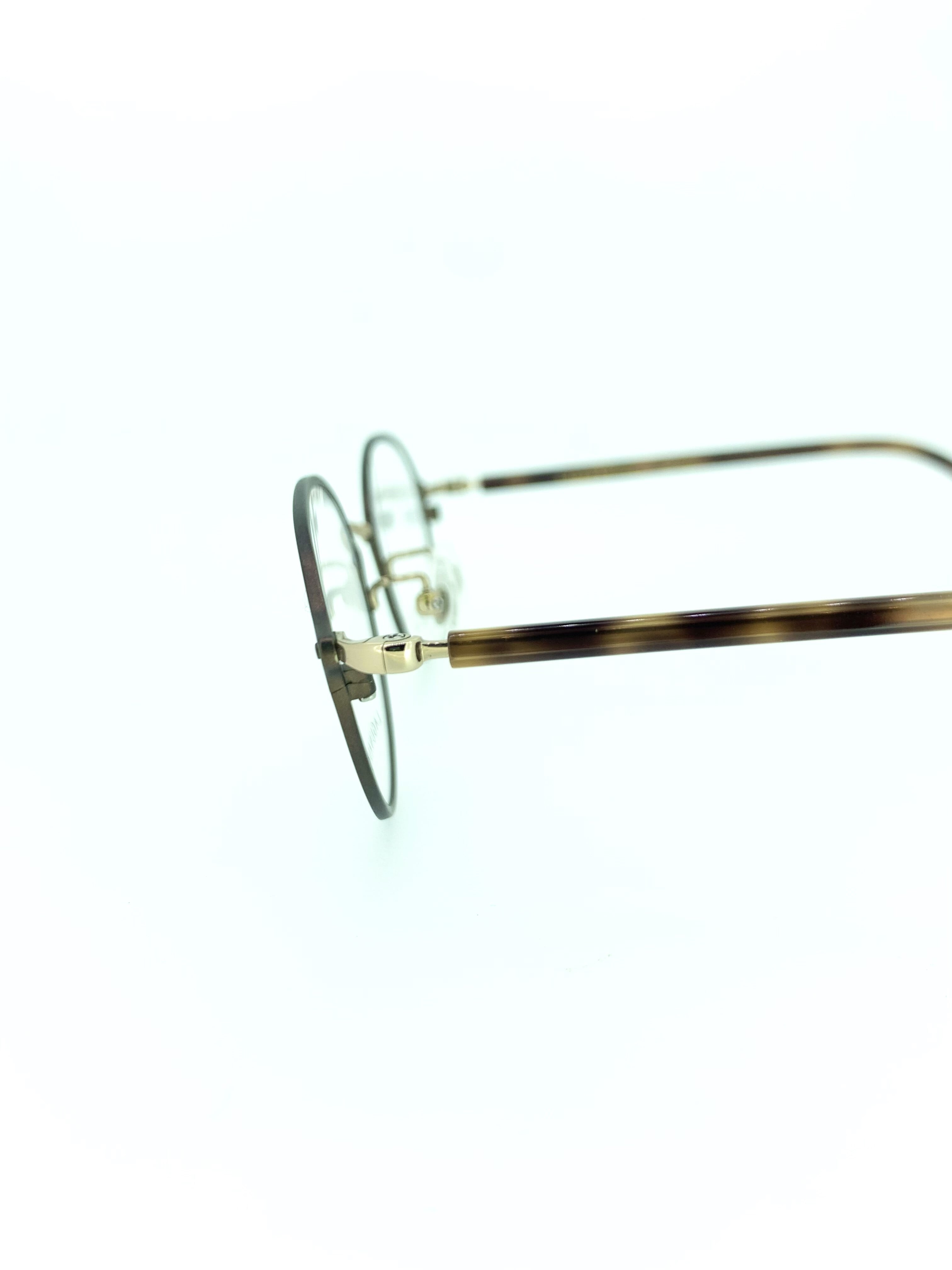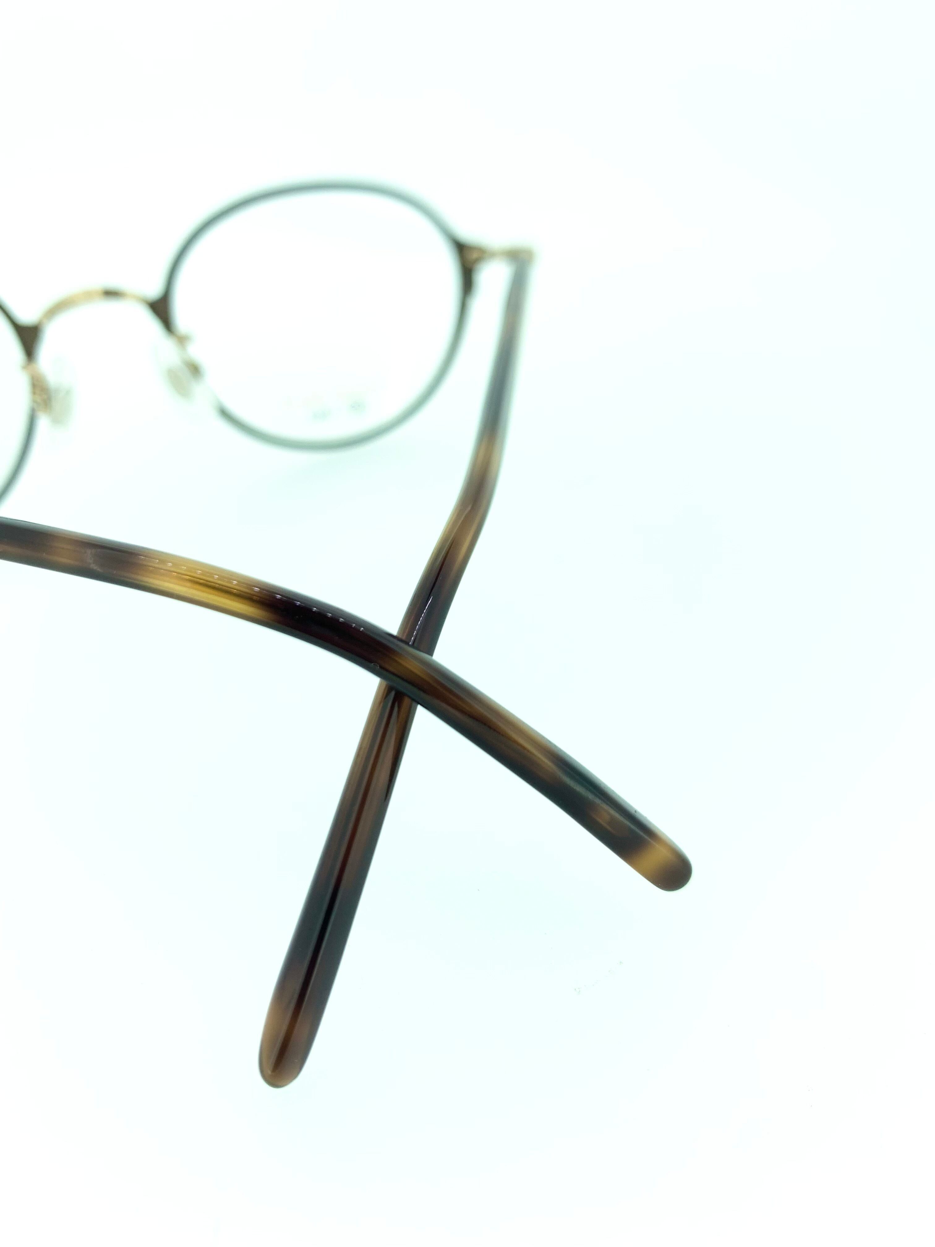丸みの強いボストンシェイプに少し幅を持たせてリムを強調させたフロントデザインがお洒落なコンビネーションフレーム。ブリッジやテンプルのメタルは上品なゴールドカラーに分けることで、リムを引き立てる上品な仕上がりになっています。テンプルは高級感もありコーデに合わせやすいブラウンデミでトーンダウンさせたスタイリッシュ寄りの作品となりました。