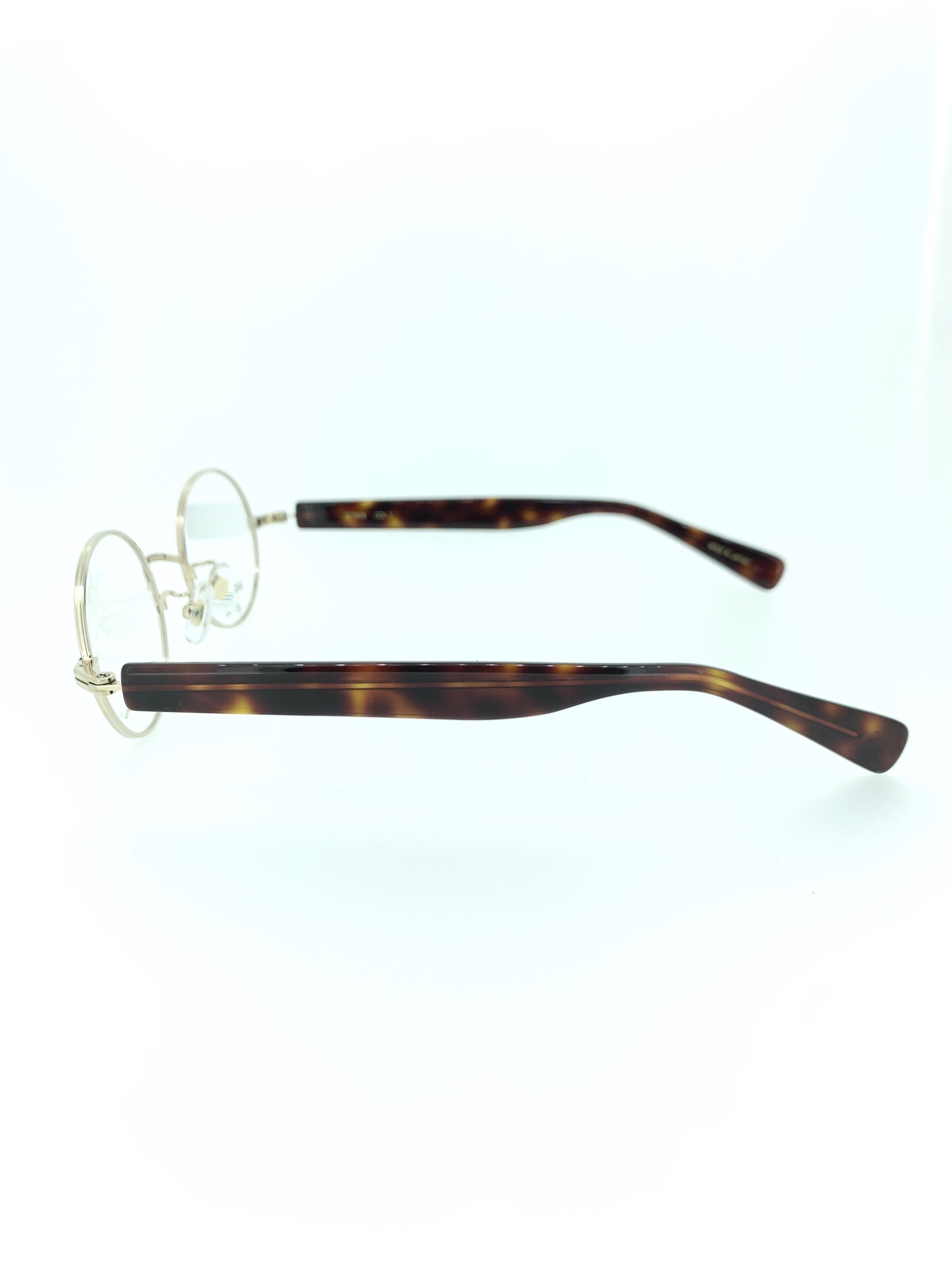小玉なラウンドシェイプにしっかりと幅のあるセルテンプルのギャップが存在感のあるコンビネーションフレーム。高級感と大人っぽい雰囲気のあるブラウンデミの色合いが、飾らない印象で余裕のある大人のお洒落感を上手に引き立てています。フロントはコンパクトにまとめているので、スッキリしているのがポイント高いですね。