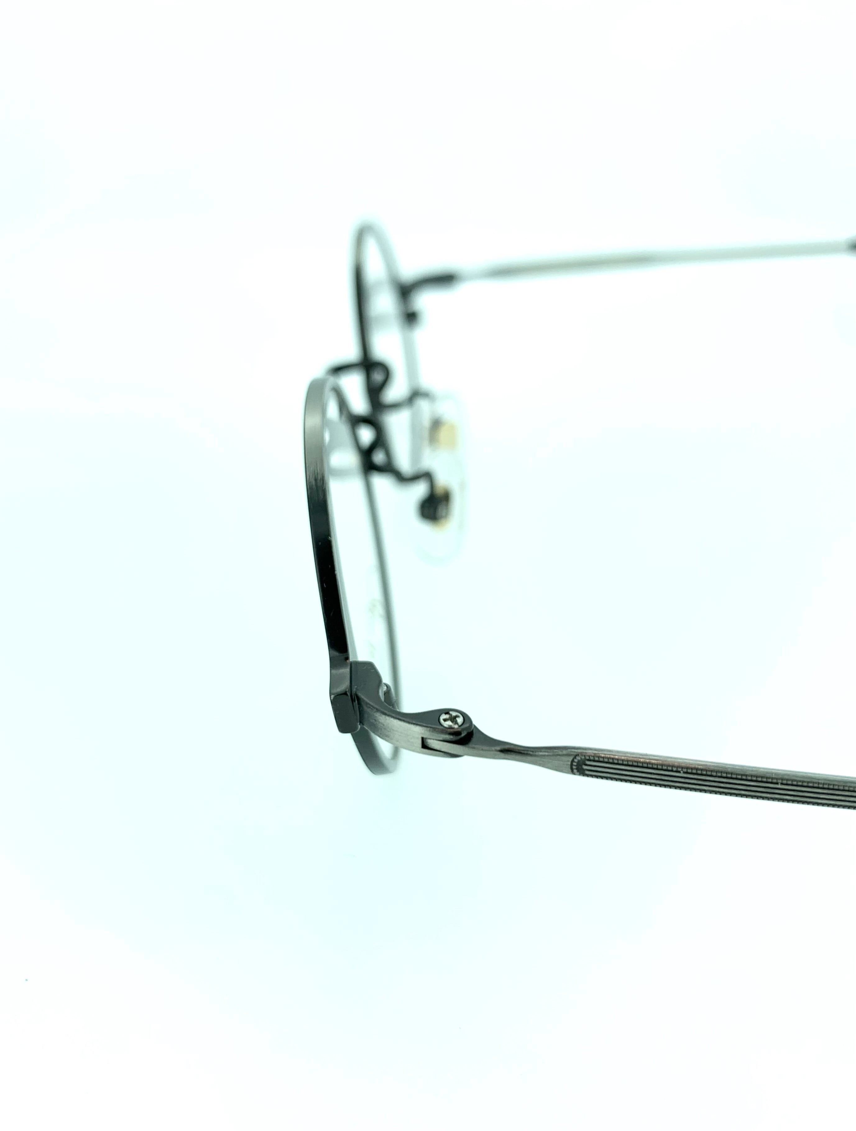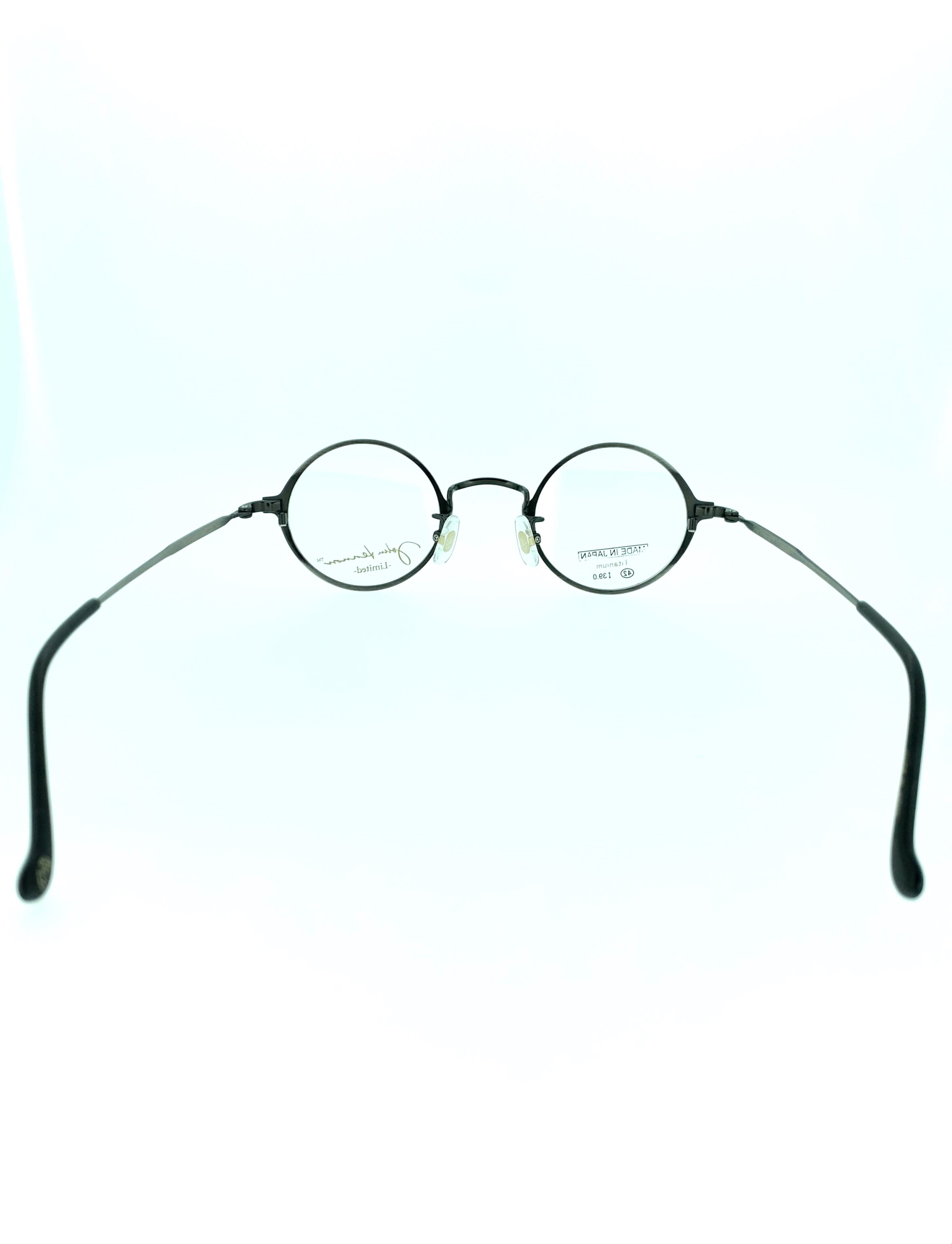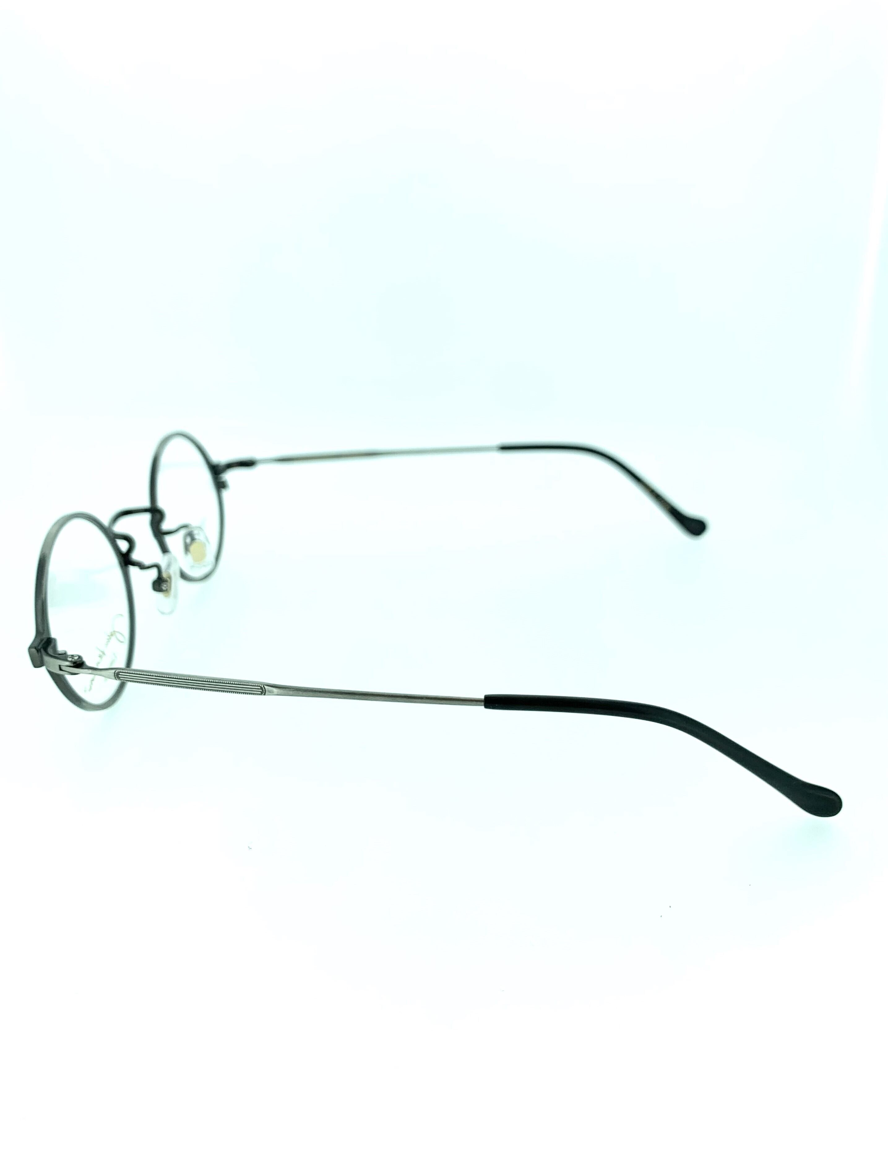 グレーのメタルフレームにマットブラックのフロントリムがラフな感じのお洒落なメタルフレーム。シンプルながらに色味をモノトーンで揃えることでラウンドシェイプのシルエットを活かす仕上がりになっています。コンパクトなレンズサイズなので、丸眼鏡にありがちなかけられてる感の出ないクラシカルにまとまった作品です。