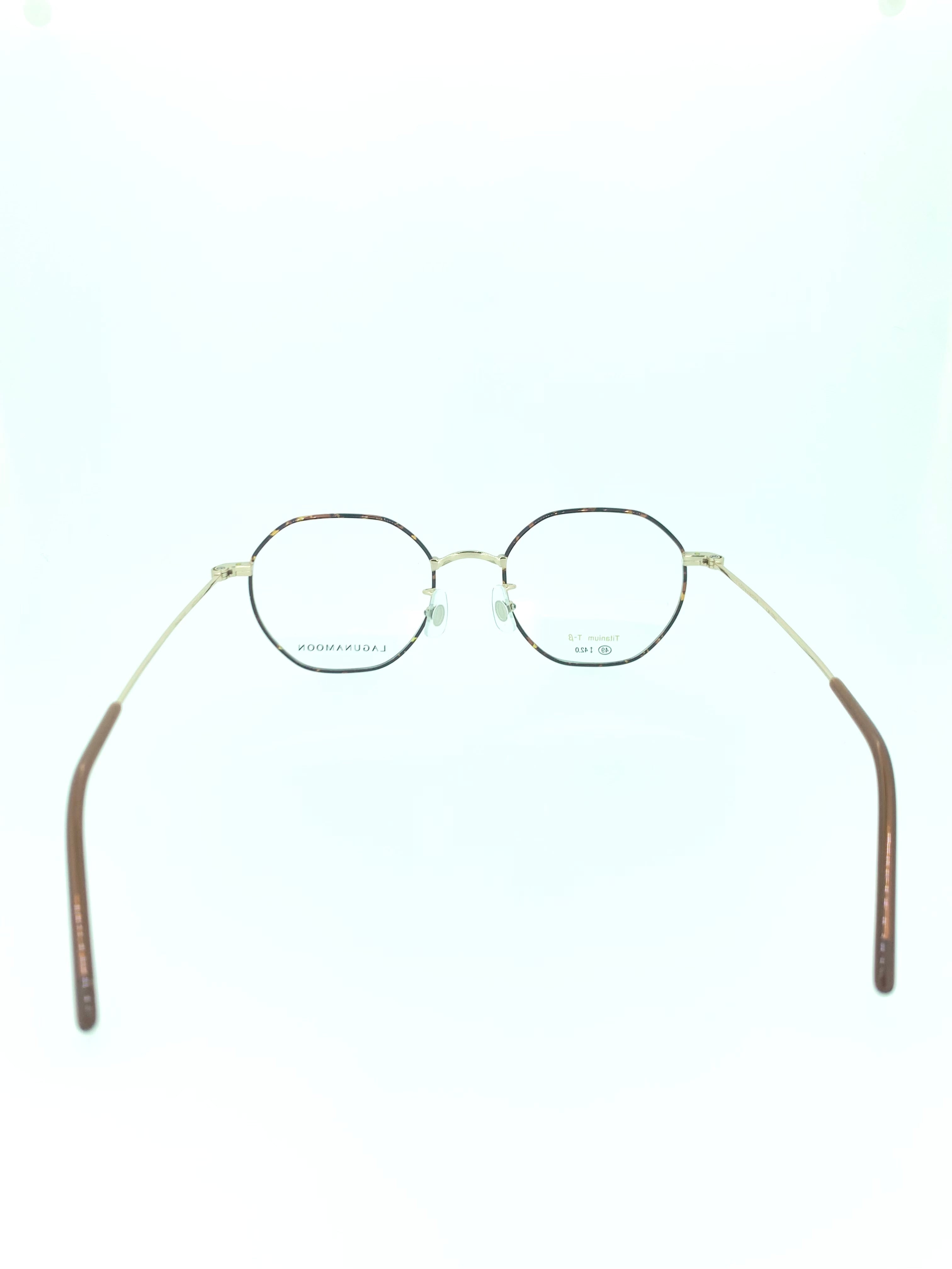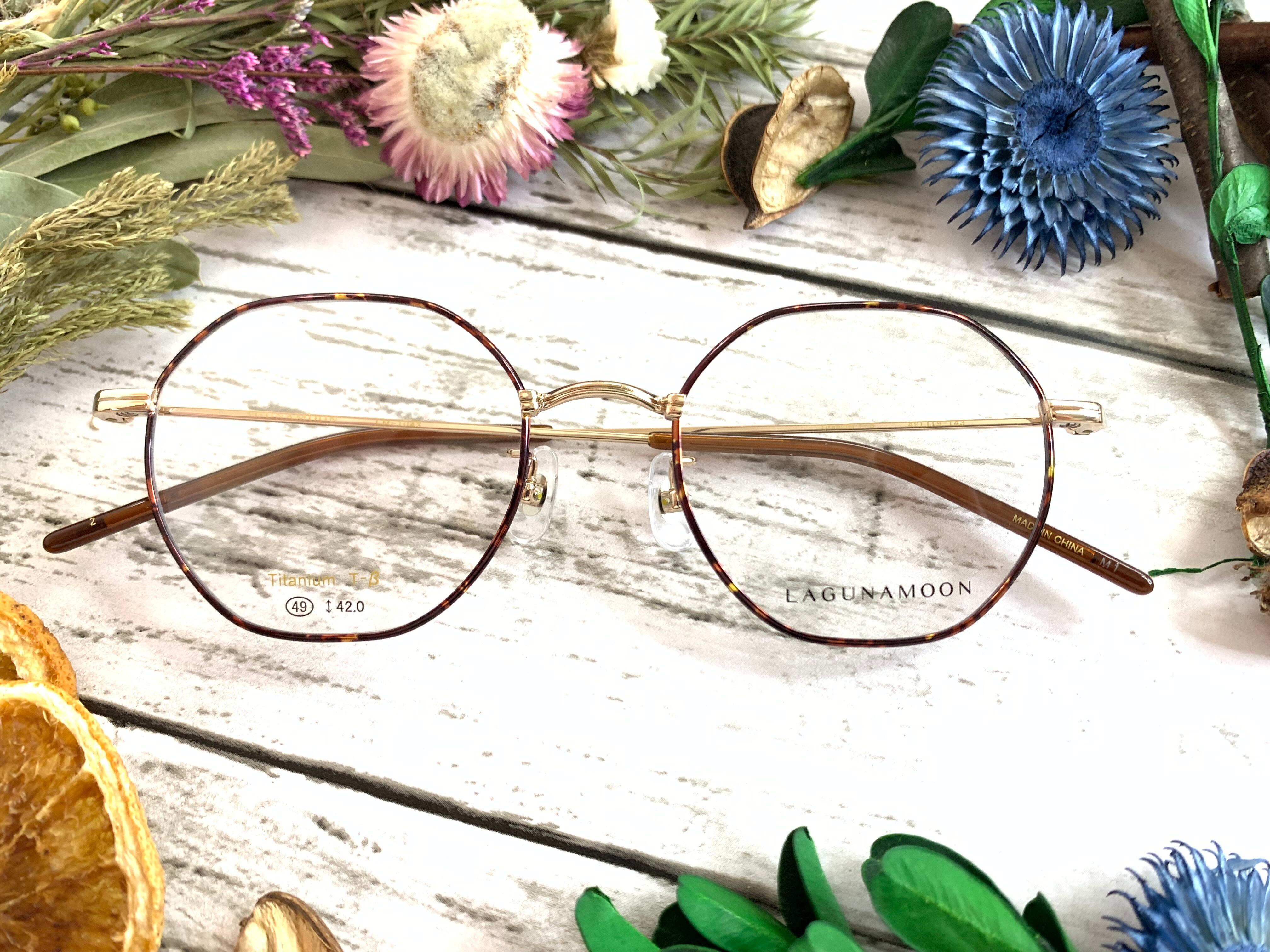 オクタゴンシェイプの細身スタイルが目を惹く個性的なメタルフレーム。フロントのリムカラーがデミ柄になっていて、鉱石のようなキラキラしたデザインが高級感があってお洒落な作品。しっかりとレンズサイズもあって存在感のあるフロントに対して、シンプルに抑えたテンプルと先セル(耳当て)のデザインで綺麗に調和されたシルエットで魅せる1本となっています。