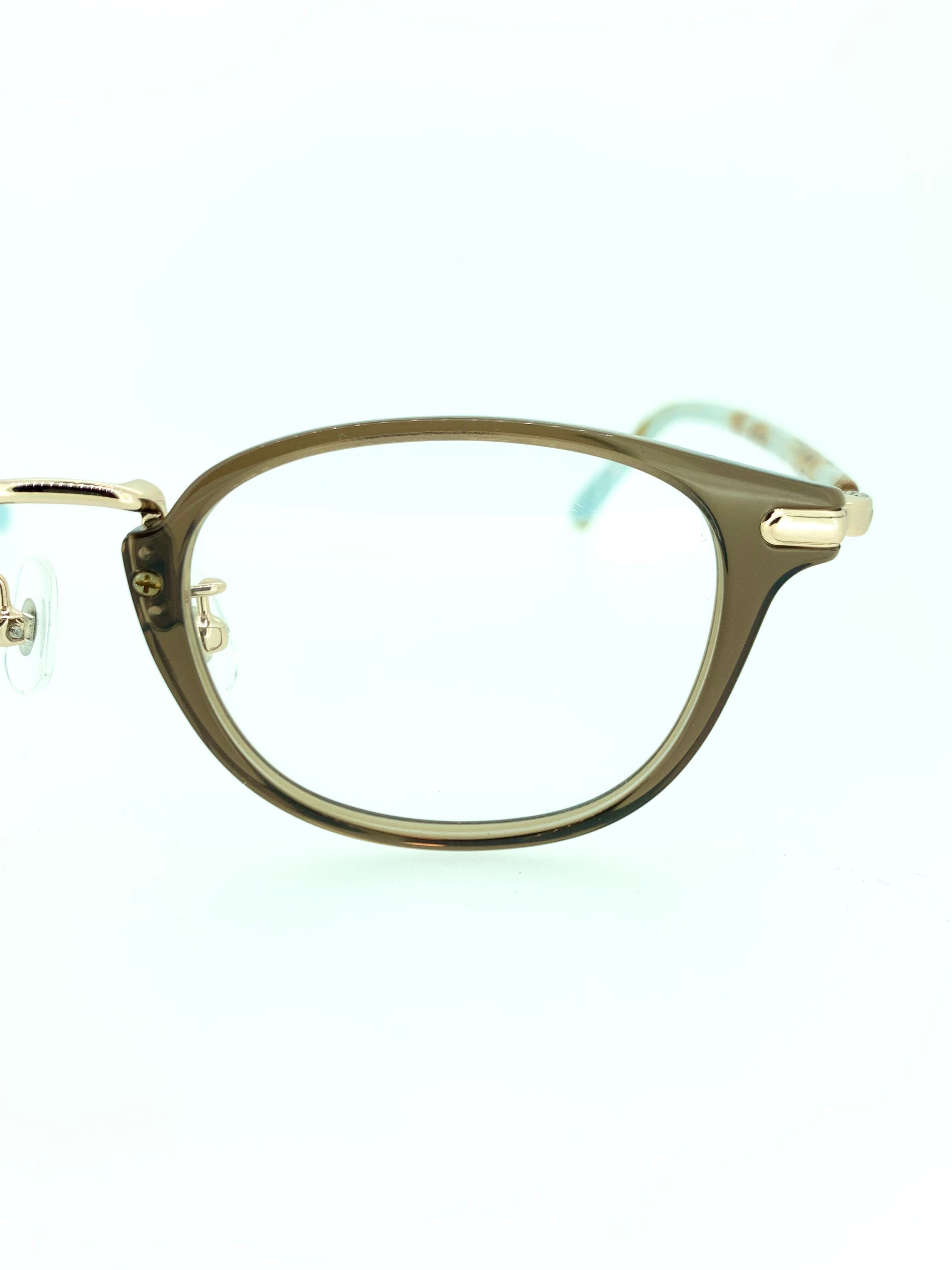 ターコイズブルーにブラウンが混じり合う幻想的なテンプルが、神秘的な泉のような綺麗さででうっとりしてしまうコンビネーションフレーム。フロントはブラウンのクリアリムを採用しアースカラーで雰囲気を崩さずにまとめています。ゴールドメタルも高級感があり、柔らかく清潔感のあるボスリントンシェイプともマッチしています。一味違ったお洒落なフレームを楽しみたい方にオススメな作品です。