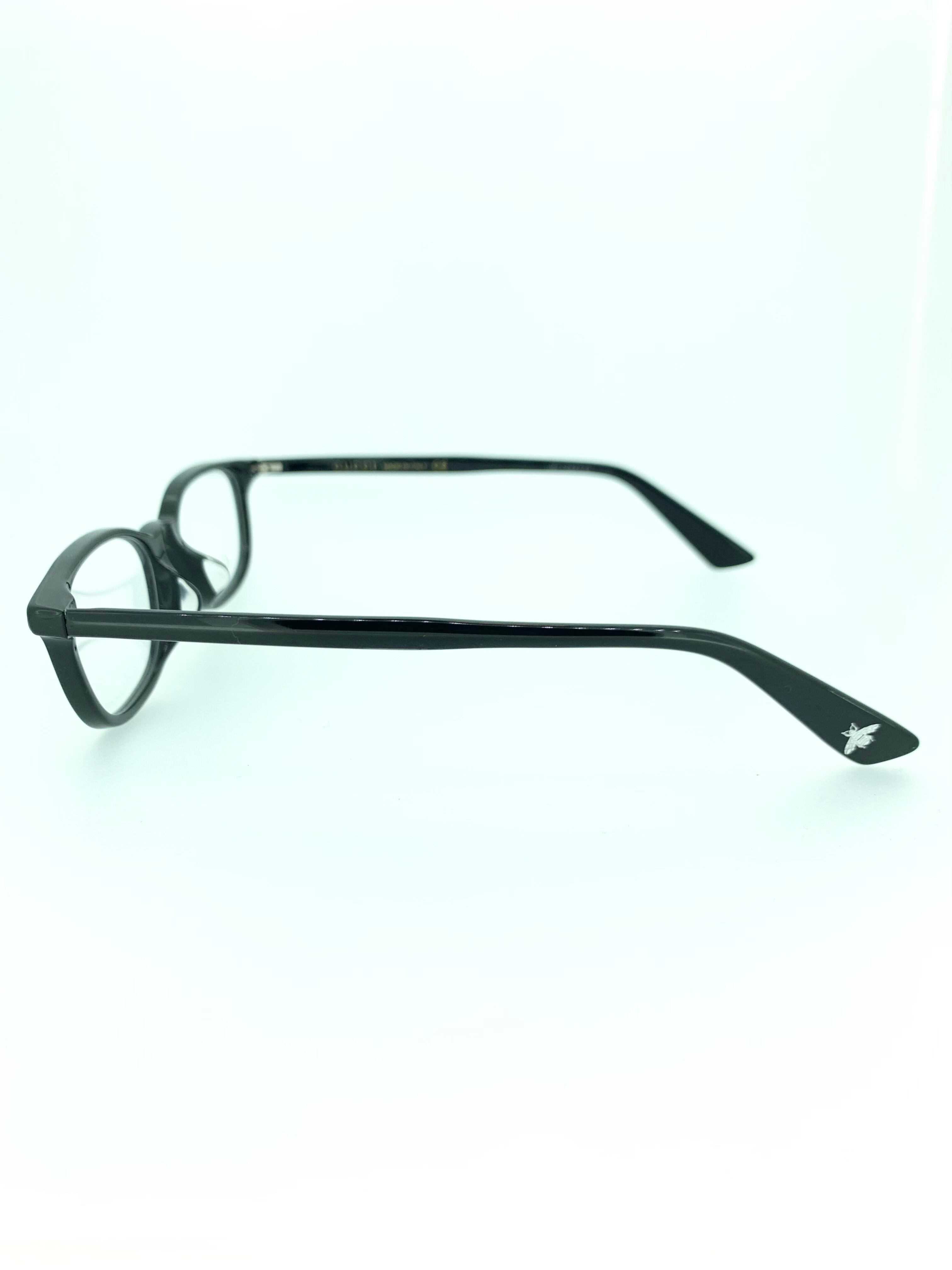 スタイリッシュなポリッシュブラックのカラーリングが格好良い天地浅めなボスリントンシェイプのセルフレーム。スラッと伸びる上部リムに丸みを帯びた下部リムのラインに中性的なシルエットを感じます。ヨロイ部分のロゴやテンプル先端の蜂のモチーフなど、ゴールドカラーでシンプルにまとめるところがハイブランドらしいお洒落な作品です。