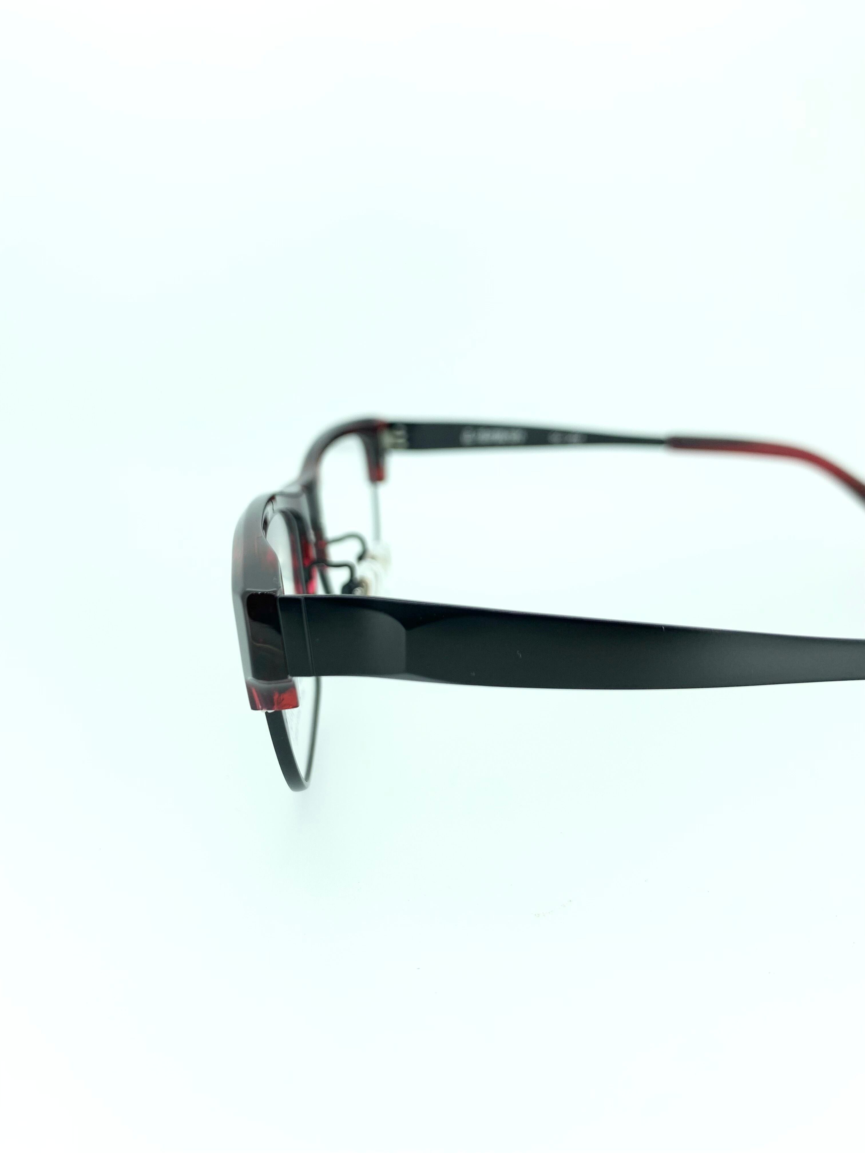 スラッとした刀身のような上部リムのラインが、テンプルにかけて流れるようなシルエットになった綺麗なブローフレーム。深みのあるオクサイドレッドのセル生地にマットブラックのメタル地が大人の格好良さを魅せてくれます。天地の浅いウェリントンシェイプの堅実なイメージとカラーリングが相性抜群です。