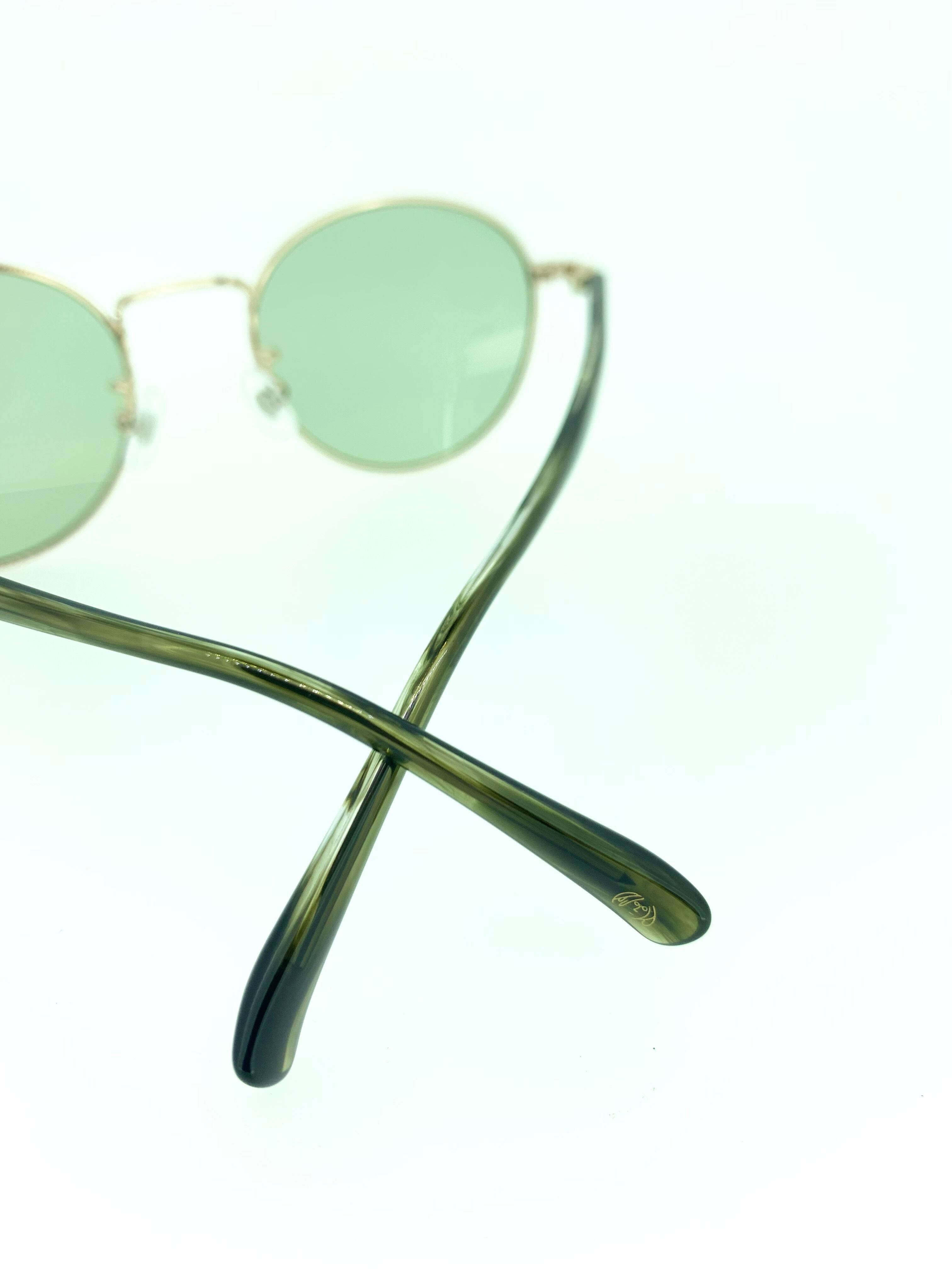ラウンドのように丸みの強いボストンシェイプに直線的なブリッジデザインがワイルドな雰囲気を醸し出すメタルフレームサングラス。ワイルドさの中に色気を感じるアイビーグリーンのレンズカラーと同色系セルテンプルが絶妙にマッチしています。どこかクラシカルなシルエットは流行りに流されない大人の1本となっています。