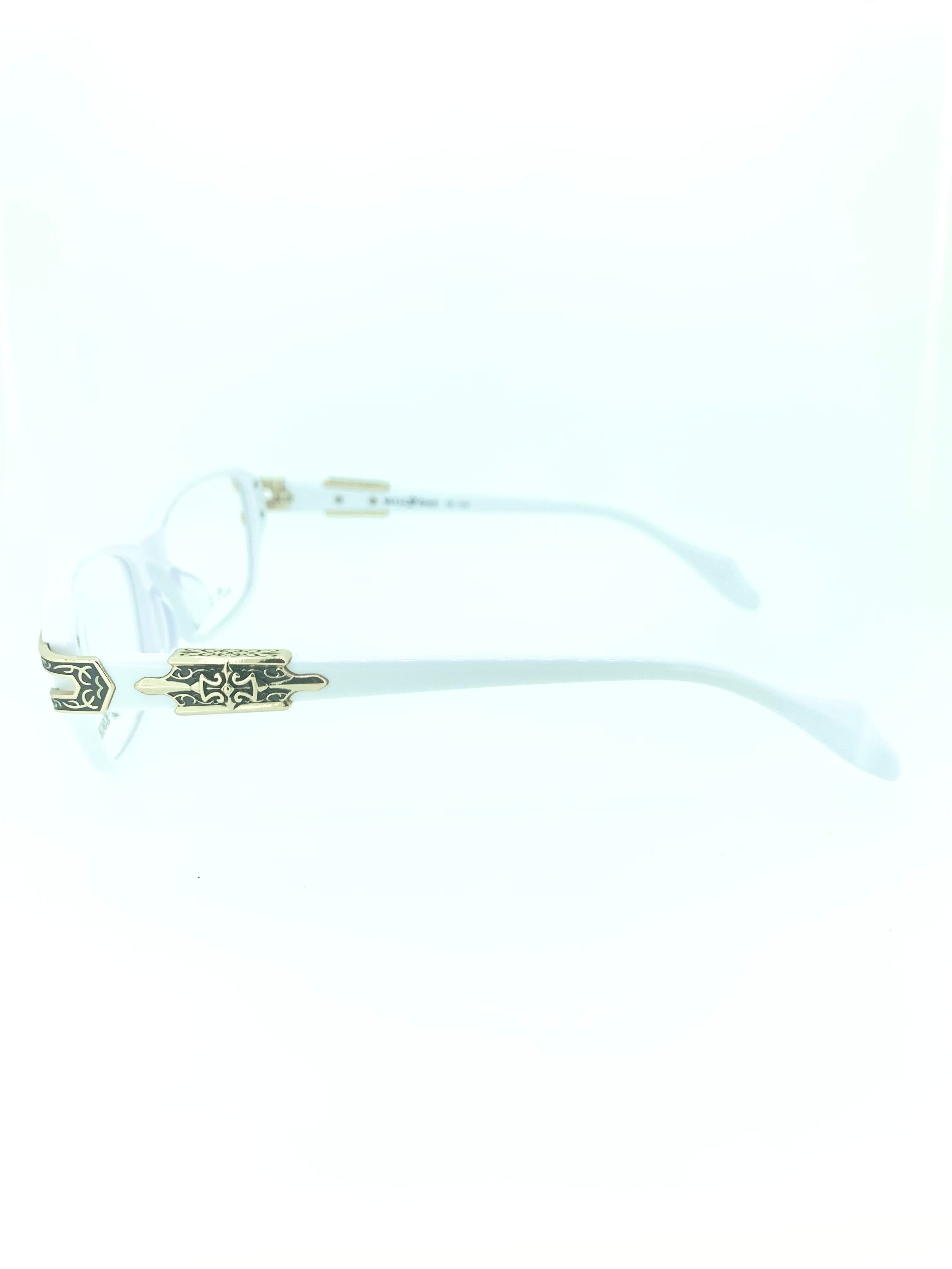 真っ白で清潔感のあるアセテートのボディに輝く、ゴールドのメタルモチーフがおしゃれな作品。クロスのマークで西洋風の雰囲気とホワイトカラーが、聖騎士のような清廉な力強さを連想させる。ほど良い厚みのフレームで、ホワイトカラー初挑戦の方でもかけやすいデザインになっています。
