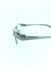 アイアンメタルの質感とスクエアシェイプの堅実な雰囲気がマッチするデザイン。ブリッジは鋭角になっていて、鎧や兜のような雰囲気を感じます。ヨロイ部分も覆いかぶさるようなデザインになっていて、重厚感のあるアーマーのようなフォルムが堪らない作品です。
