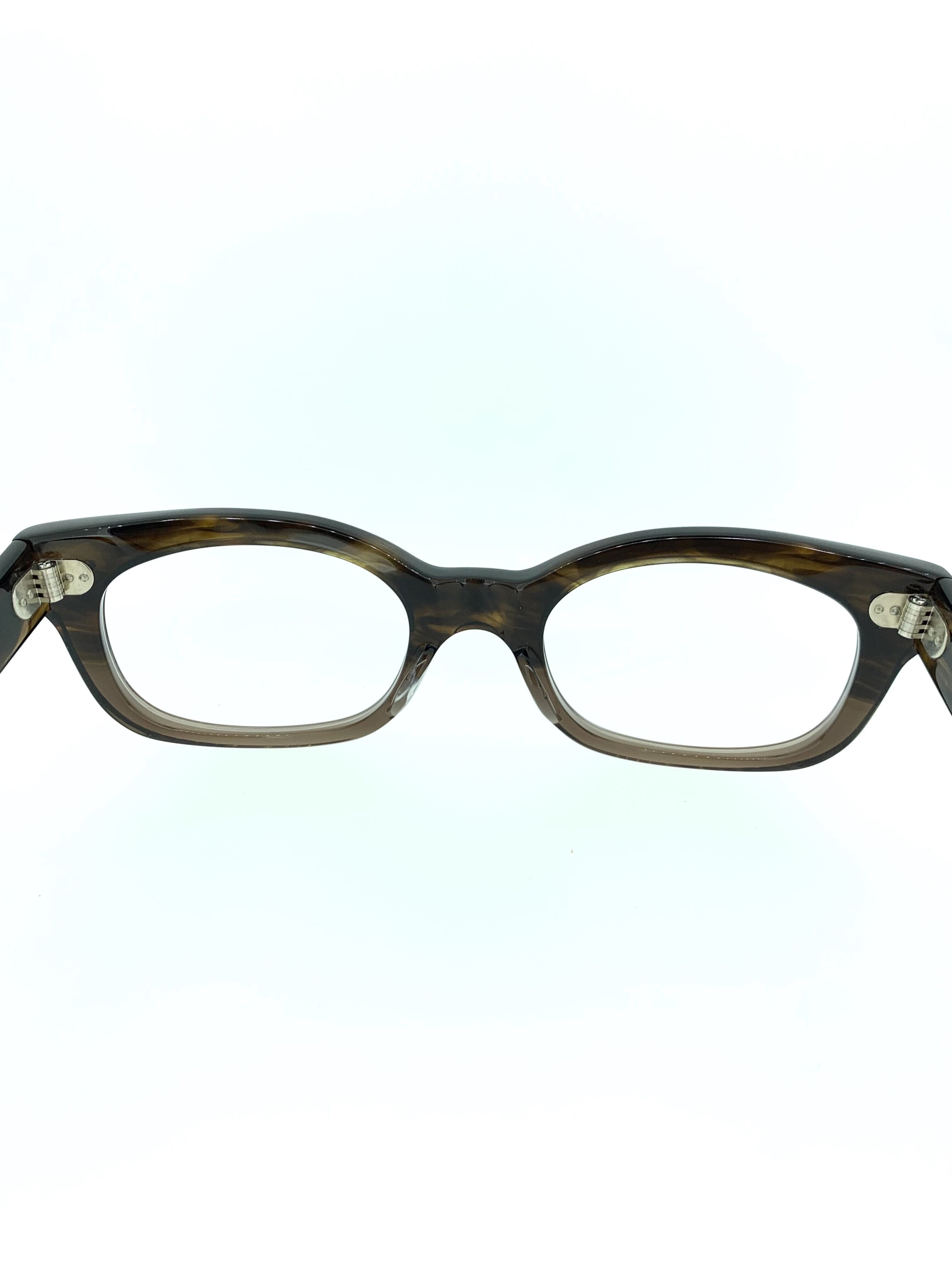 デミ柄ともササ柄とも違う、水に溶ける絵の具のような幻想的な模様が魅力のセルフレーム。角をとった柔らかなウェリントンシェイプにしっかりとしたエッジのヨロイ部分が対照的でお洒落なフロントデザインに仕上がりました。ブリッジの高さは真ん中付近から伸びていて、全体的に横長のスラっとしたスタイリッシュな雰囲気を醸し出しています。ブラウンカラーのセル生地で統一したフレームはコーデを選ばない優秀な1本です。