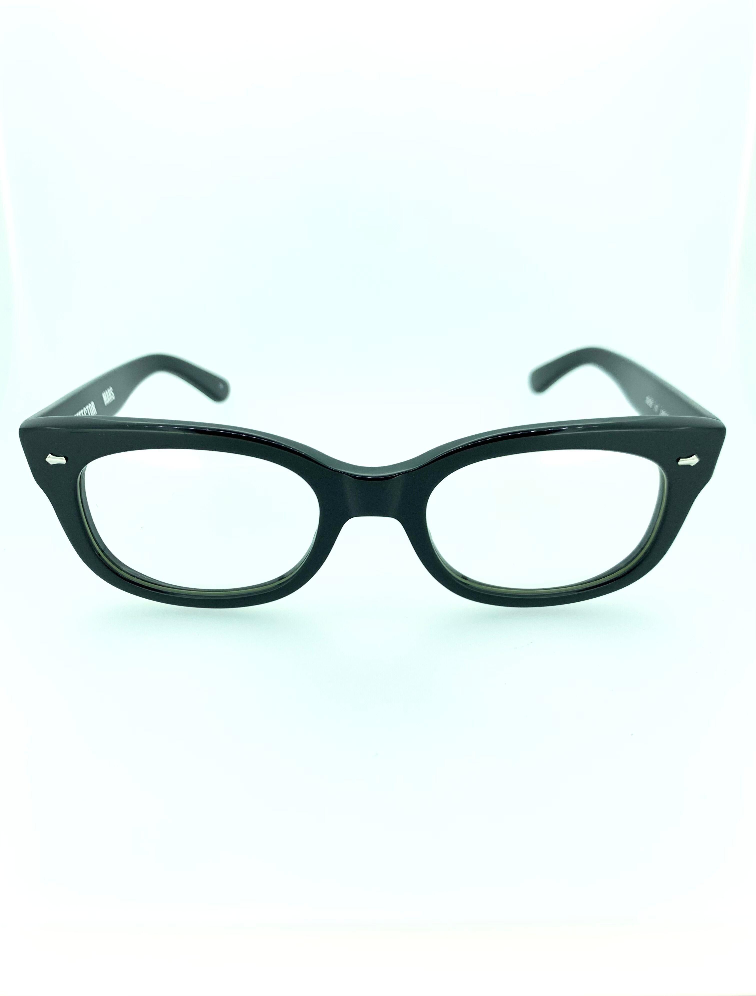 どんなシーンにも合わせやすく安定の人気を誇るポリッシュブラックのセルフレーム。角をとった柔らかなウェリントンシェイプにしっかりとしたエッジのヨロイ部分が対照的でお洒落なフロントデザインに仕上がりました。ブリッジの高さは真ん中付近から伸びていて、全体的に横長のスラっとしたスタイリッシュな雰囲気を醸し出しています。ブラックカラーのセル生地で統一したフレームはコーデを選ばない優秀な1本です。