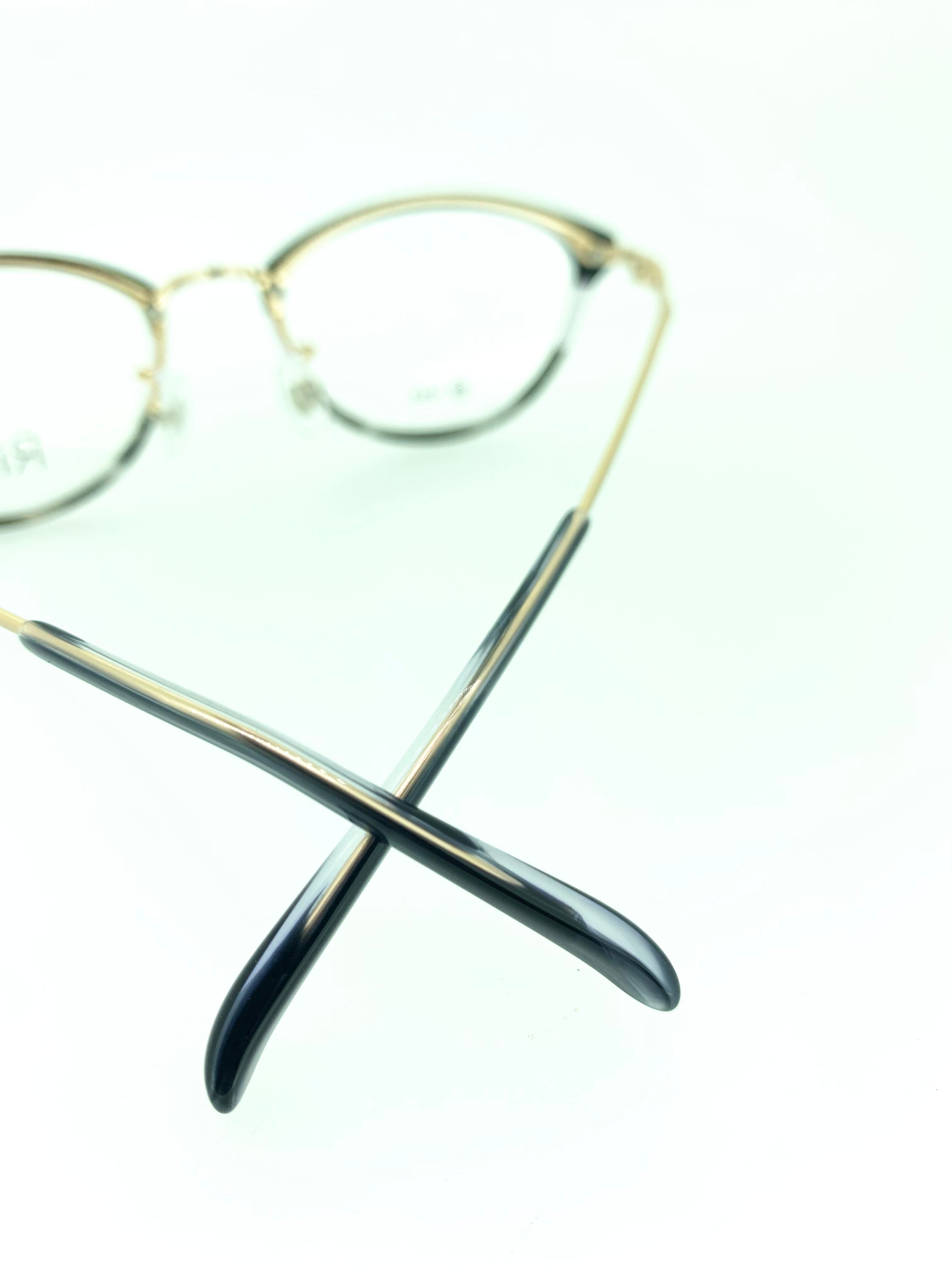 綺麗なアイラインのような天地浅めなボストンシェイプが特徴的なコンビネーションフレーム。セルリムはグレー系ササ柄×ブラックのバイカラーになっていて、派手過ぎないシックな作品となっています。内面から見ると上部リムに沿うようにメタルフレームが重なっていて、細部まで計算された高級感のあるデザインにまとめています。全体のシルエットを細身でまとめているため大人っぽいスタイリッシュな1本に仕上がりました。