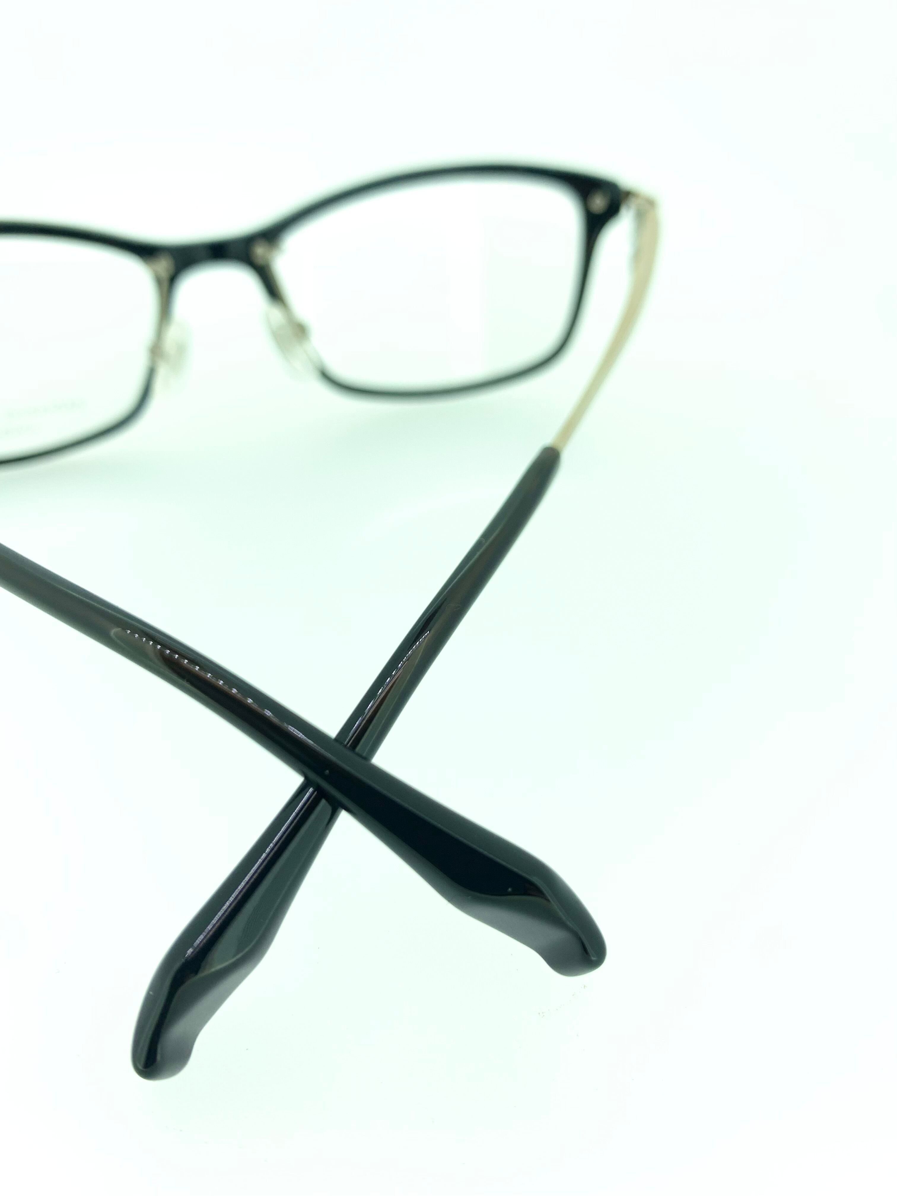 ポリッシュブラックのセルフロントにハッキリとしたウエリントンシェイプがスタイリッシュなコンビネーションフレーム。目尻にかけてワイドになる上部リムのラインがキリッとした印象になっていて特徴的です。真鍮のように光沢を抑えたテンプルメタルの質感が上品な高級感を生み出したお洒落な作品となっています。