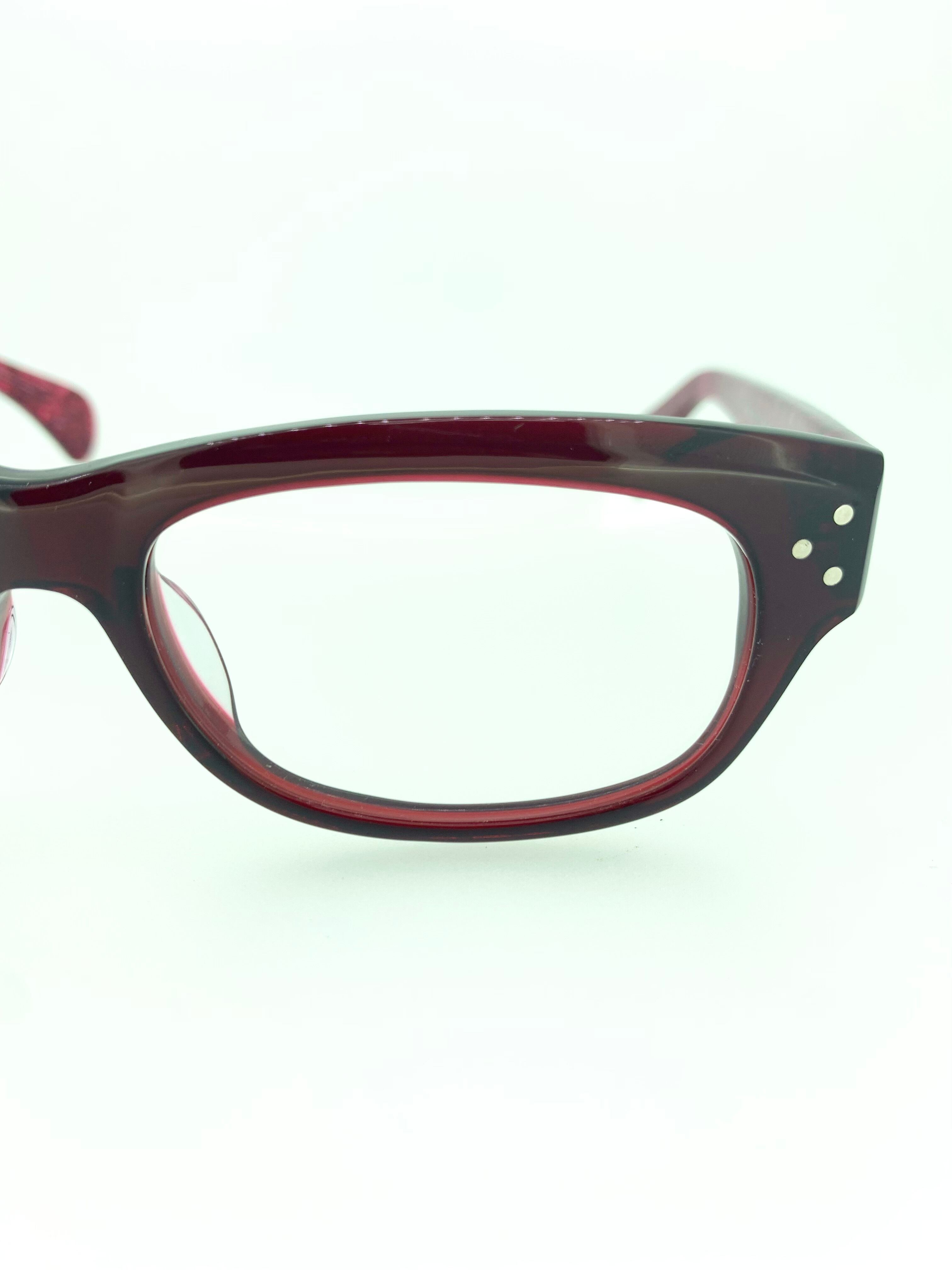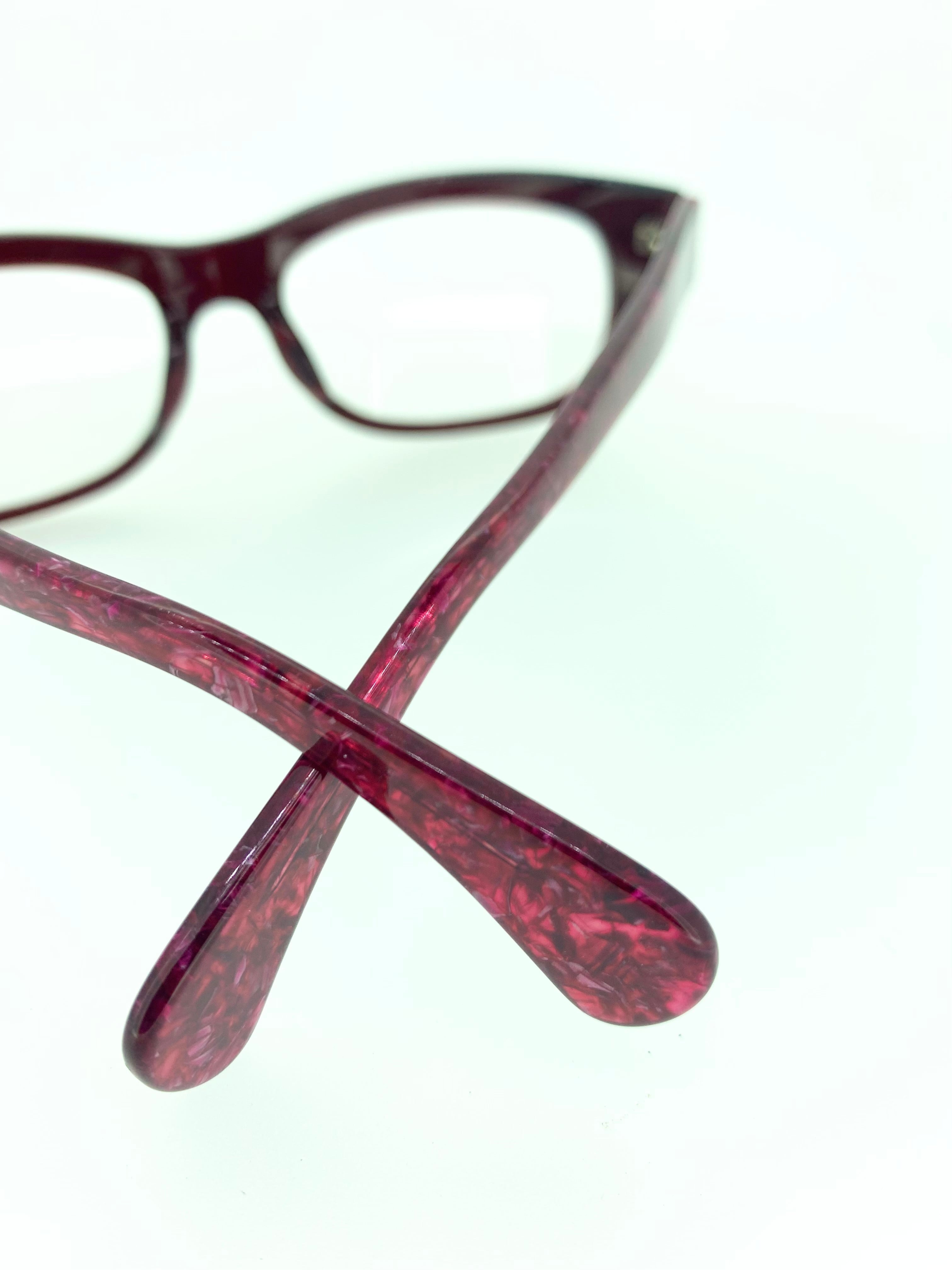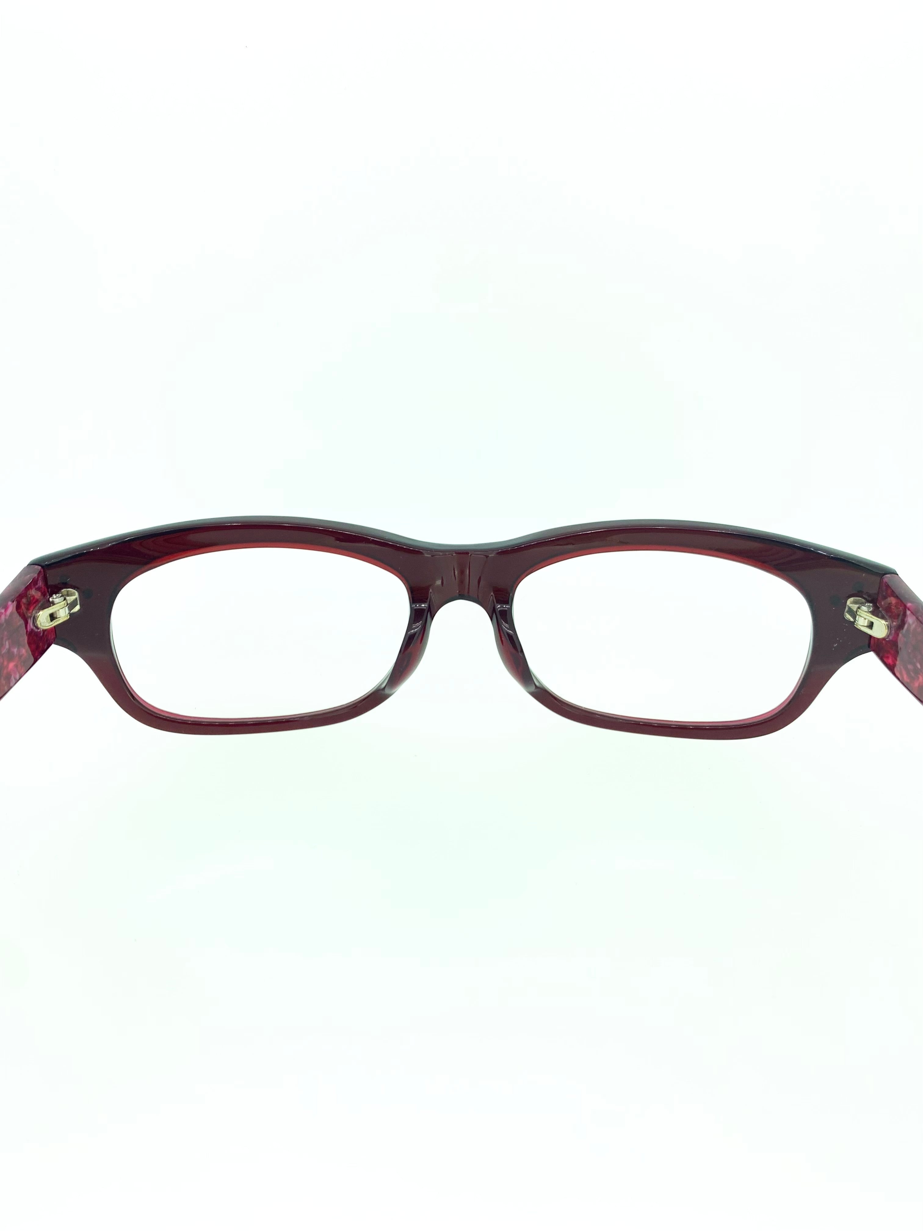 天地狭めなウェリントンシェイプにシックなボルドーカラーのフロントが映えるセルフレーム。鉱石の断層のように煌びやかなマゼンタカラーのセルテンプルは、シックなフロントとのコントラストが相まって一気に華やかに彩ってくれます。生地の厚みも程よくあり、かけた時に印象に残りやすいお洒落な作品となっています。
