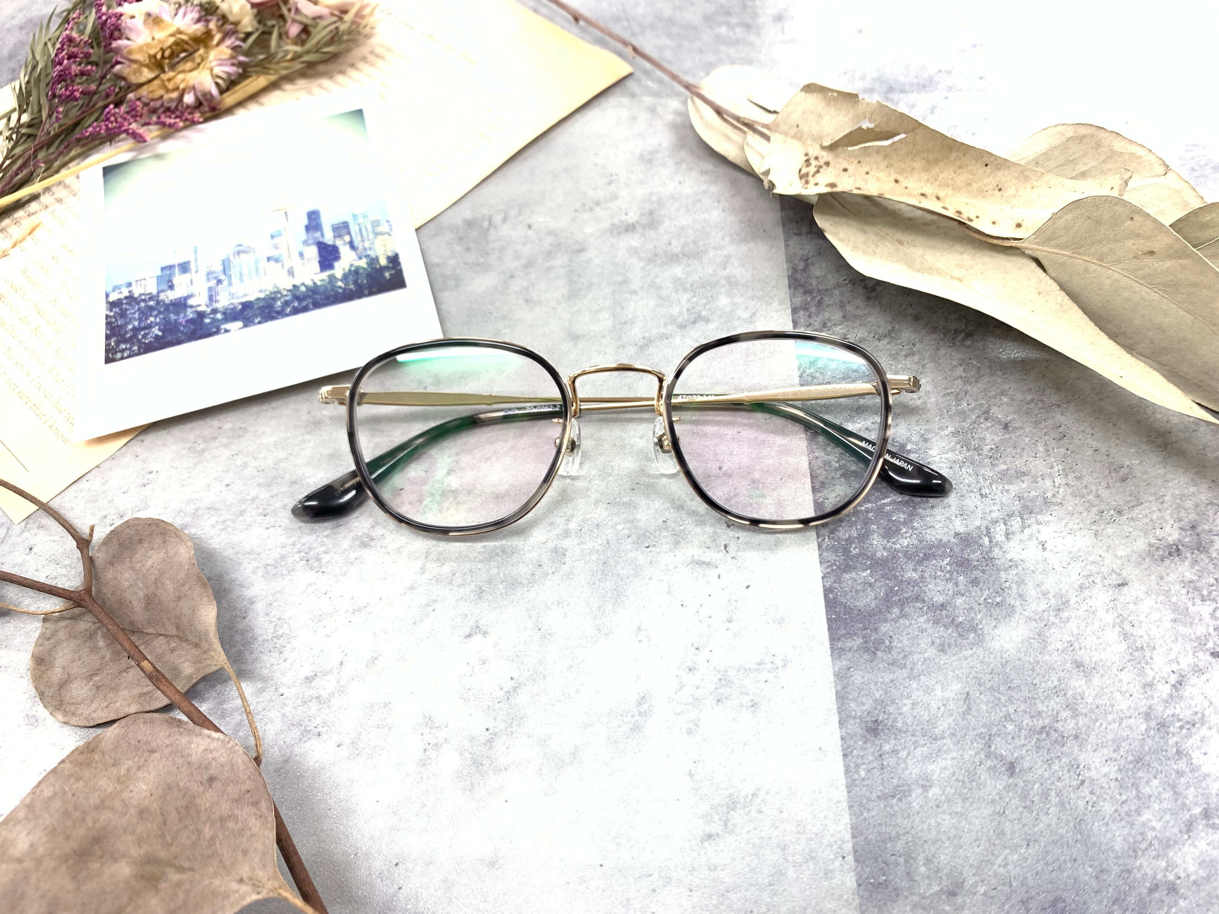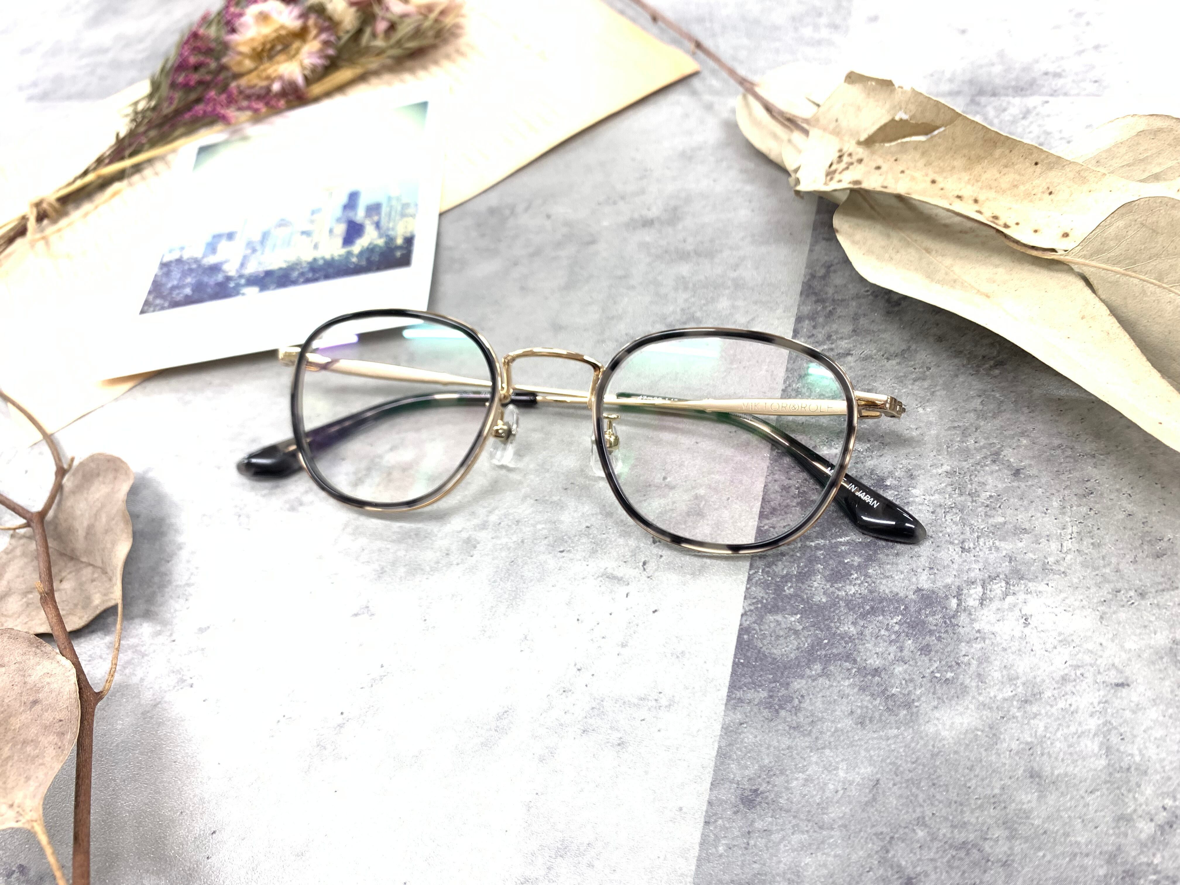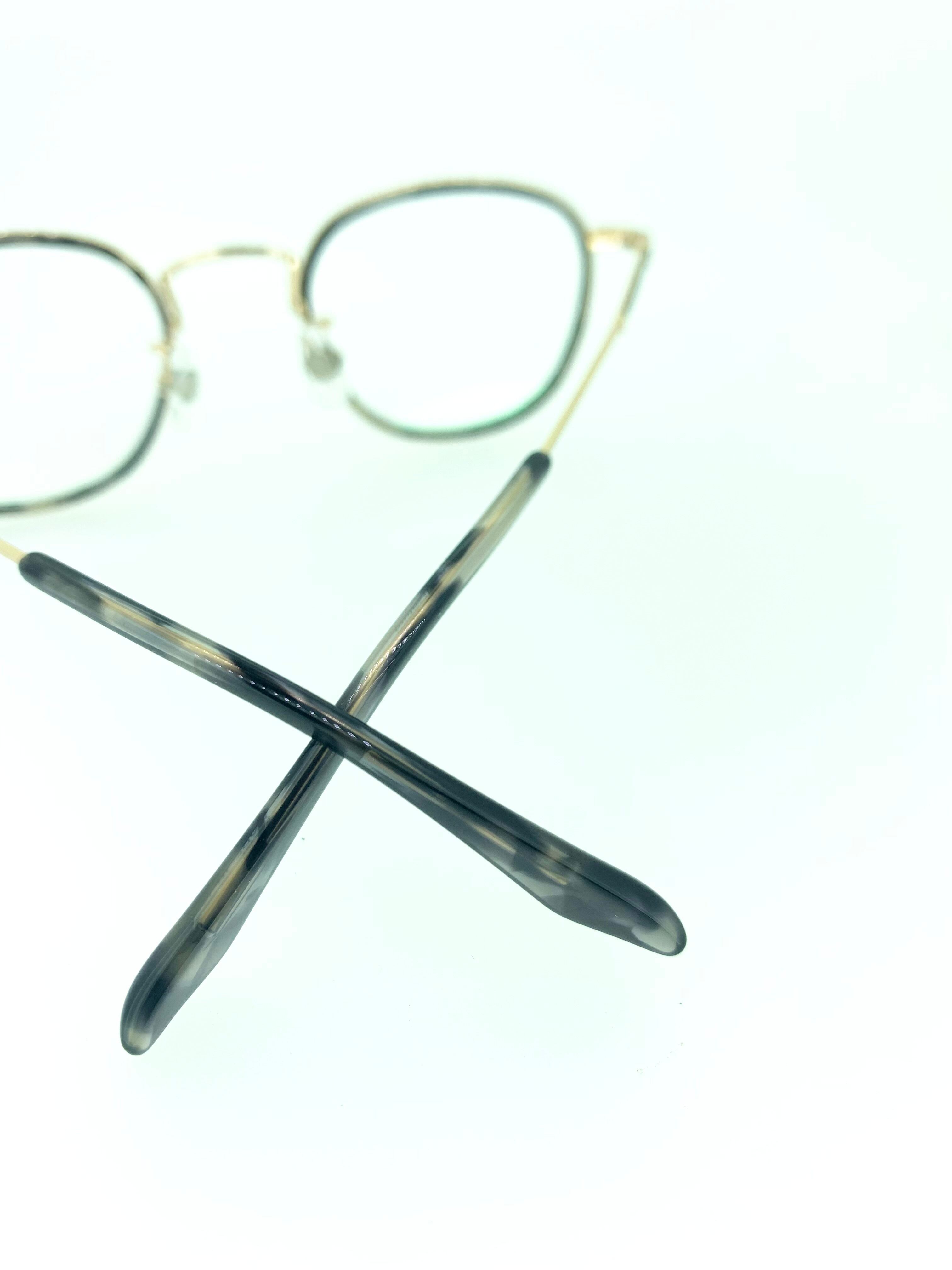 天地幅の少し広くスクエアっぽいコンパクトなウェリントンシェイプが特徴のメタルフレーム。煌びやかなゴールドメタルに大理石のようなブラック調のマーブル柄のセル生地が抜群にお洒落な作品です。クラシックなブリッジデザインや丸みのあるコンパクトなセルワッパに他には無い魅力を感じる1本です。