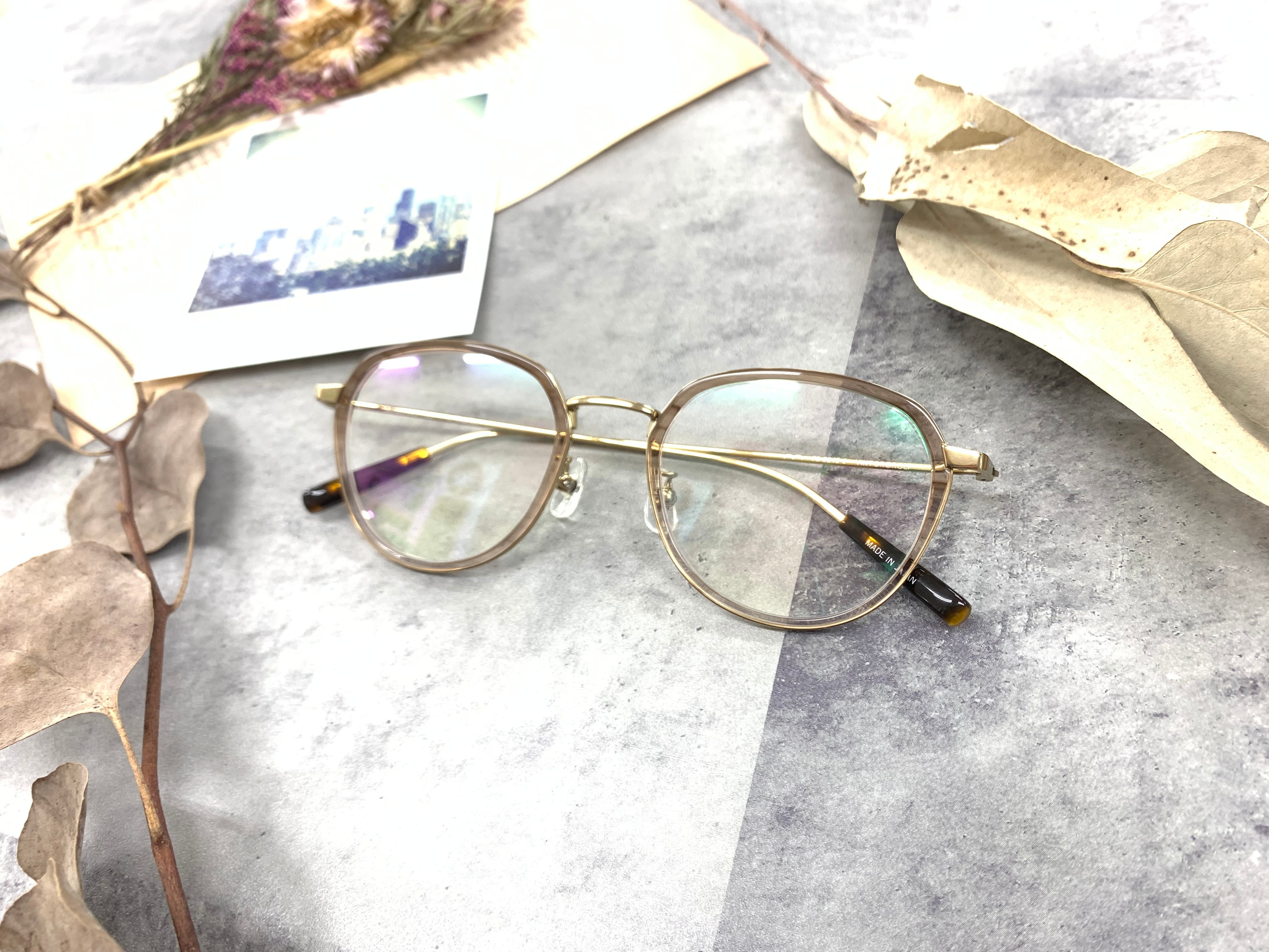 ベージュカラーのグラデーションが落ち着いた雰囲気のメタルフレーム。クラウンパントシェイプにセルワッパという組み合わせが珍しい個性的なデザインも、その上品なカラーリングで綺麗めにまとめられ作品となっています。個性がぶつかり合わずに絶妙に調和したお洒落な1本に仕上がりました。